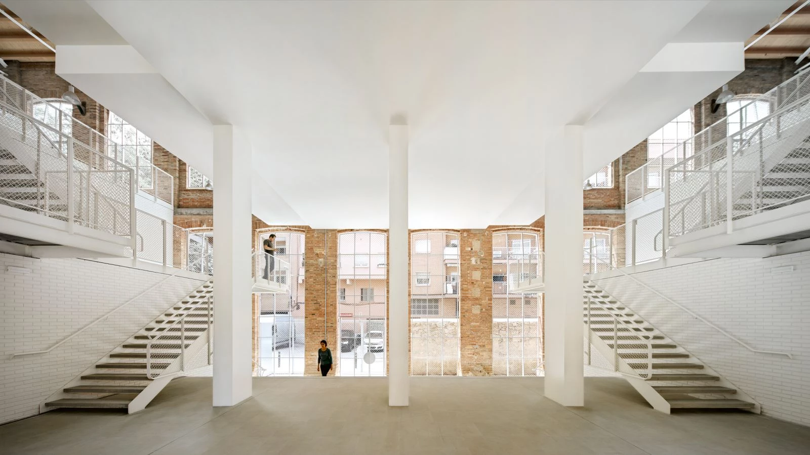 The two interior floors are reused structurally, with no type of reinforcement, to allow resting the two new levels on each one of them, because the two floors in the old warehouse are transformed into four floors of housing. To achieve this a wood structure is used, five times lighter than a steel one to avoid exceeding the 1,000 kg/m² load-bearing capacity of the original warehouse. The frame timber structure is based on the old steel structures used to shelve thread.
