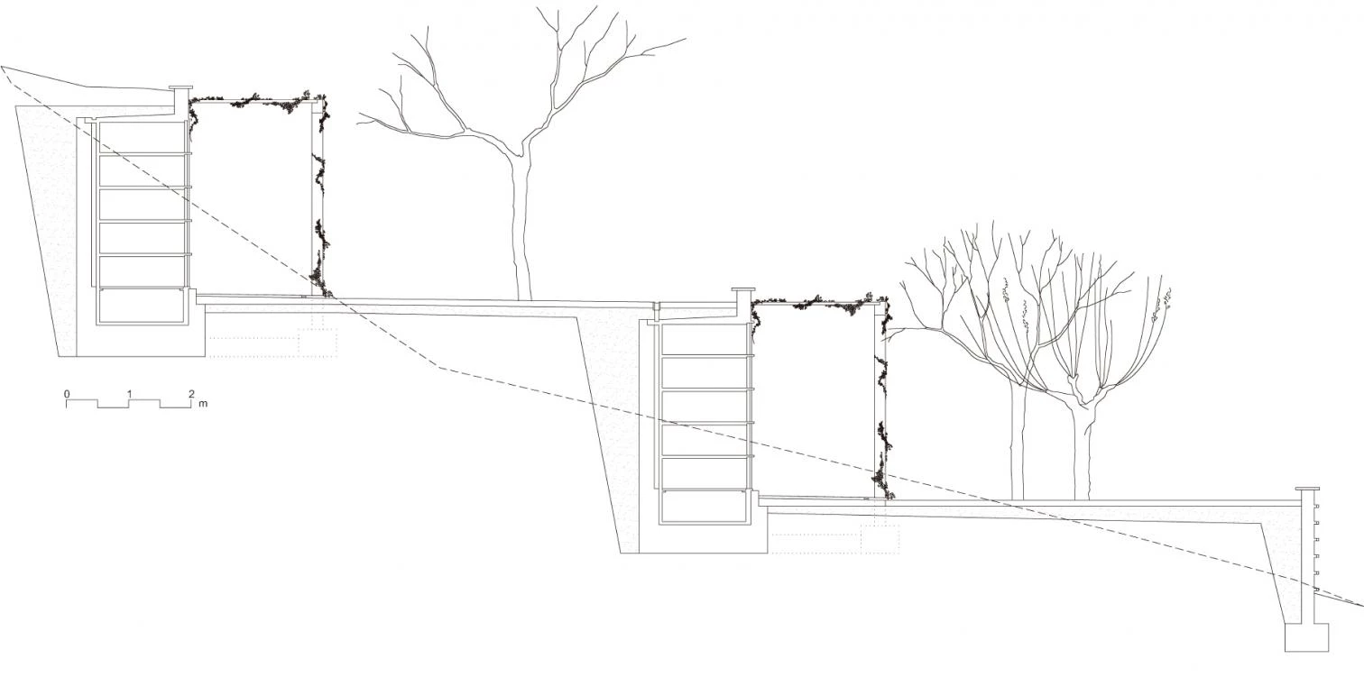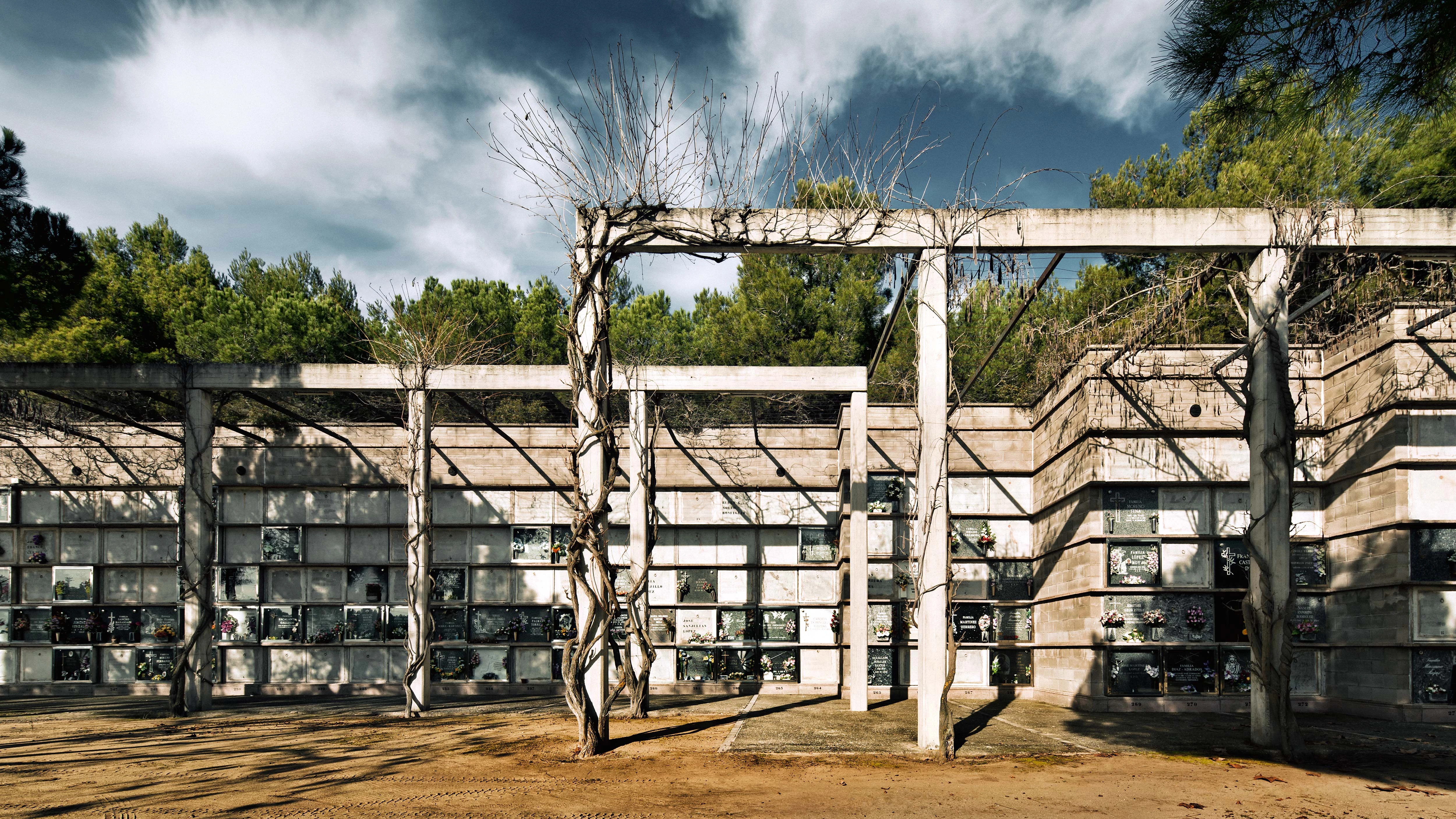 Located at the foot of Collserola, right where the mountain range meets the Rubí stream, the cemetery is conceived from the beginning as a group of terraced gardens scattered over the wooded hillsides. In this way, the recessed niches are designed as retaining walls attached to the slopes to form terraces, adapted to the topography of the place by means of a versatile geometry at ground level, and that in section forms groups of two or three heights depending on the slope. Across from these walls with the niches, a pergola covered with ivy, jasmine, and wisteria plants creates a more private and shaded enclosure while at the same time contributing to an overall language for the whole. The rest of the terrace, conceived as a garden, is planted with local species such as oak or pine trees, to extend and blend with the surrounding woods, adding typically Mediterranean garden trees such as palms, planes, cedars, and so on. The groups of niches are connected to one another by a path that stretches over the trace of the old tracks and goes around the whole property, offering visitors all the possible points of view over the surrounding landscape and with this, a broad geographical knowledge of the place.