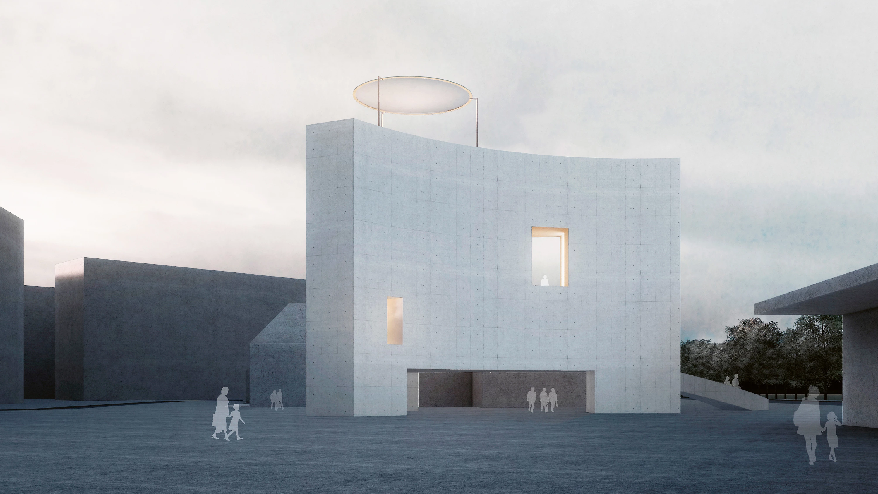 The geometry addresses the adjoining urban spaces and its curves redefine the different uses of the square. In the section, the concert hall and a meditation room are superposed, connected by tubes to send sound from one to the other.