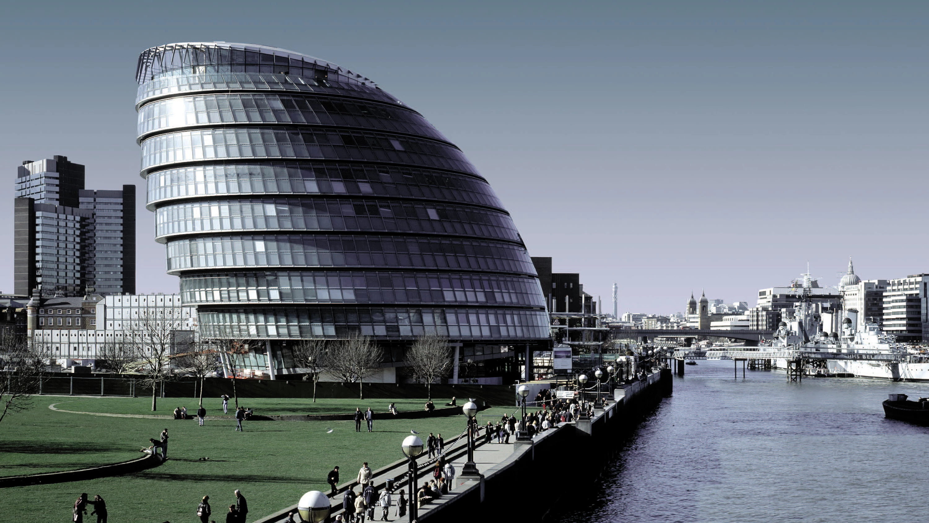 En un lugar prominente a orillas del Támesis, junto al Puente de Londres, se alza, exenta, la burbuja achatada que alberga las dependencias más representativas de la GLA: la cámara de la asamblea, los despachos del alcalde —la figura recientemente restituida del Lord Mayor of London—, de su gabinete y de los concejales, además de las salas de reuniones de la corporación municipal y diversos servicios para los ciudadanos; en total, 18.000 metros cuadrados repartidos en diez plantas, con una altura total de 45 metros.