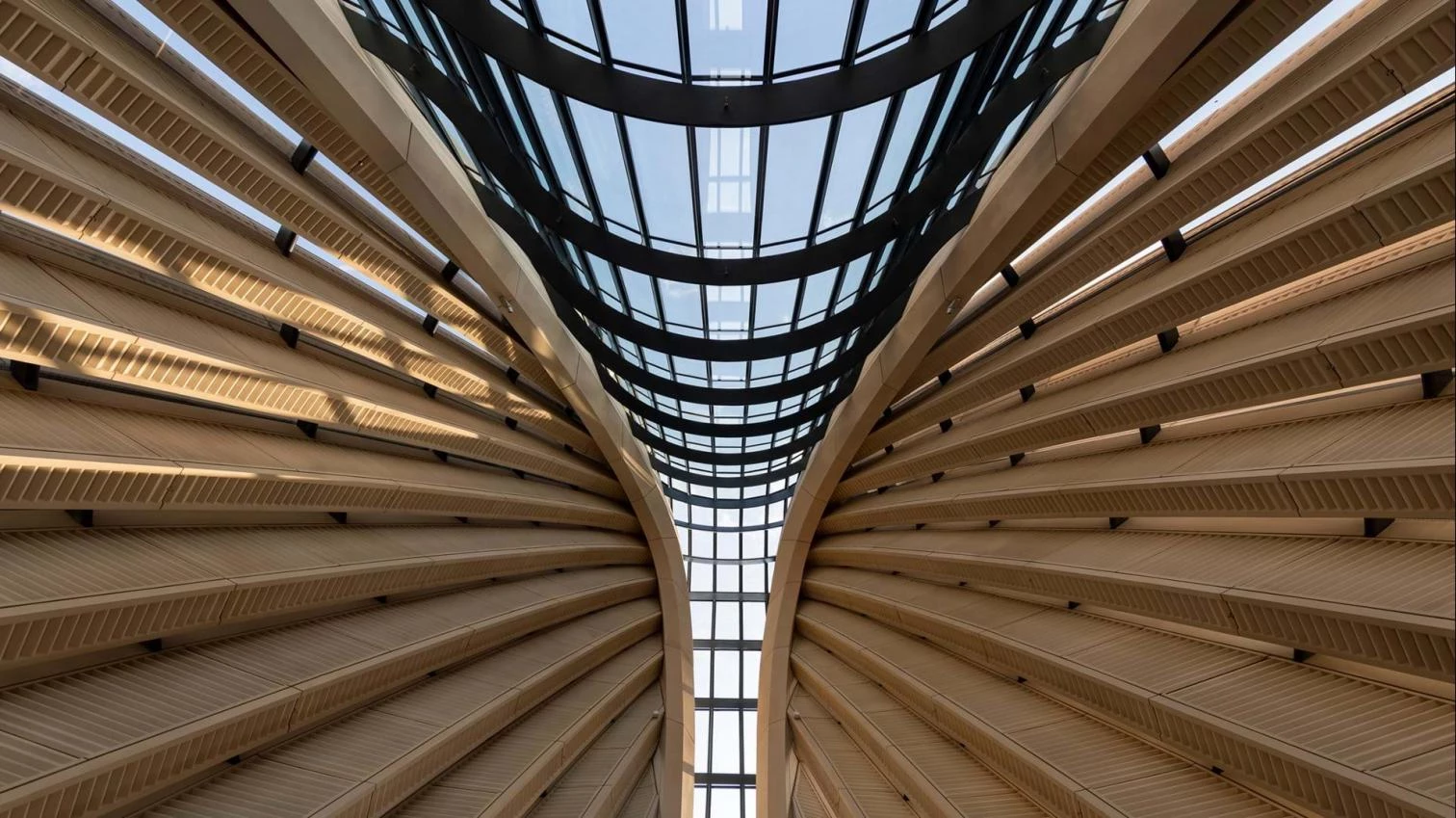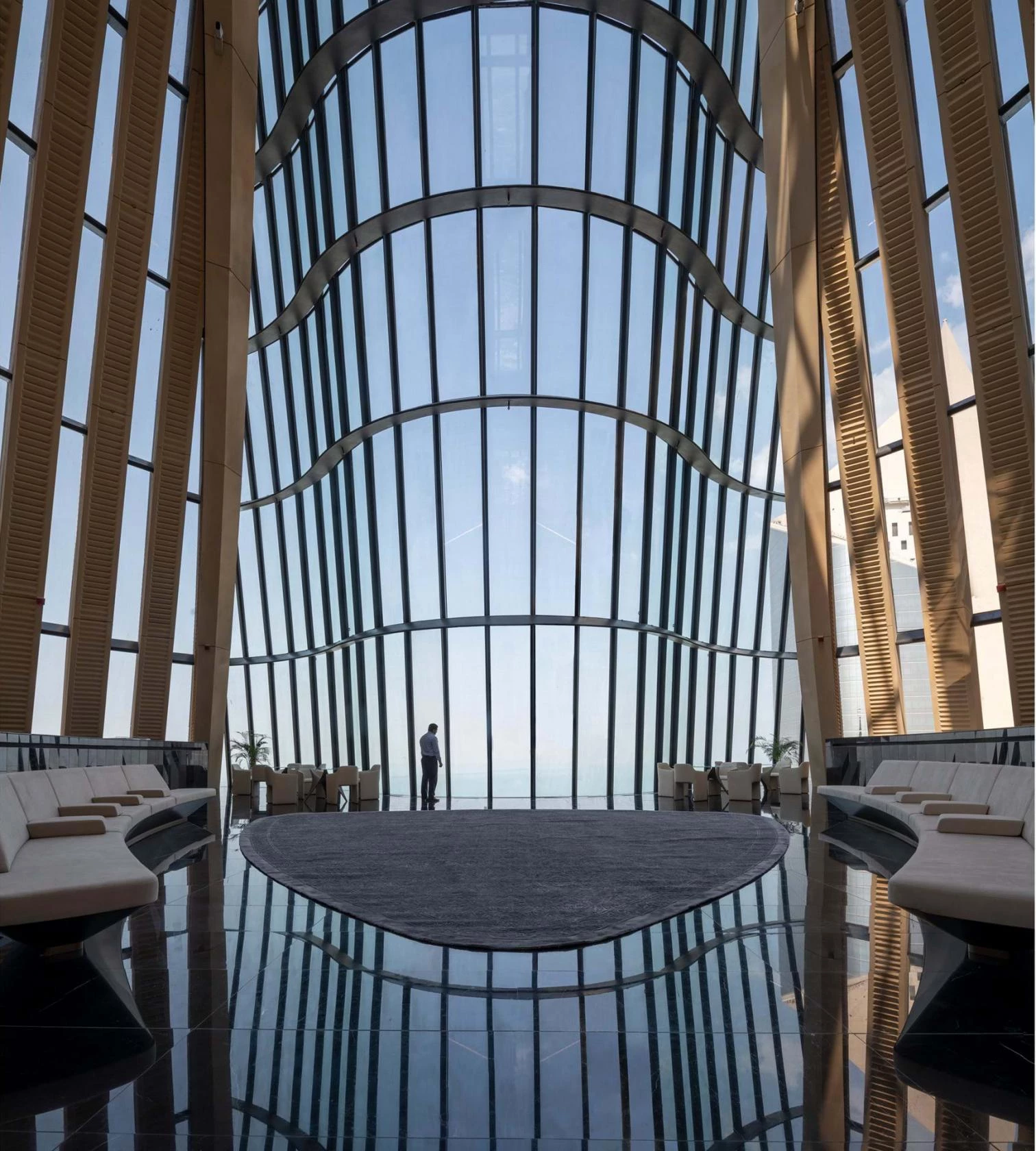 In Sharq, the financial district of the city of Kuwait, this 300-meter-tall skyscraper by Foster+Partners uses passive and active measures to keep its water and energy consumption low. Through a combination of structural innovation and energy efficiency the design protects the work spaces against the soaring temperatures characteristic of this Arab country’s extreme climate. The cylindrical form, tapered on top, opens like a shell northward to offer views of the Gulf, while to the south it presents concrete fins that emphasize the vertical form of the office tower.