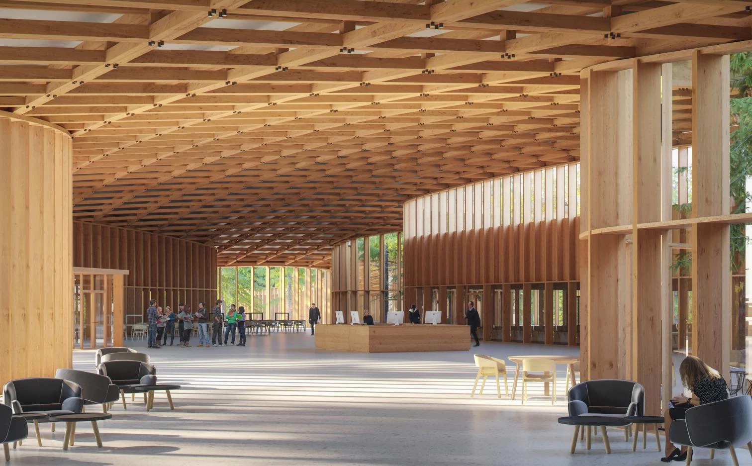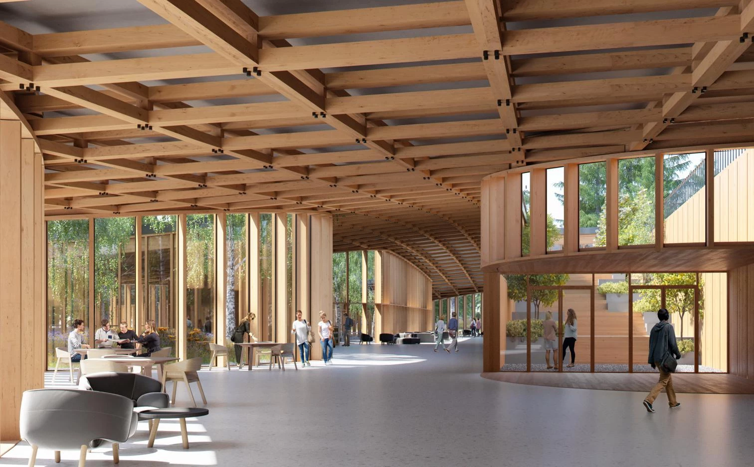 Lecture halls, auditoriums, a library, and apartments are laid out under a single wooden roof. The main building, named ‘Aogra Senezh,’ interconnects all the spaces, encouraging encounters among students, teachers, staff, and guests. The complex expands towards a park, merging the architecture with the natural landscape. The extensive park zone offers a wide range of outdoor activities, from biking lanes and hiking trails to sports courts, a cinema, and a concert venue.