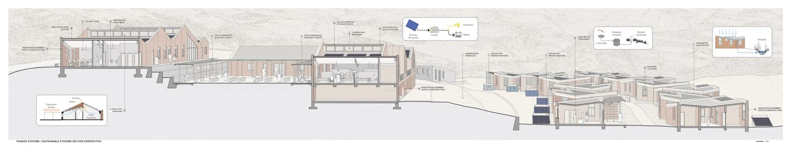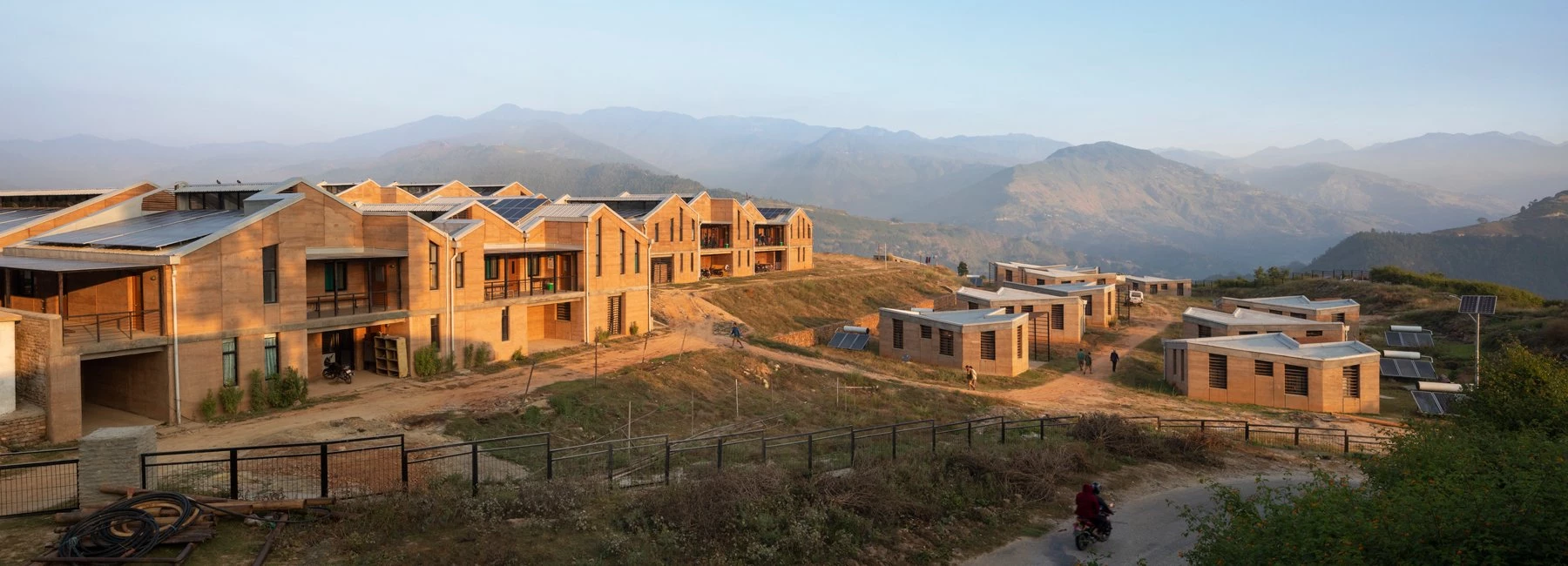The language of the project is determined by the material quality of rammed earth, mixed with 6% cement for more stability, durability, and seismic resistance. The reusable plastic formwork accelerated construction time and allowed employing untrained workers from Achham. Local stone is used for the foundations, retaining walls, and paths. Some of the furniture, doors, and window louvers were made with wood from the indigenous sal tree. The roofs present solar panels and thermal insulation.