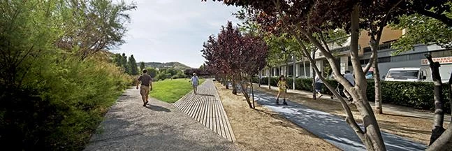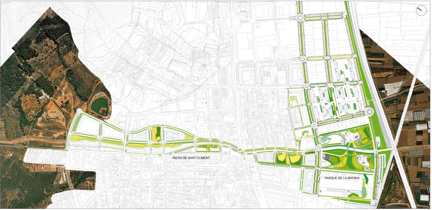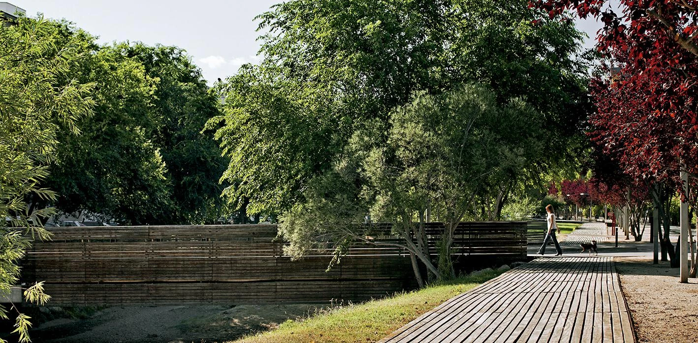 The Sant Climent Riera crosses Viladecans from north to south to end at sea after crossing the Delta del Llobregat Park. With its 2.5 kilometers, it had become a physical frontier for urban growth. The project sought recovering the space as a natural corridor connecting the agricultural park and the mountainside via the city, and turning it into a park filled with local vegetation. The Sant Climent Riera Park is set forth as a sequence of parallel paths, of clearly differentiated materials and with rows of trees of varied species. A large system of footbridges addresses the accessibility of the open spaces resorting to a unitary language in the choice of materials: wood and steel.