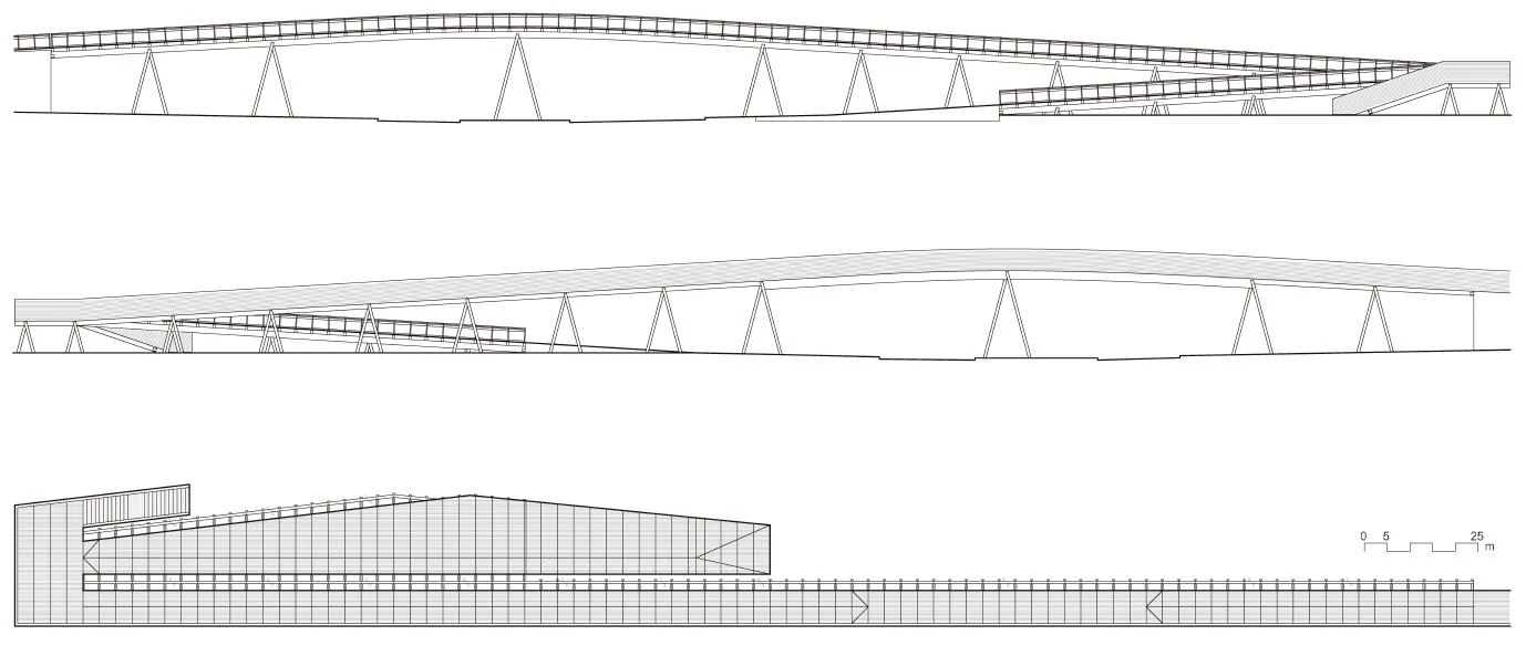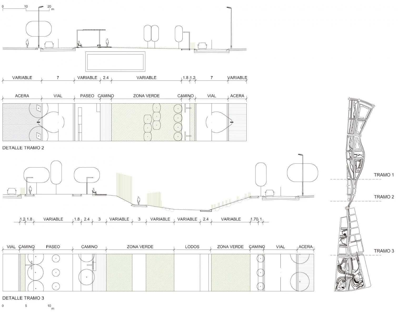 At Marina Park, the final element of the system, the footbridges are even more important. One of them, very large, spans the interruption caused by Siglo XXI Avenue and guarantees accessibility for pedestrians and cyclists. It is here that environmental criteria mark the proposal: the buildable area is denser along the edges of the sector, freeing up a space of 90,000 square meters where the riera finds a natural flooding valve, and the city of Viladecans a green lung and quality public space.