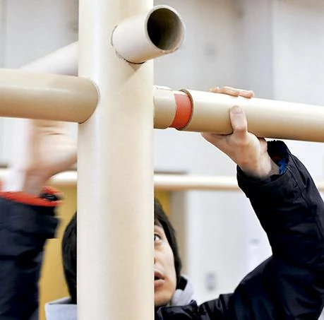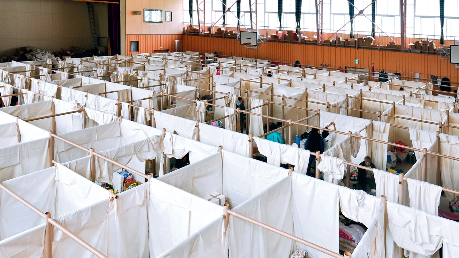 After a natural disaster, and until temporary housing is built, those affected take shelter in public buildings or large facilities like sports centers. To address the problems of lack of privacy and overcrowding that emerge in these situations, the Paper Partition 4 system delimits spaces for each family with paper tube frames and textile divisions. The fourth version of this system – which had already been tested after the Kobe earthquake of 1995, the tsunami of Indonesia of 2004, and the Sichuan earthquake of 2008 – was developed after the devastating earthquake in Japan in 2011, where 1,800 individual units were built in 50 different locations, financed with international donations.