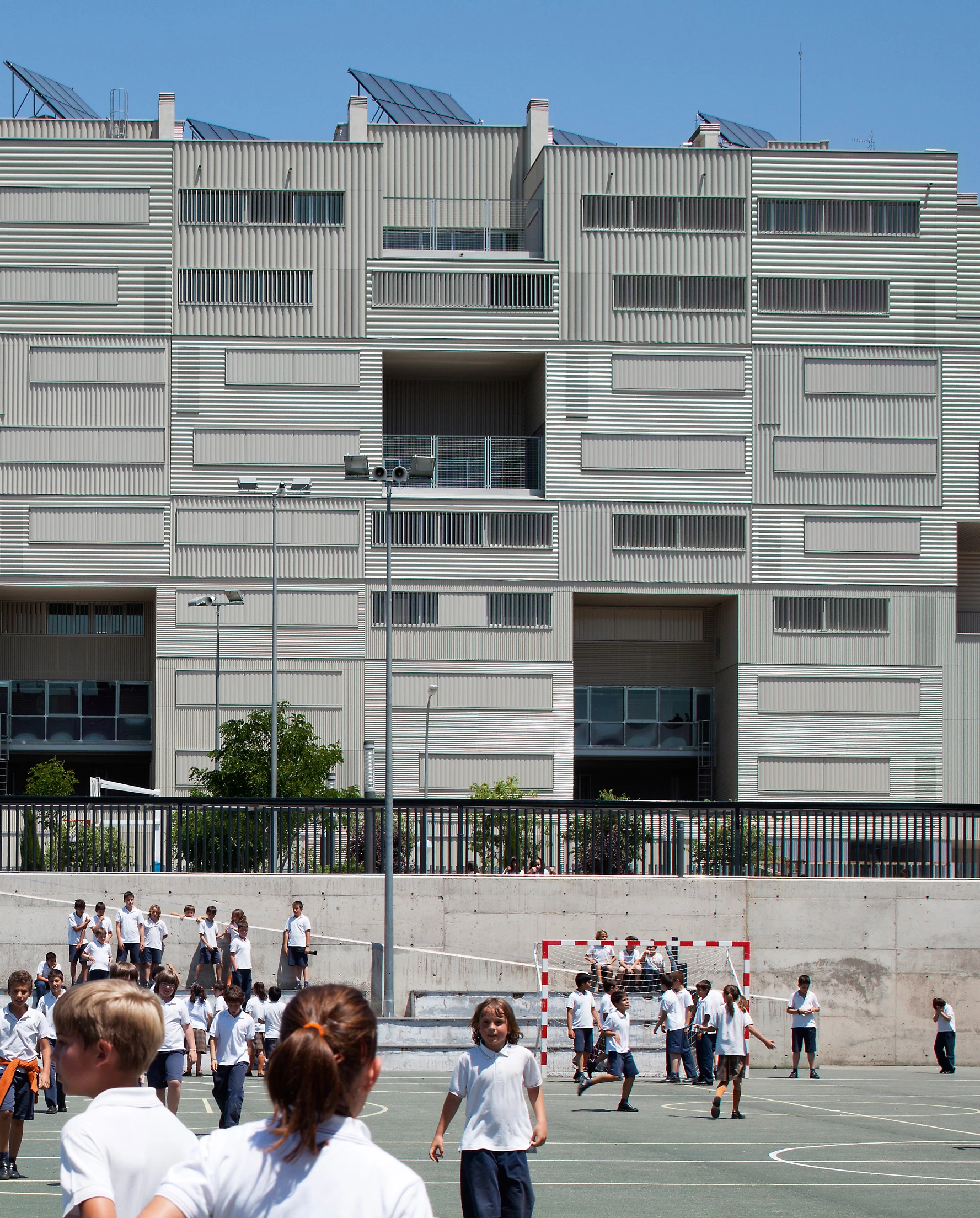 The building’s image stems from the notion of a collective facade that displays the addition of its individual components. Finished with a laconic undulated sheet, the surface waves reveal the arrangement of the different units and make the facades livelier. The use of slats to shelter the windows from the sun is another element that makes the facades vibrate, placed vertically or horizontally depending on the orientation.