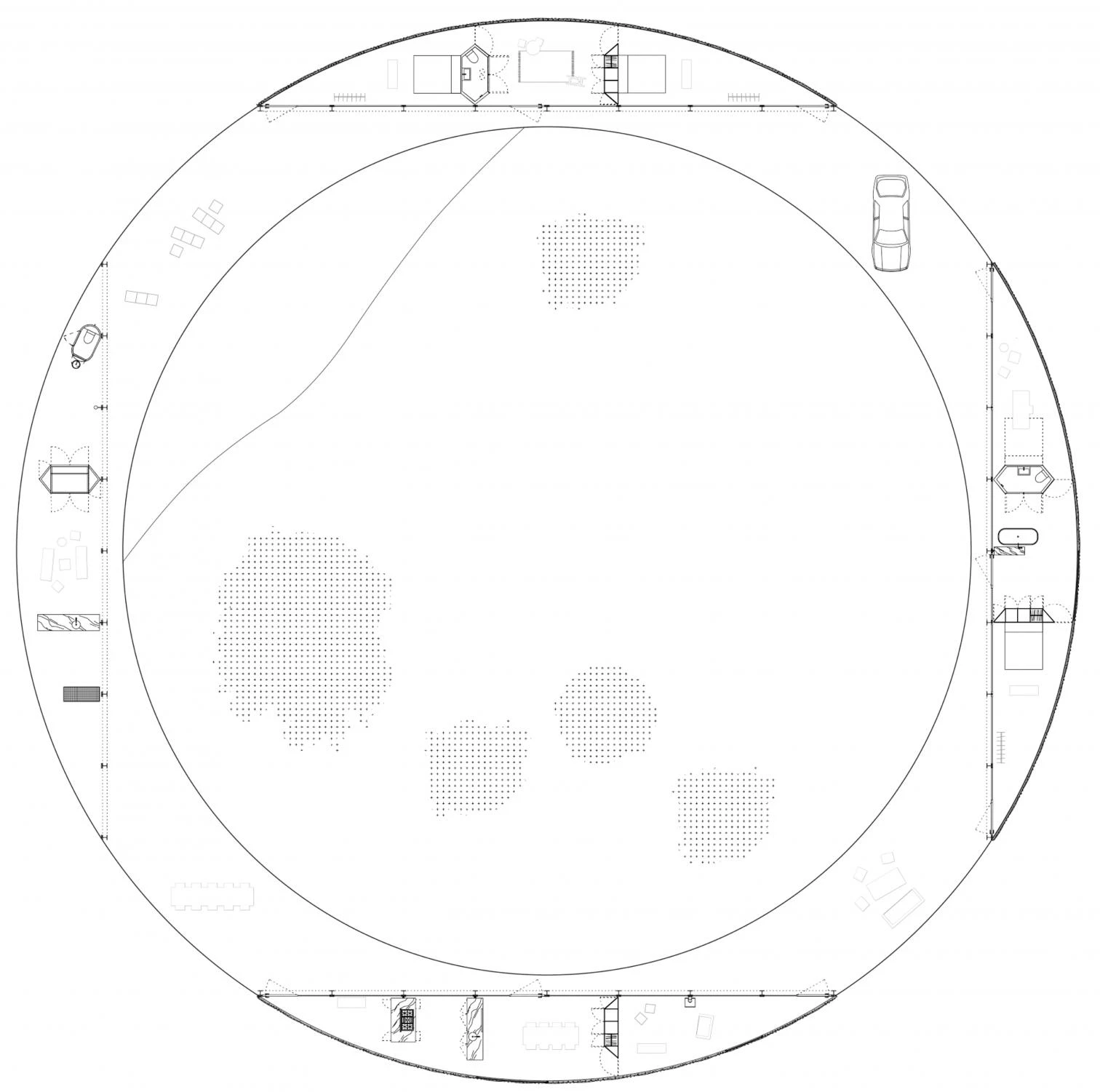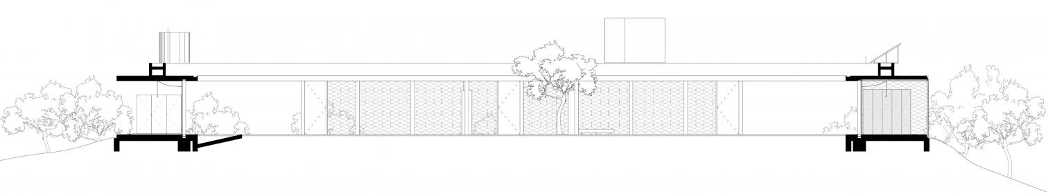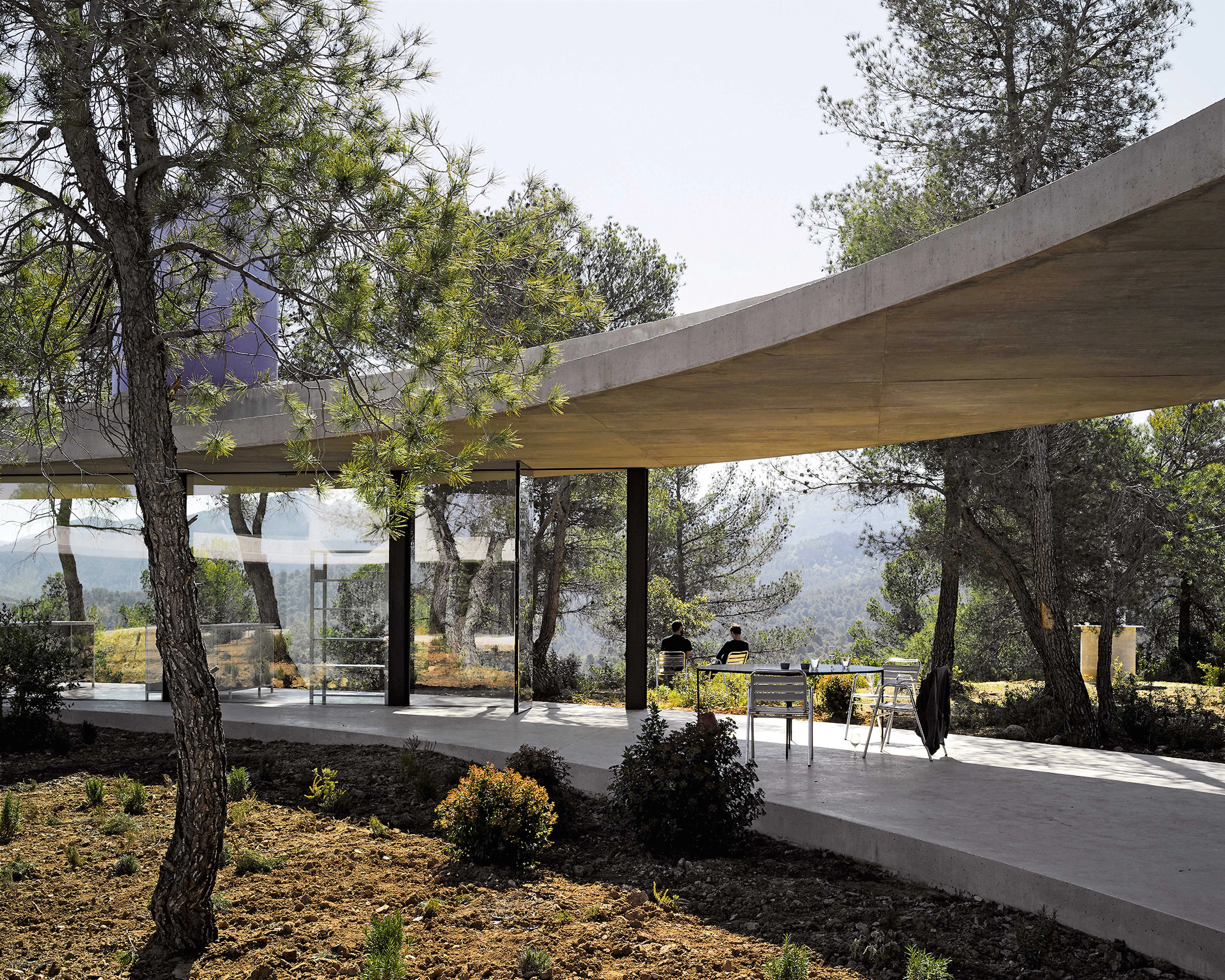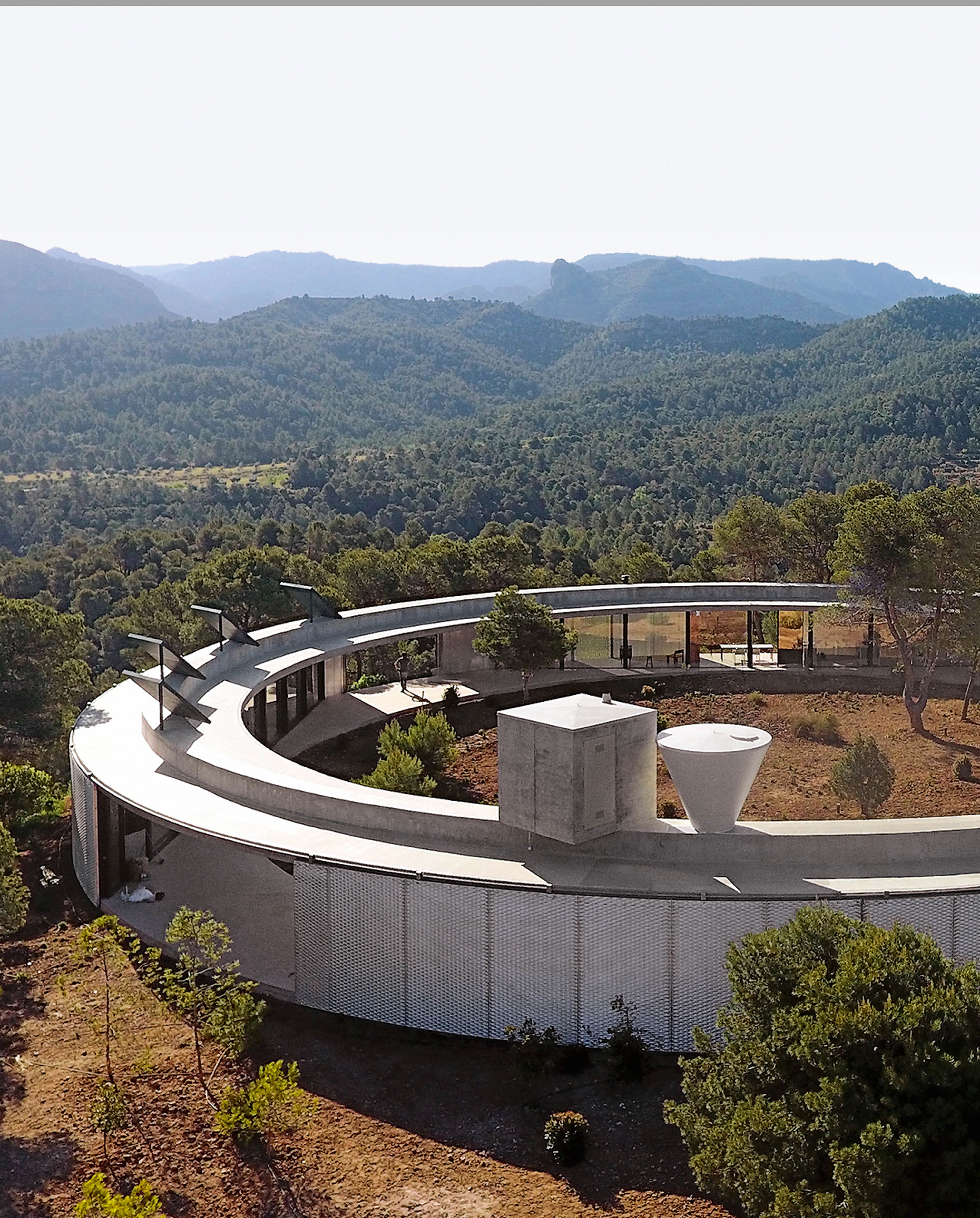 The geometry of this house designed by the Belgian practice of Kersten Geers and David van Severen and located in Matarraña (Teruel) originates from the idea of maximizing enjoyment of the surrounding natural landscape through a panoptic, 360º view. The building is therefore a circle with a diameter of 45 meters, and is like a flying saucer that has just landed on virgin soil of a hillock, creating a clearing of rigorous geometry in a Mediterranean forest. The total built area is 450 square meters, but only a small part of that is taken up by actual enclosed, inhabitable spaces: three rooms on three cardinal points of the circle, whose opaque outer walls follow the circumference while the permeable inner walls are chords of the circle. The rest of the area of this house which is self-sufficient in energy terms works like a well shaded, well ventilated pergola that responds to the beckoning of the landscape around, and in a way makes true the Mediterranean utopia of life lived in the outdoors.