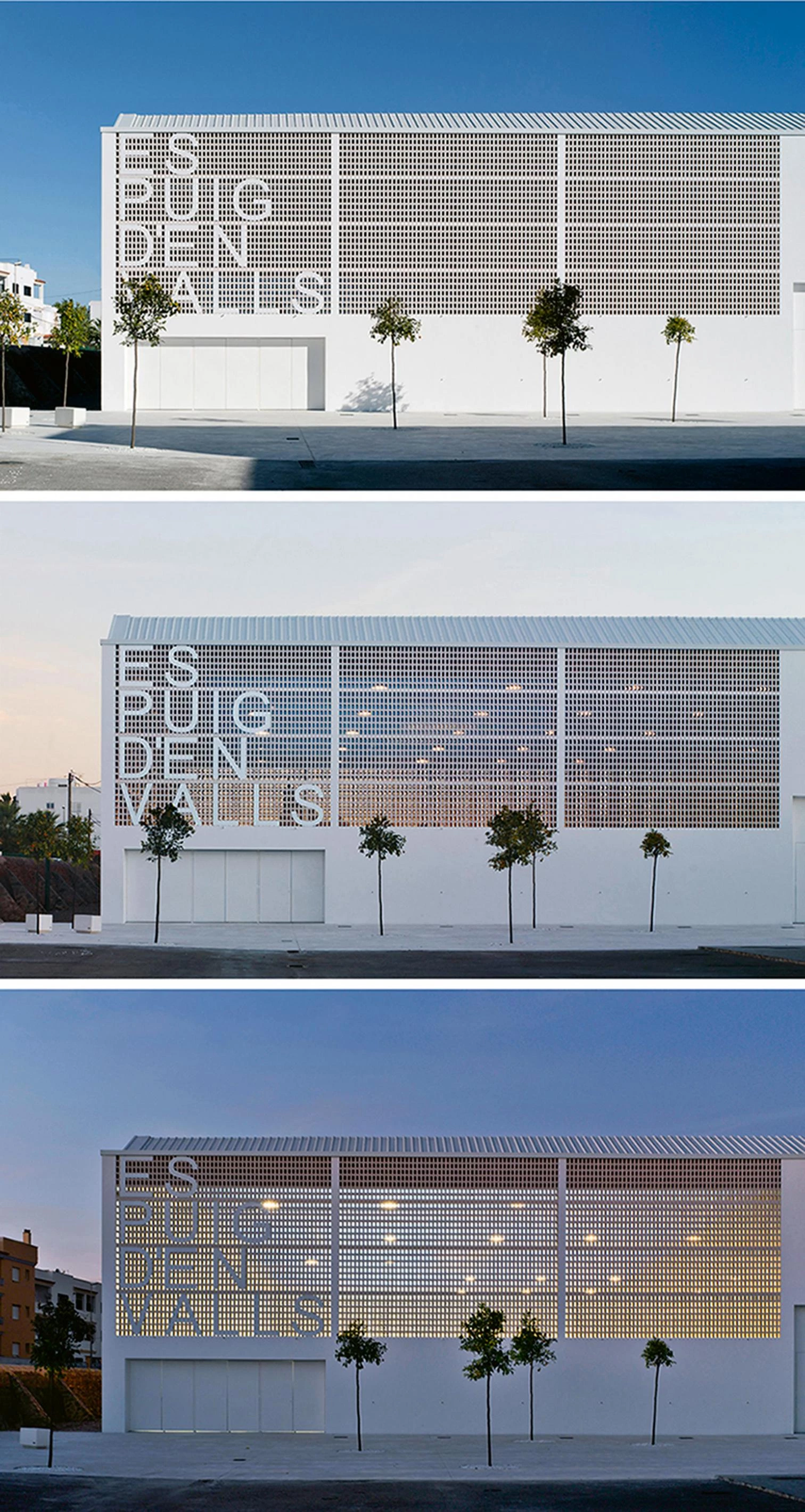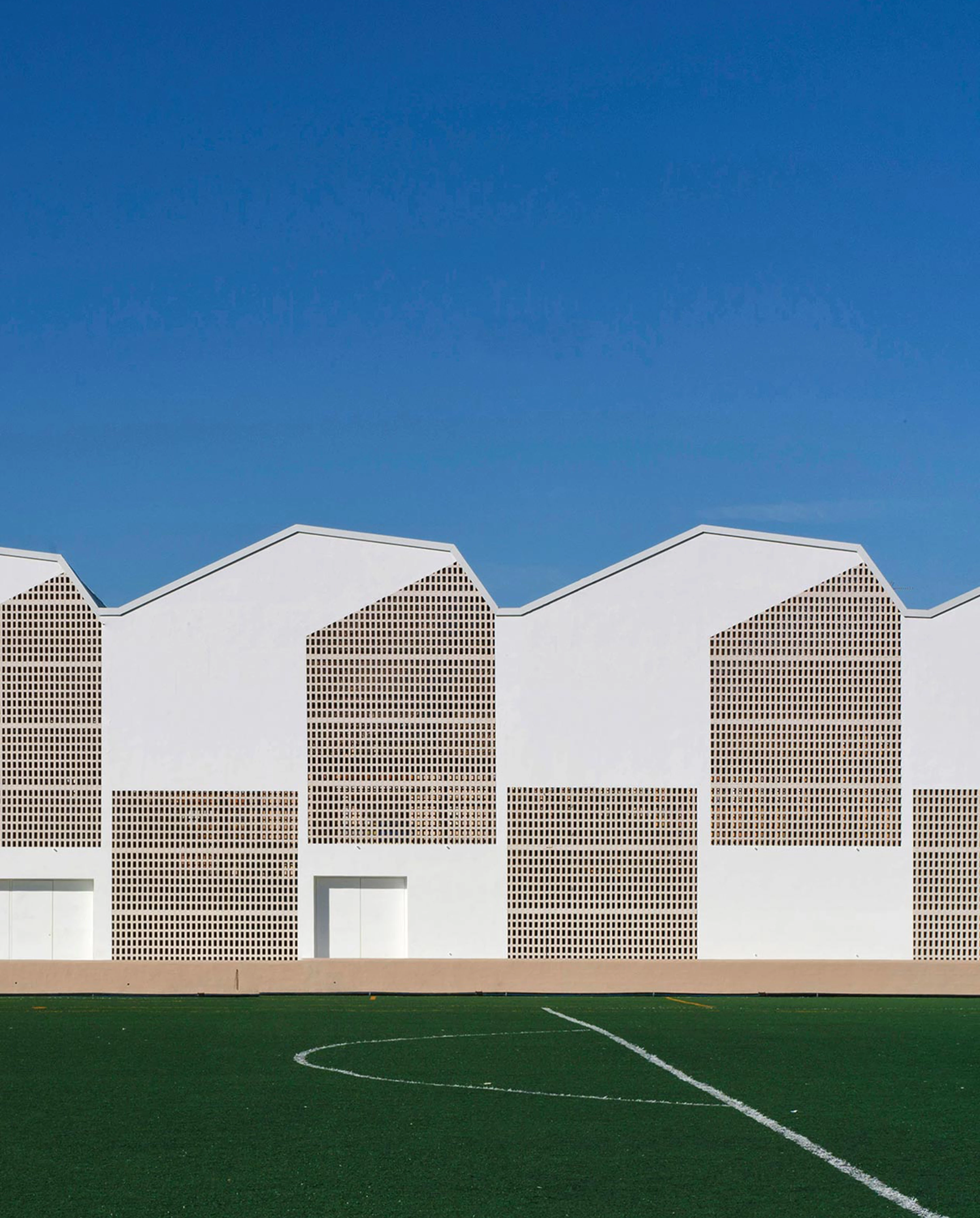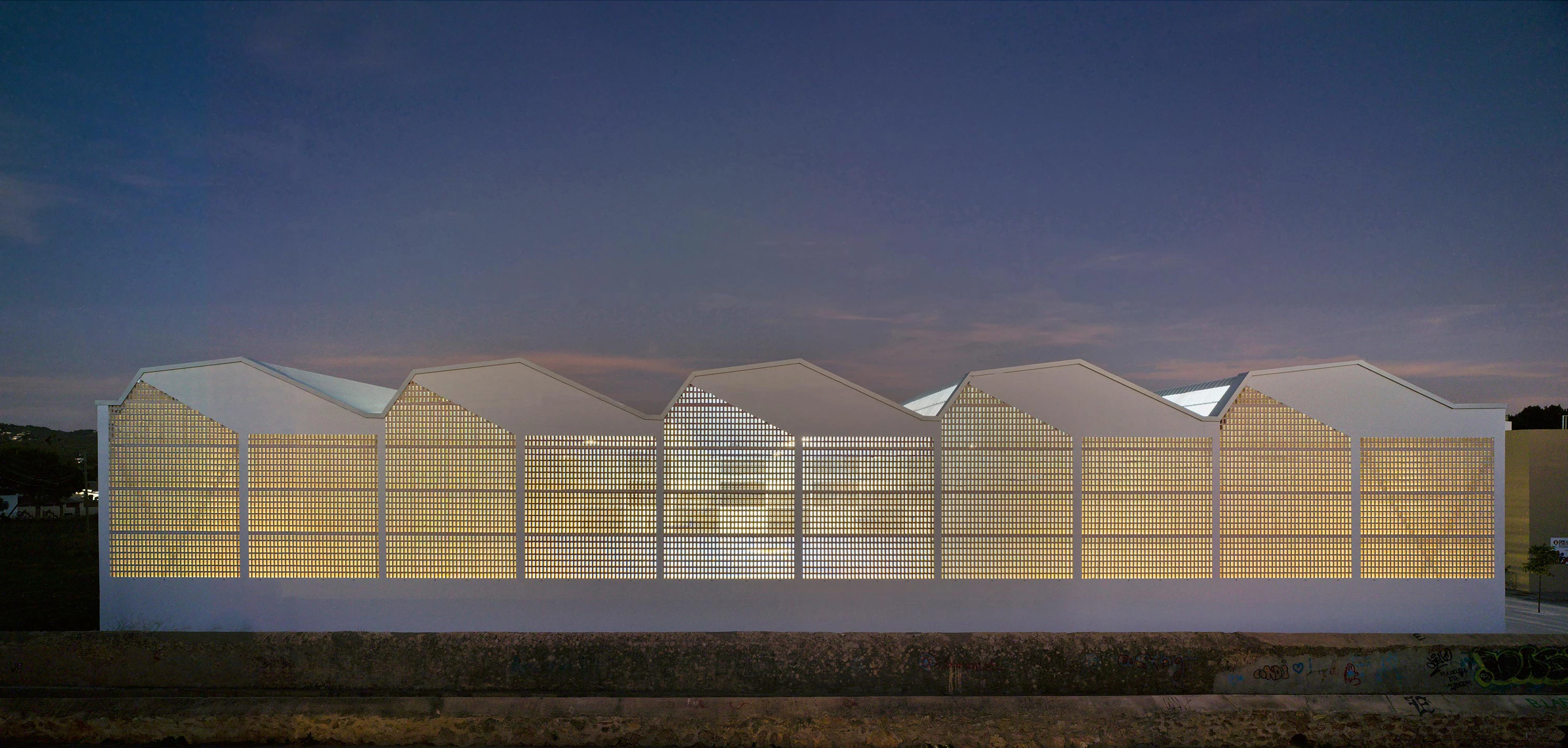 The Ibiza project closes the existing fields with a metal sawtooth roof and an envelope perforated by brick latticeworks that filter Mediterranean light and enrich the interior spaces with different colors during the day.