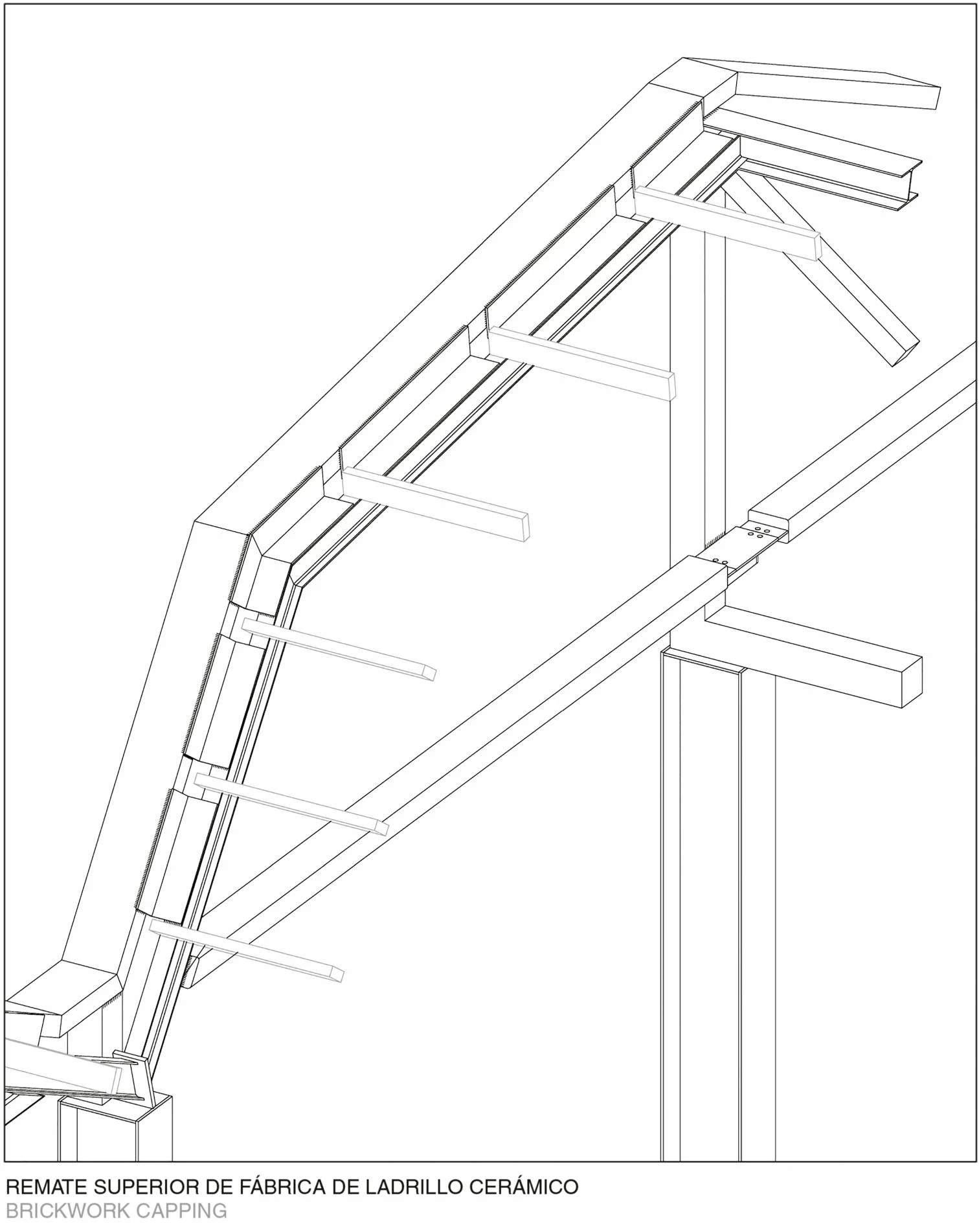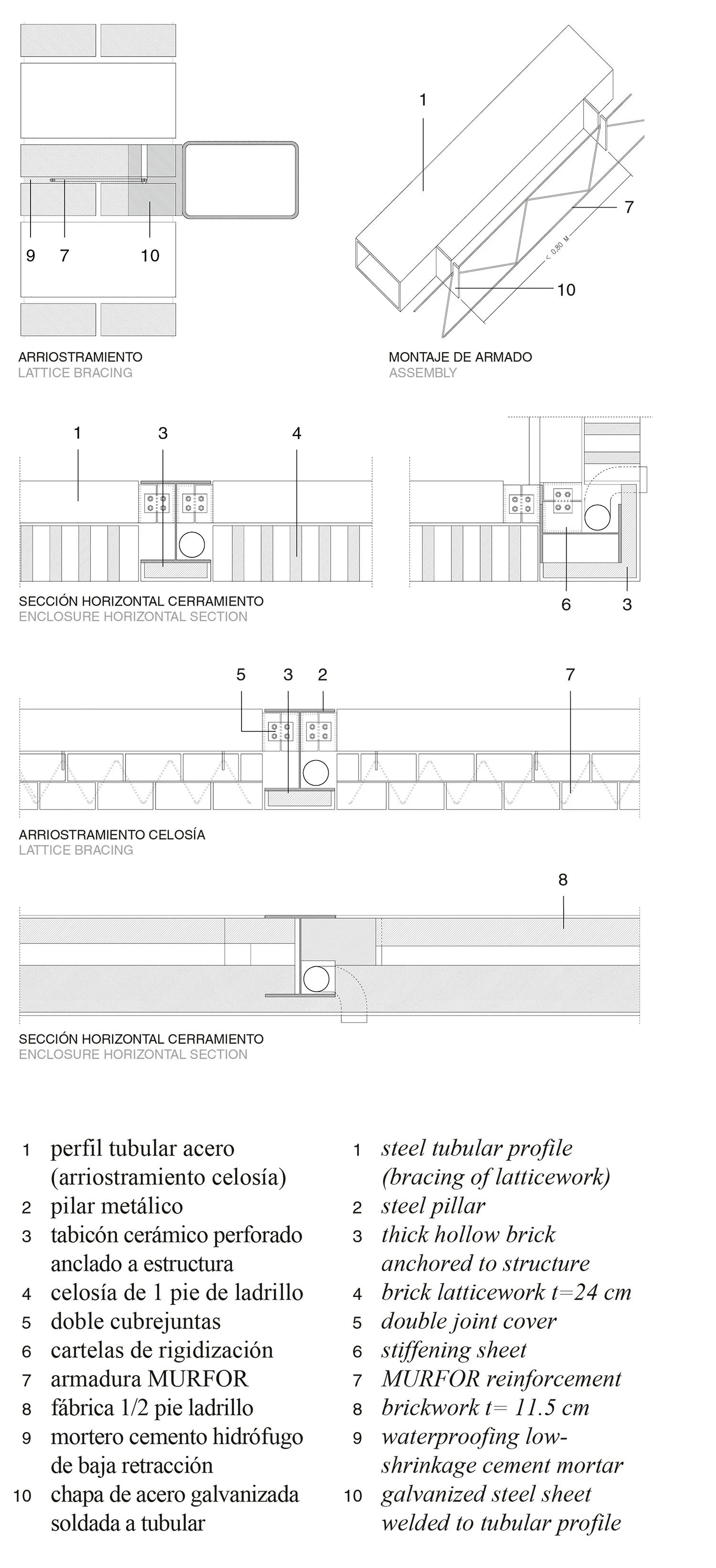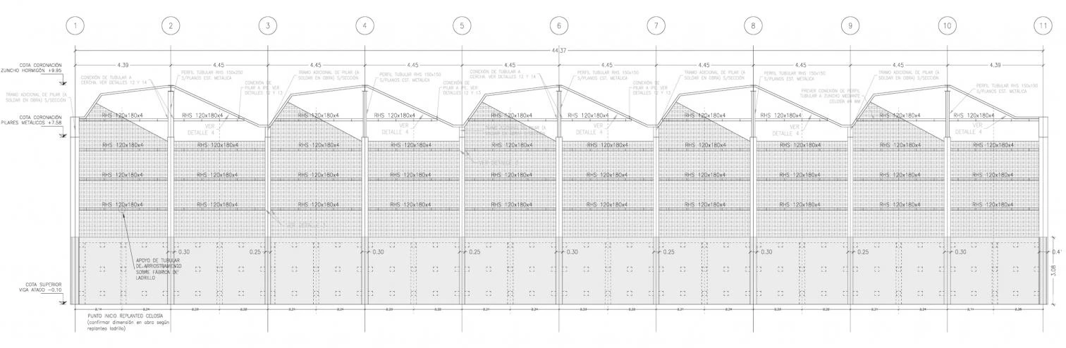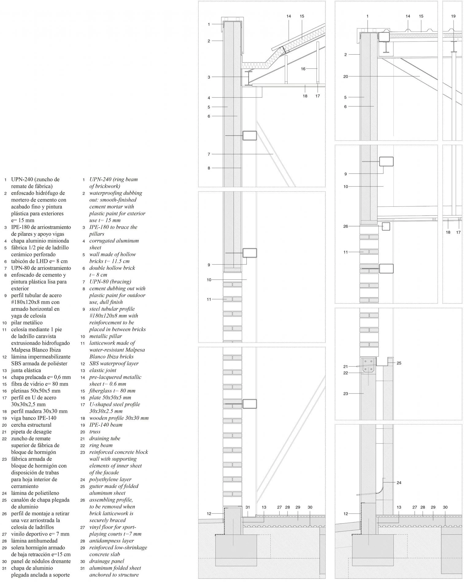 The Ibiza project closes the existing fields with a metal sawtooth roof and an envelope perforated by brick latticeworks that filter Mediterranean light and enrich the interior spaces with different colors during the day.