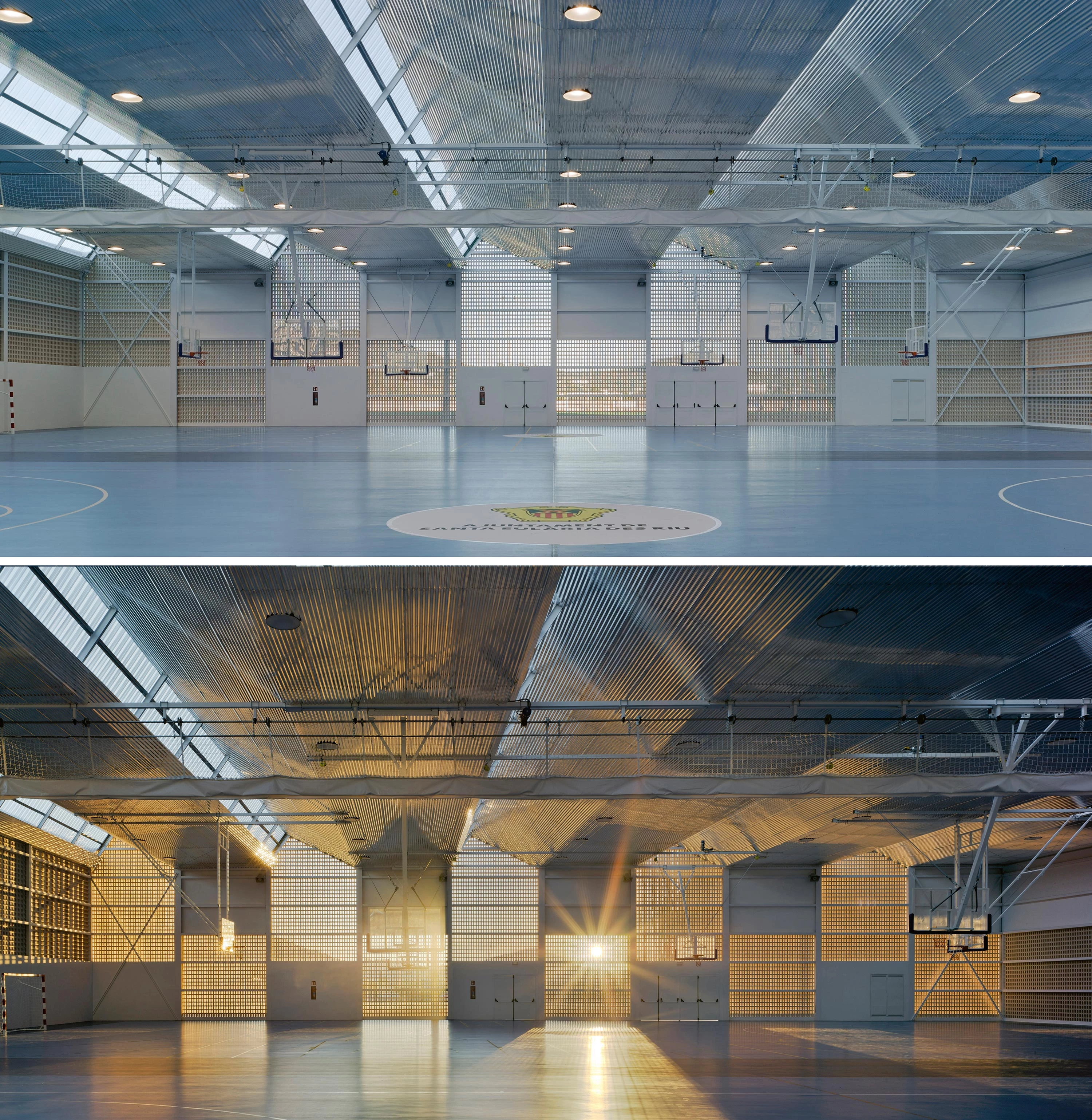 The construction of the Es Puig d’en Valls center started out with the design of a metallic structure to cover two existing outdoor sports grounds in this town near Santa Eulària des Riu, on the east side of the island of Ibiza. During this first construction phase the team was also commissioned to build a perimeter enclosure to wrap up the whole complex. This second phase of the project was influenced by the effects that light produced as it went through the roof.