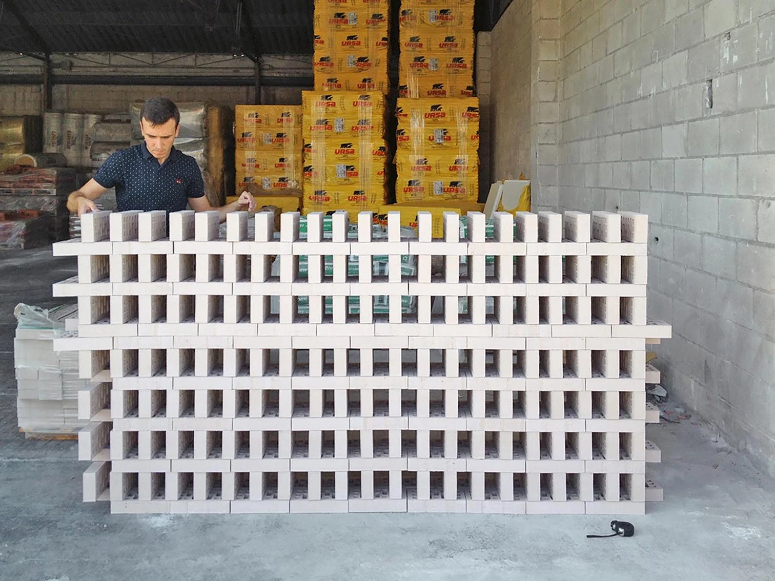 The perimeter walls are windowless – built with an exterior sheet of concrete block and lined internally with perforated brick – combined with latticeworks of exposed white brick layered in a uniform pattern, with opaque and lattice sections alternating.