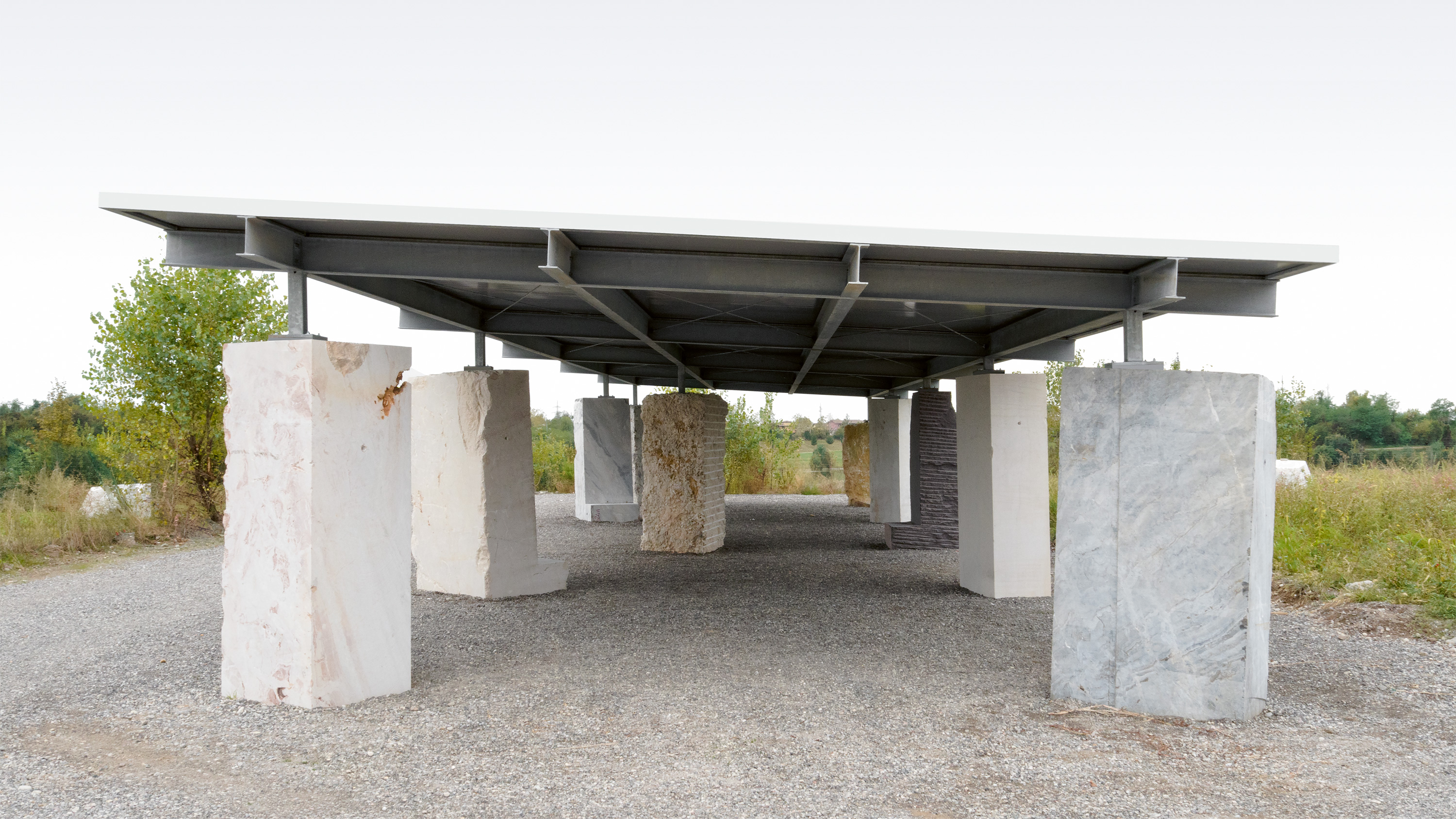 Brescia marble may not be as famous as the Carrara that sculptors like Pisano and Michelangelo used, but the basin around the city is one of the largest producers of ornamental stone in Italy. In celebration of both its geological diversity and its tradition of quarries, a marquee has been built on blocks scattered around a gravel bed transformed into a park, spreading a thin metal roof over nine monolithic supports, discards donated by companies in the area and each one of a different variety of rock. Under this contemporary megalith, a tenth pillar with an allegory etched on it is a reminder that within every stone, art waits for the superfluous to be chiseled away.