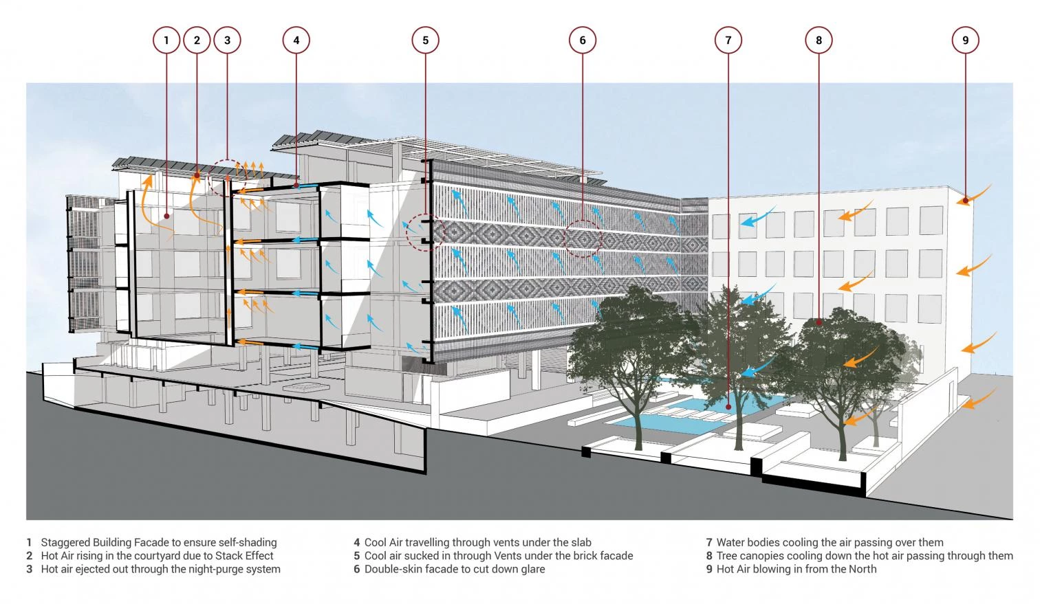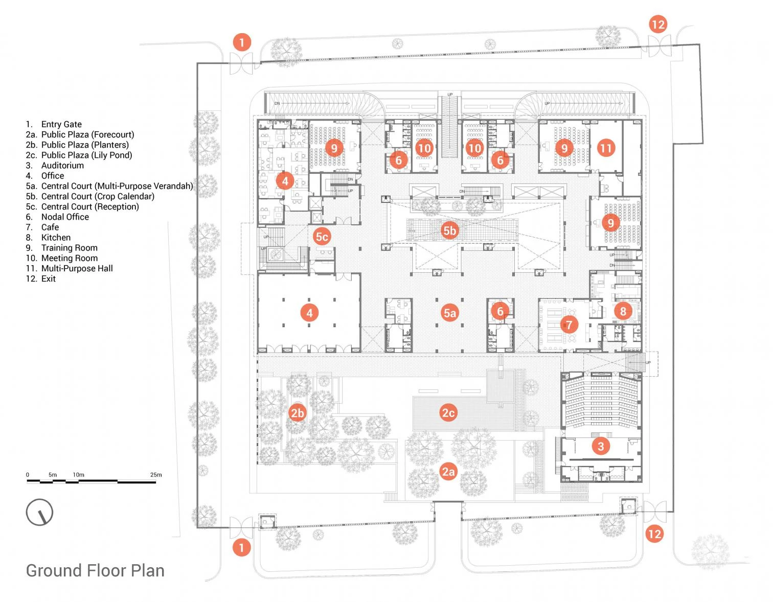 In the capital of the Indian state of Odisha, the New Delhi-based firm Studio Lotus has built new offices for the Department of Agriculture. As a government building it was conceived at the outset strictly for official use, but the architects proposed to free up the ground level and create a public space that opens up the premises to the city and allows citizens to walk through in the course of their daily comings and goings. The heavy masonry facade minimizes the need for air conditioning through its thermal inertia, and its combination of patterns, textures, and colors evokes the region’s textile tradition as well as its diversity.