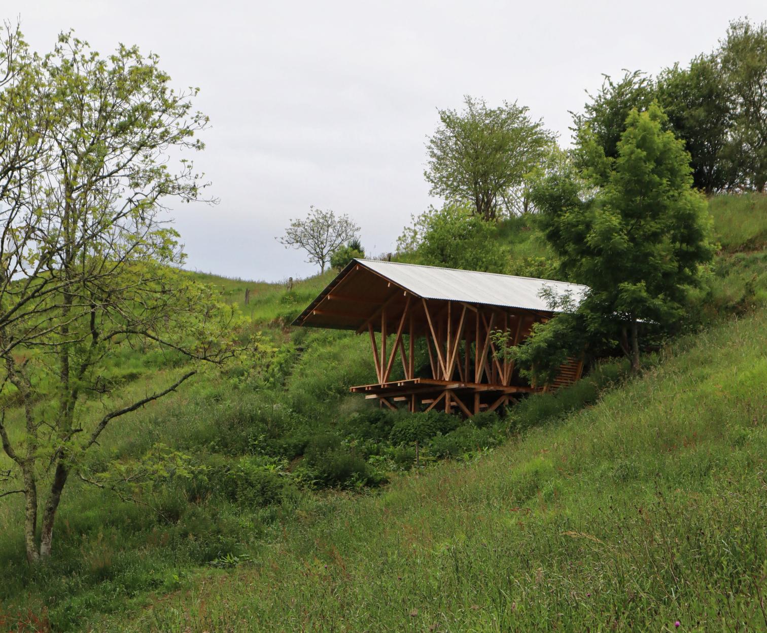 The studio of Alice Cecchini and Roman Joliy, Atelier Poem, has designed this open shelter for Foresta Collective. The group operates between Germany and Spain and promotes education based on direct experience with nature. The project is a spatial response to an agroforestry program that plans to plant more than a thousand trees on five hectares of land in Cabranes (Asturias).
