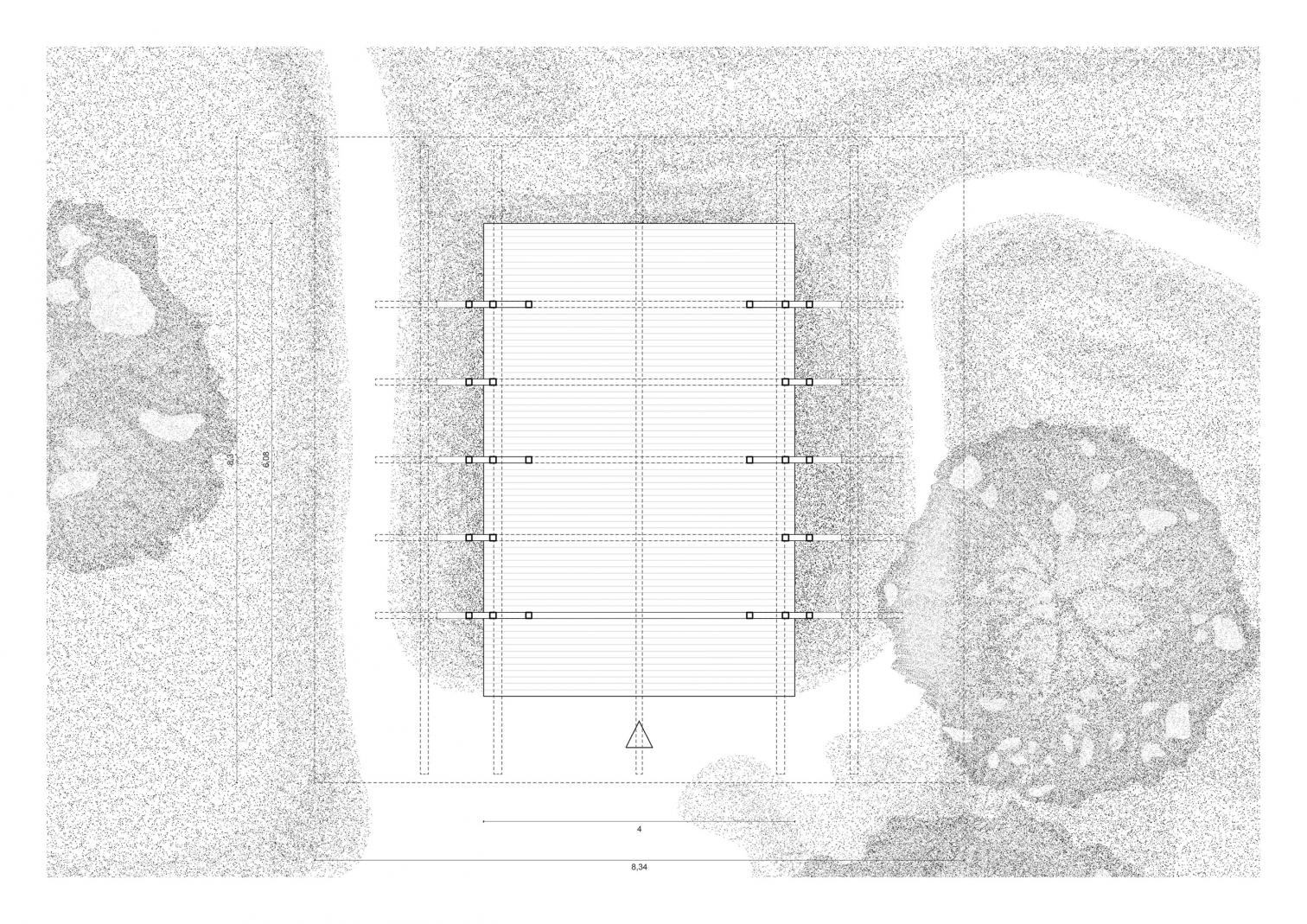 Taking advantage of the natural slope of the terrain, the pavilion is raised on bearing blocks that minimize its footprint on the ground. This solution protects the timber structures from moisture and allows vegetation, microfauna, and natural cycles to continue under the construction. The main floor is configured as an open and permeable classroom, where the rhythm of pillars organizes the space and establishes a direct and fragmented relationship with the territory.