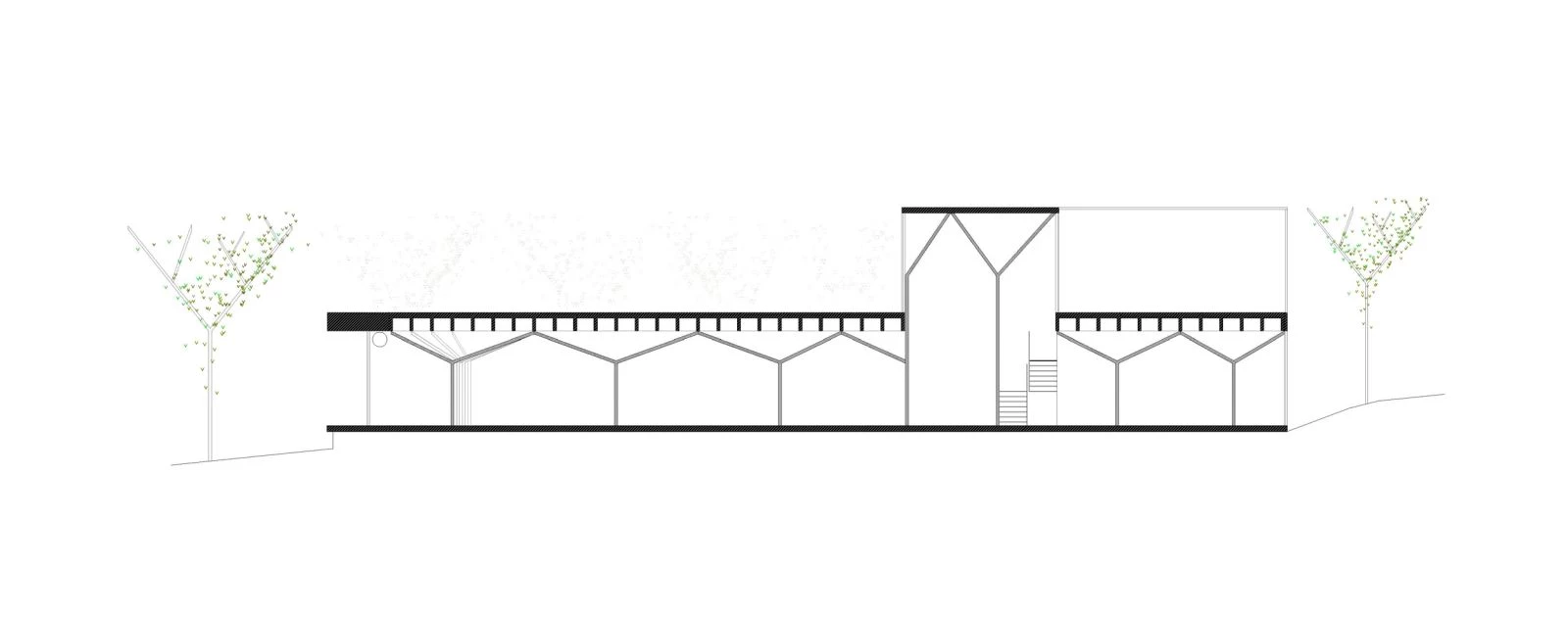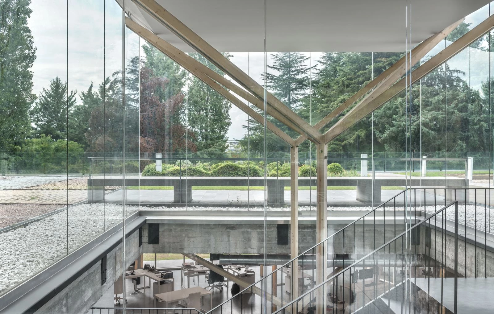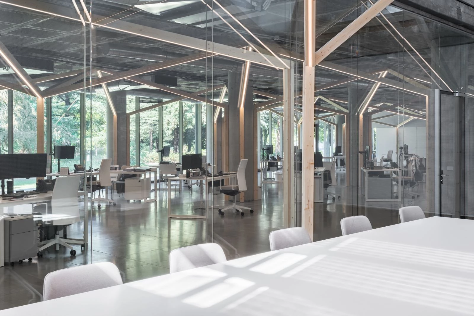 Based in Madrid and Pamplona, the practice of Javier Pérez-Herreras and Francisco Javier Quintana de Uña – taller básico de arquitectura – has amid fir and pine trees built this 900-square-meter office pavilion that opens out on its long facade to the forest, and on the other side to a play of patios. The concrete structure is complemented by poles and tetrahedral branches of birch wood, creating something like a prolongation of the holt outside. The result is a luminous indoor forest whose geometry organizes and sets the scale of the corporate space. A large thick screen secludes the private offices and meeting rooms.