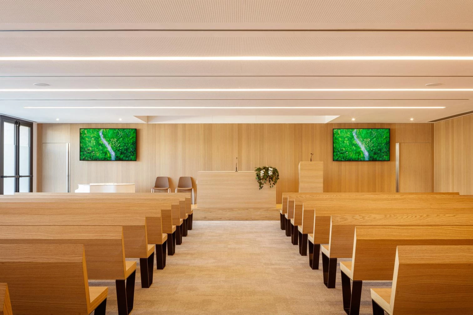 The large structural spans of the existing warehouse permitted accommodating the program required for this type of facility. Even so, it was necessary to build an intermediate slab, reinforcing the structure for the new use, so that the functional program could be distributed in two levels: the lower floor with the oratory, crematorium, lobby, and communal areas; and the upper level with the three wake rooms required, for more private use. These rooms are filled with light coming in through courtyards that pierce the roof, respecting the beam filling of the old structure.