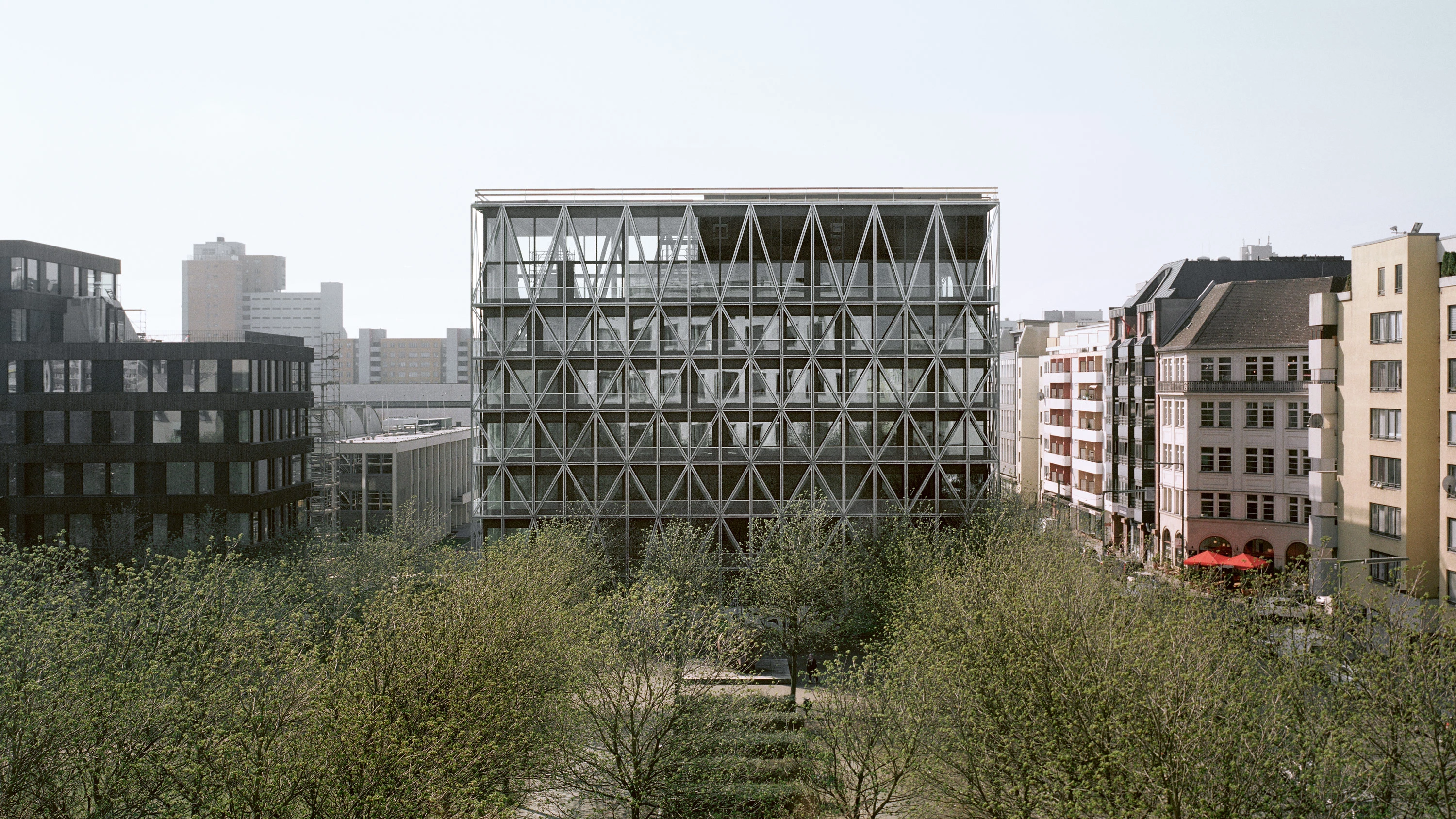 Due to its prominent street corner location, the new TAZ building must mediate between the urban fabric of a traditional Berlin block and solitary buildings from the IBA era. The design combines the urban block and the corner, adopting the height of the eaves characteristic to the city, in order to continue the block. Meanwhile, a subtle setback of the facade facing Friedrichstrasse marks the entrance. The structural system, conceived as a network, attempts to achieve the greatest possible load capacity with the fewest possible elements. The net is a structure with no hierarchy, in which all the parts must perform equally, and can only achieve stability together, symbolizing the horizontal and open organization of the company. The main structure is composed of diagonal bracings along the periphery of the building envelope, and therefore does not require any additional support on the inside. The almost thirteen-meter-long, free-spanning office floors create a raw, workshop-like atmosphere and are able to respond flexibly to a variety of forms of use. The glass-enclosed staircase sculpture in the center of the new building is, due to its dimension and plasticity, more than just a vertical connection mechanism, offering a place of informal exchange...[+][+]