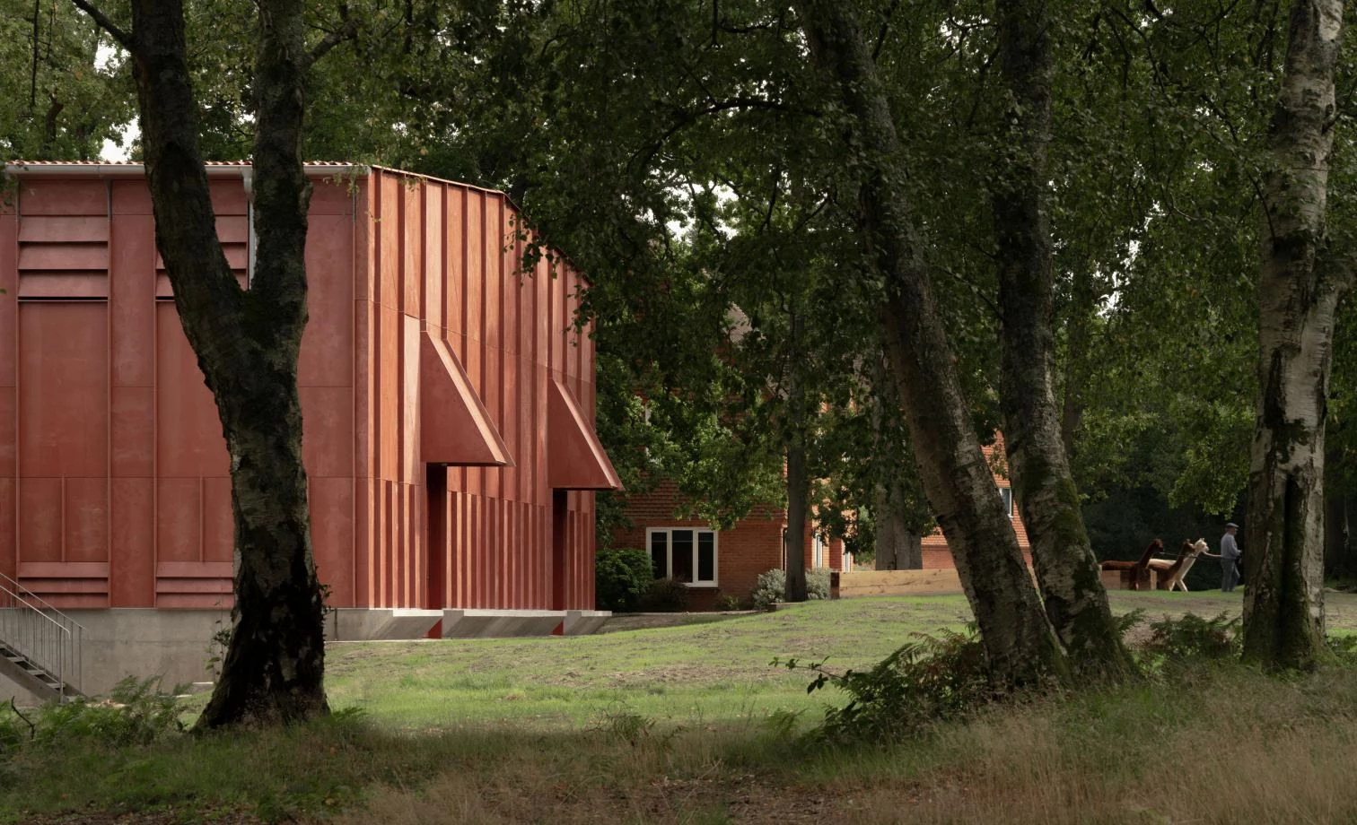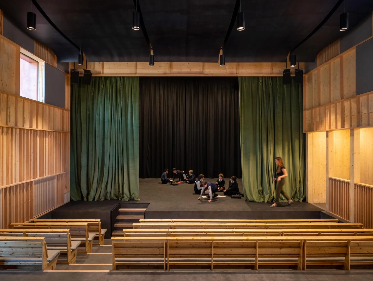 This theatre for Horris Hill School in Newbury, a town in the county of Berkshire, England, is built with cross laminated timber (CLT) and Viroc composite panels – with a mix of wood fibers and cement particles – whose reddish tones resemble those of the brick facades of surrounding buildings.
