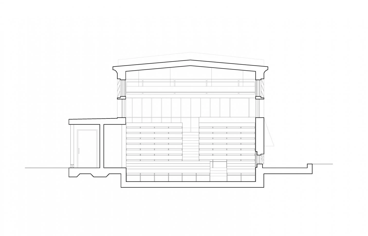 A result of an invitational competition held in 2016, the project drawn up by the London practice of Jonathan Tuckey encompasses 528 square meters and presents three principal elements: an auditorium seating 160, an open-air amphitheater; and a portico framing the main entrance and serving as a billboard announcing the shows.