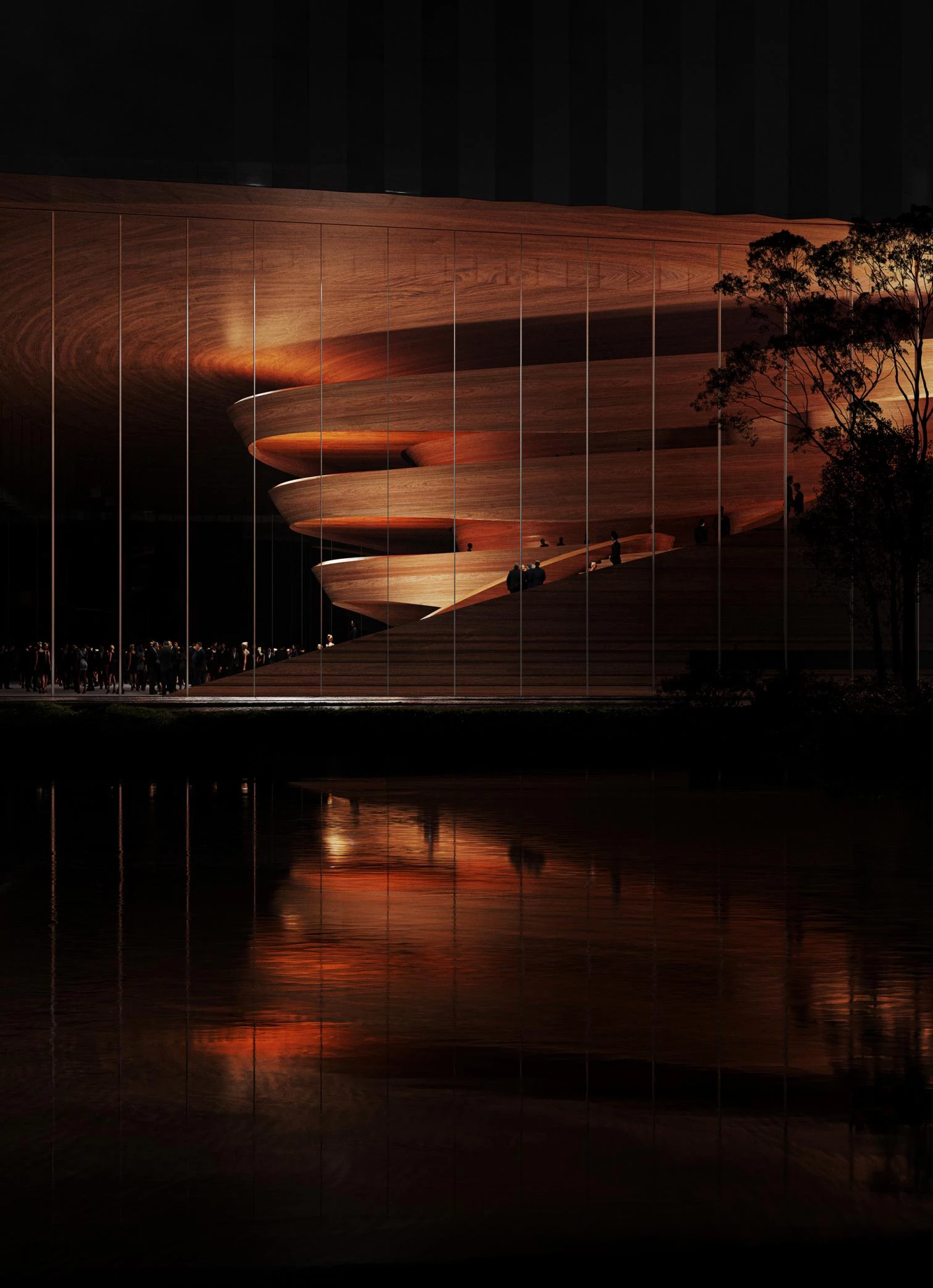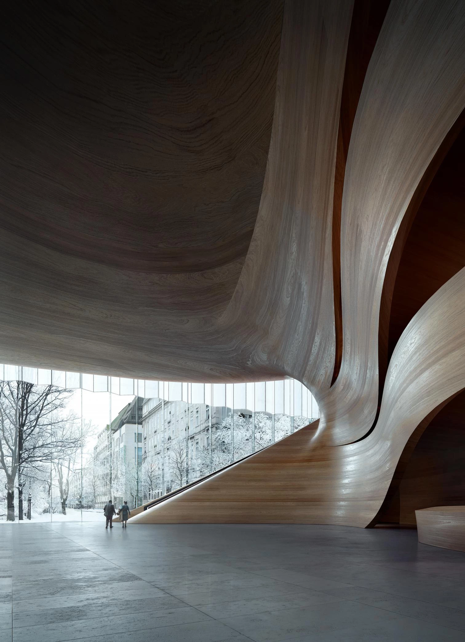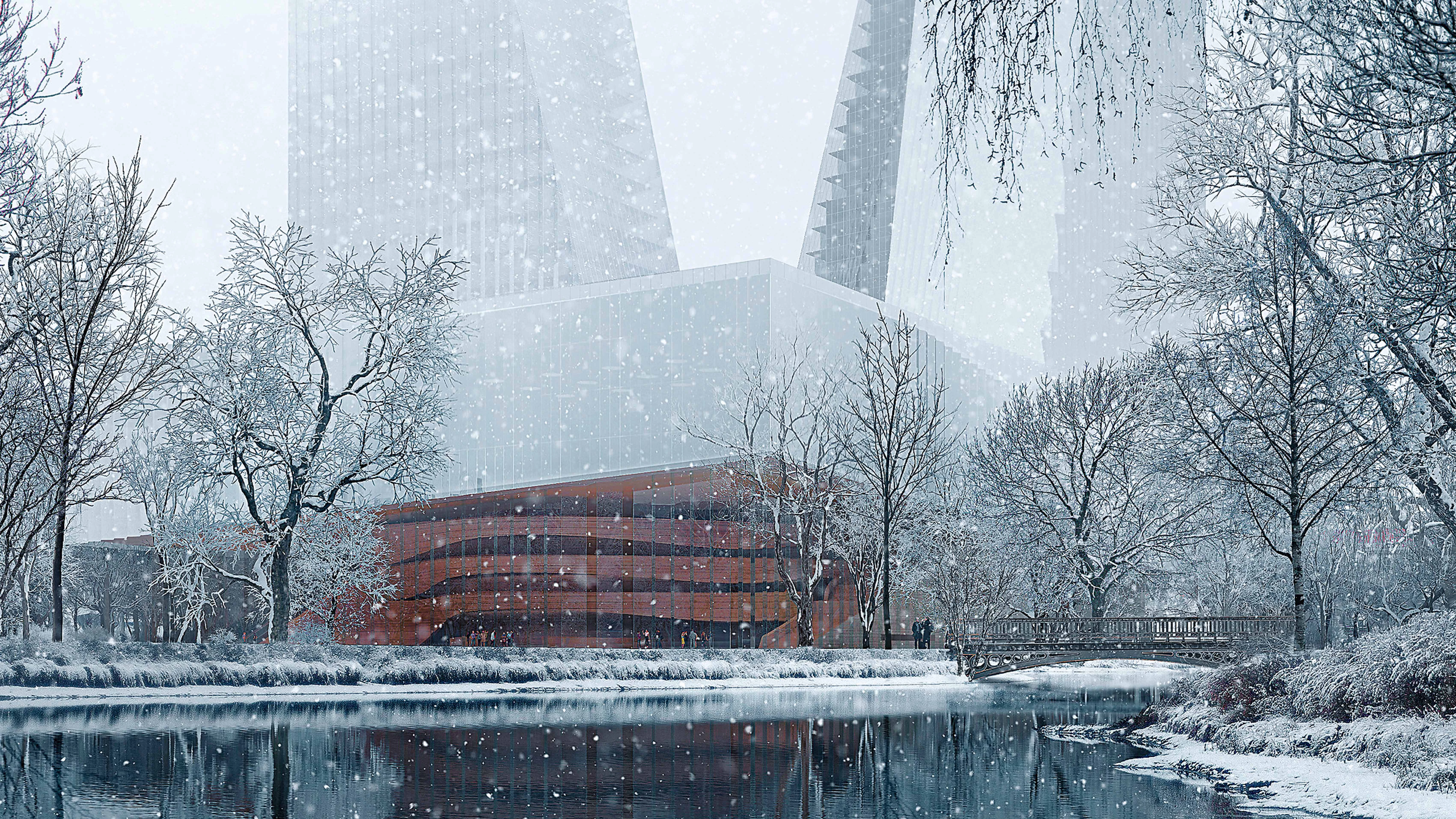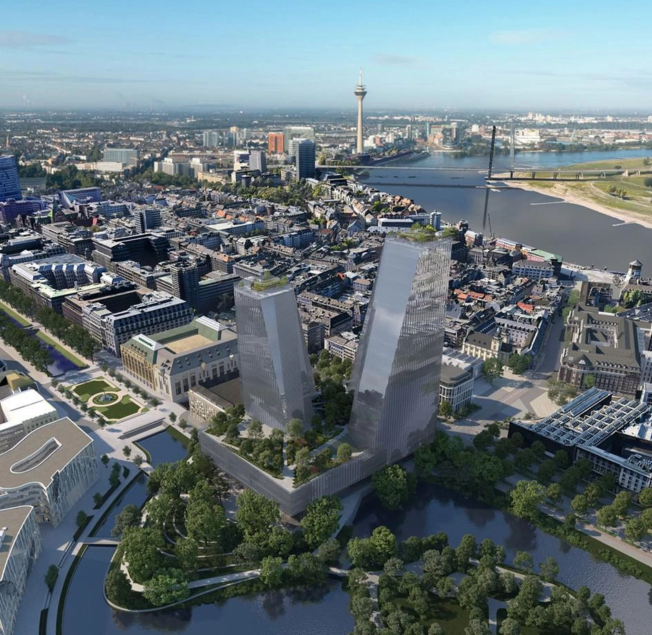 Located in the heart of Düsseldorf, this mixed-use development commissioned to the firm Snøhetta presents two towers containing offices, apartments, and a hotel, and includes a new opera house for the city. Named Duett Düsseldorf, the new cultural space beside the historic Hofgarten park will have a 16-meter-tall facade of transparent glass showing a foyer delimited behind by a sculptural wooden core that incorporates stairs. These lead to a café on the first of the three floors contained within a horizontal cantilevering volume crowned with a roof garden. From the café, visitors can see into the rehearsal spaces.