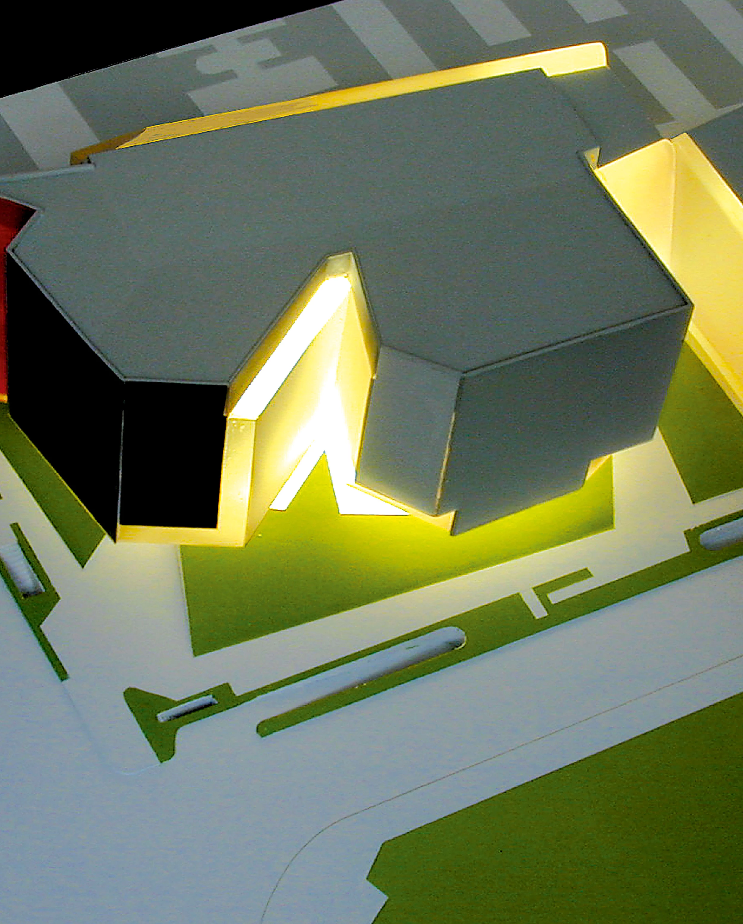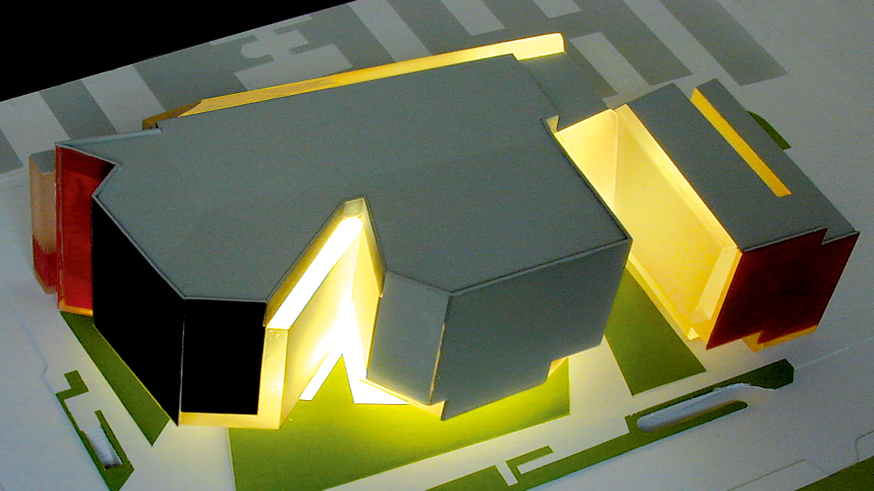 El color se utiliza como sustancia constructiva básica; inspirado en los recortables de Matisse, el teatro se manifiesta exteriormente como un animado conjunto de piezas envueltas en una tersa piel de vidrios de distintas tonalidades y con diferentes grados de transparencia, que refleja la luz con brillos matizados.