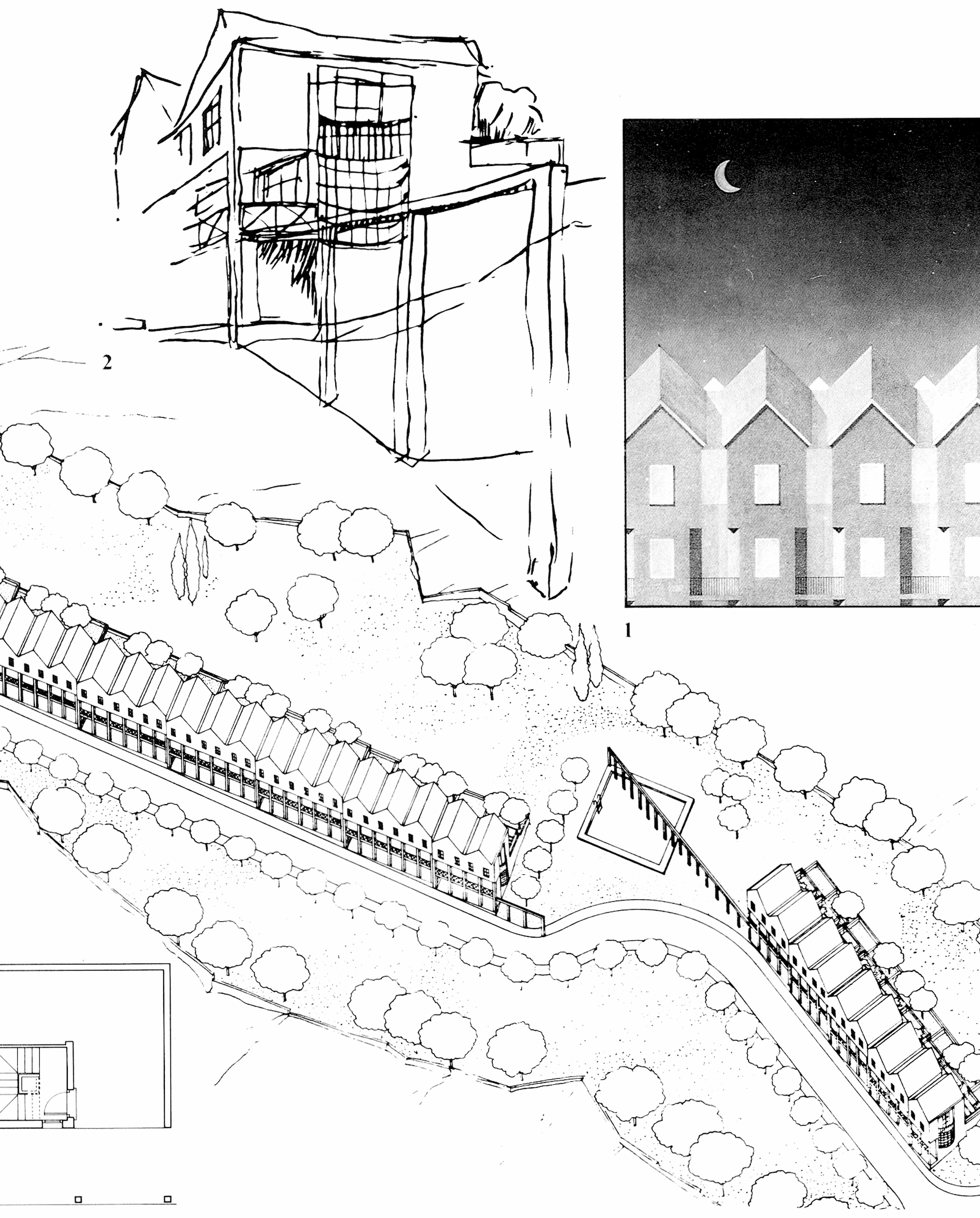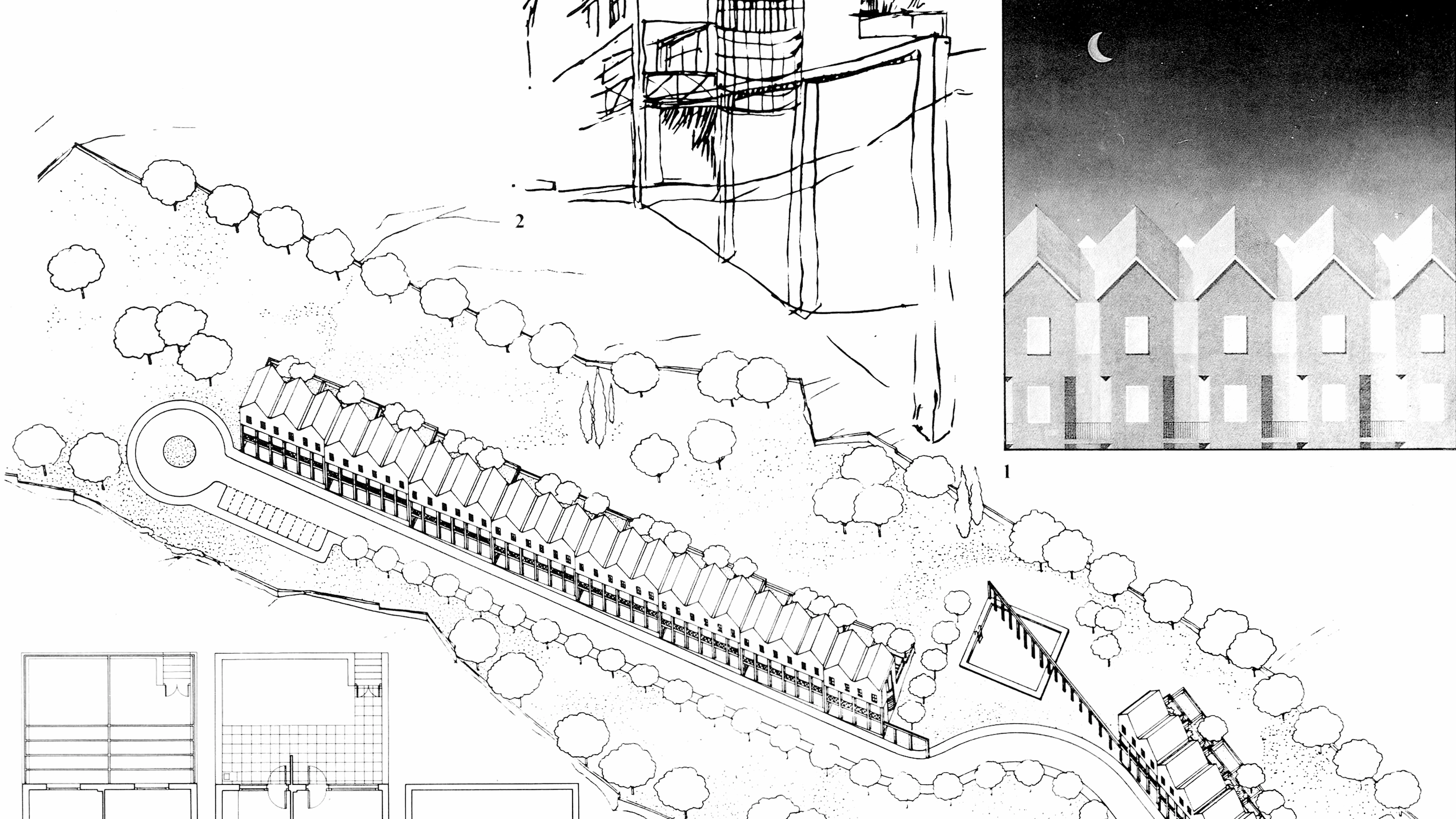 Es curioso el empleo de una tipología de medianeras de tres plantas sin muros medianeros de carga, o el recurso formal del tejado con dos aguas laterales, propio de las ciudades sin ordenanza de medianería, fiado aquí al buen funcionamiento de limahoyas y canalones. Este recurso emparenta el proyecto con algunas propuestas recientes para Berlín, como las de Bruno Reichlin para Friedrichstrasse o de Ungers para Lützowplatz, que intentan recuperar para la vivienda social de poca altura el skyline de las ciudades hanseáticas...[+]
