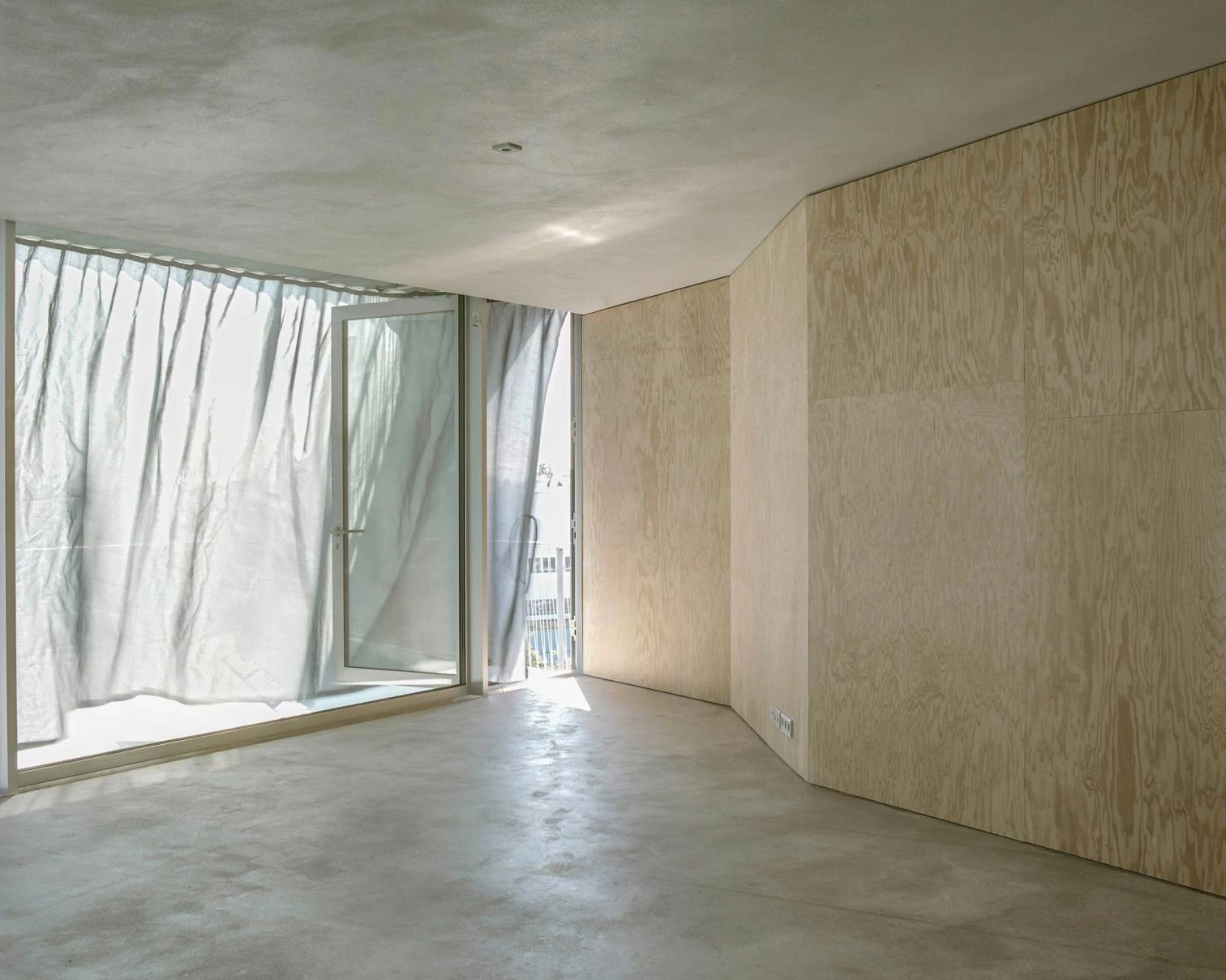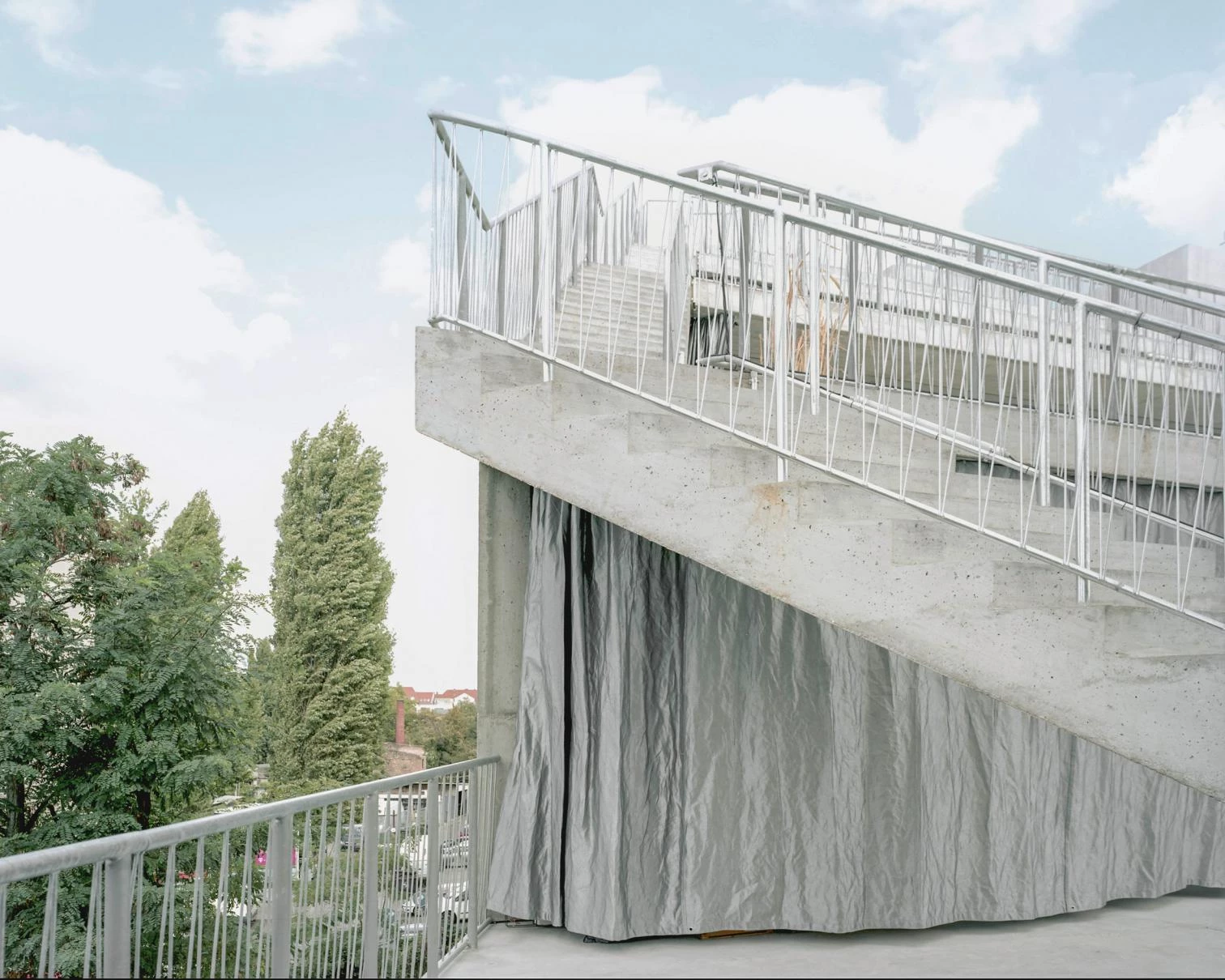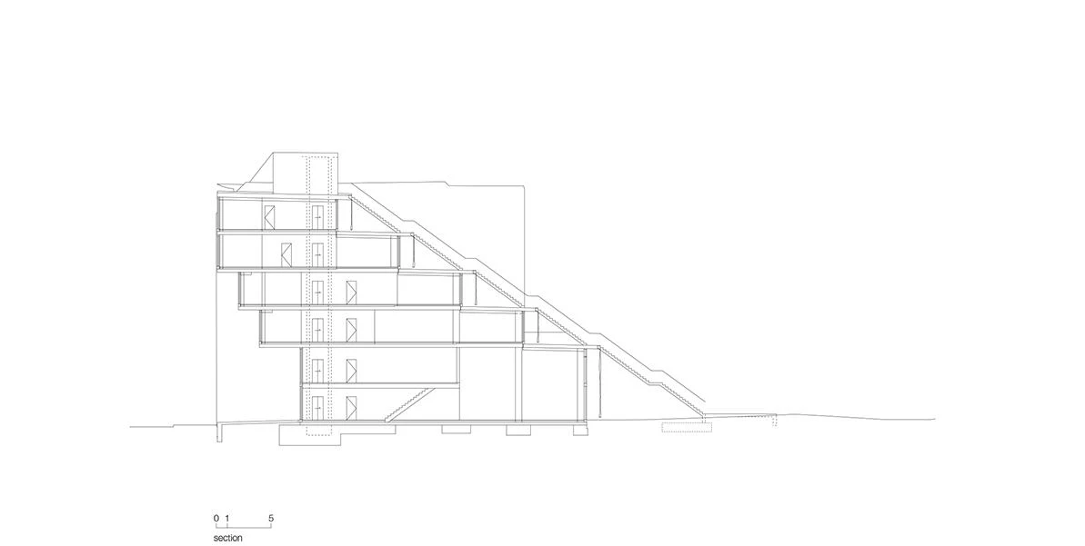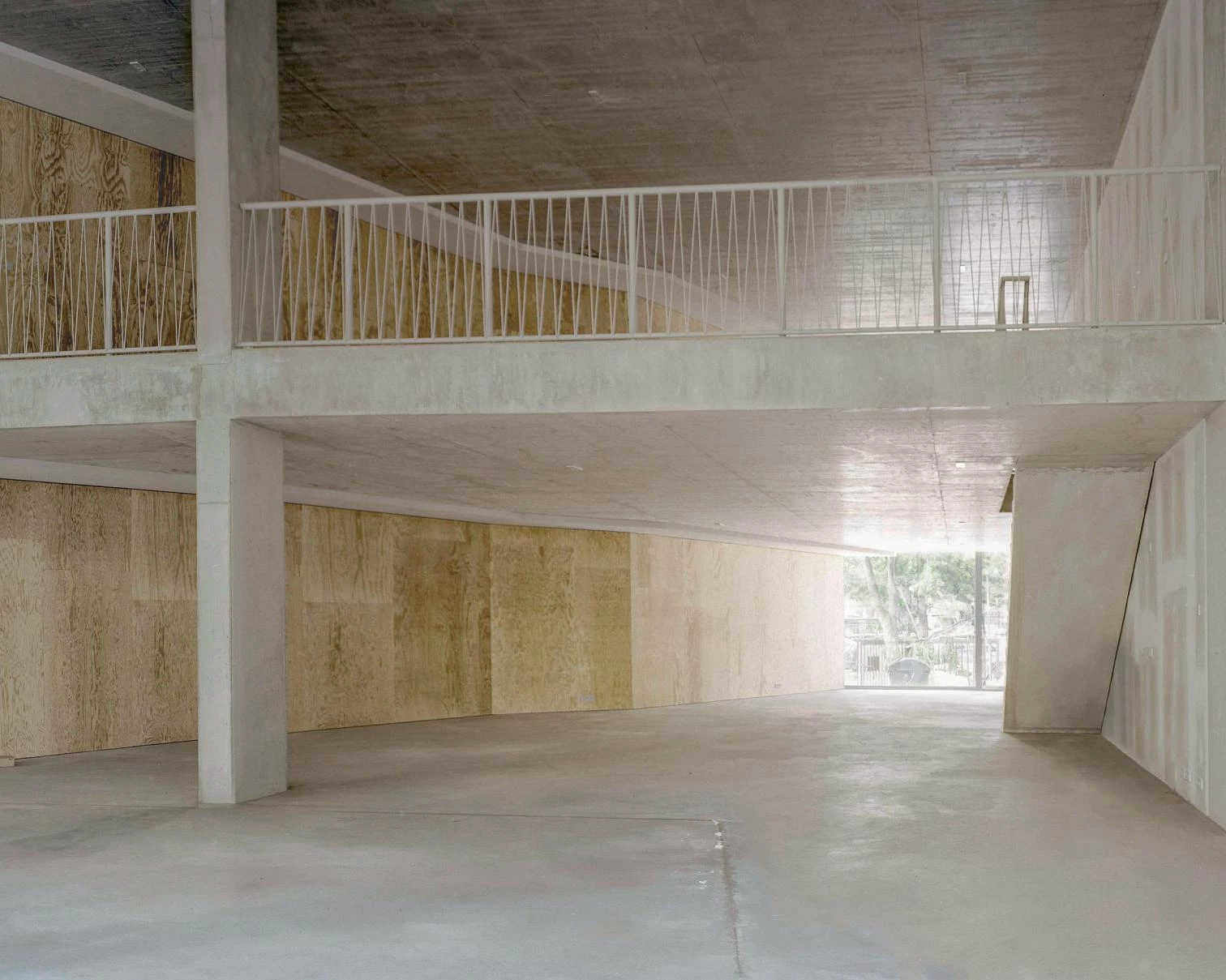 Built in a place that was a junkyard, in the Berlin neighborhood of Wedding, this mixed-use building has large stepped terraces. A work of Brandlhuber + Emde, Burlon, and Muck Petzet, the concrete volume has two external staircases connecting the five levels of apartments, an exhibition gallery, ateliers, offices, meeting rooms, and a public roof space. The successive setbacks of the levels solve privacy problems. Each floor opens up fully towards its terrace, with silvery curtains shielding residents from being seen from outside. The rear elevation shows the stack of levels creating a covered public plaza in front of the gallery space on the ground floor.