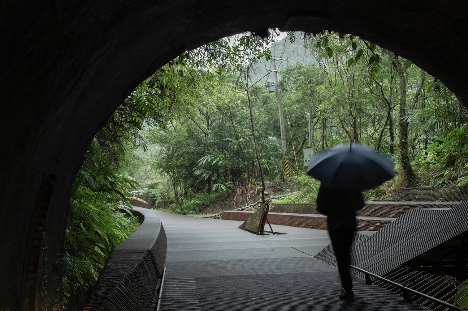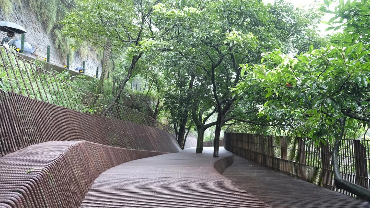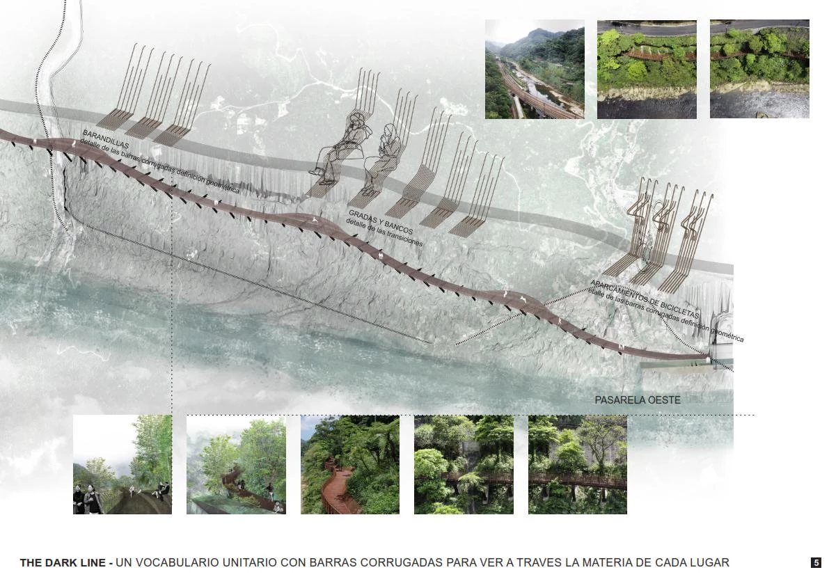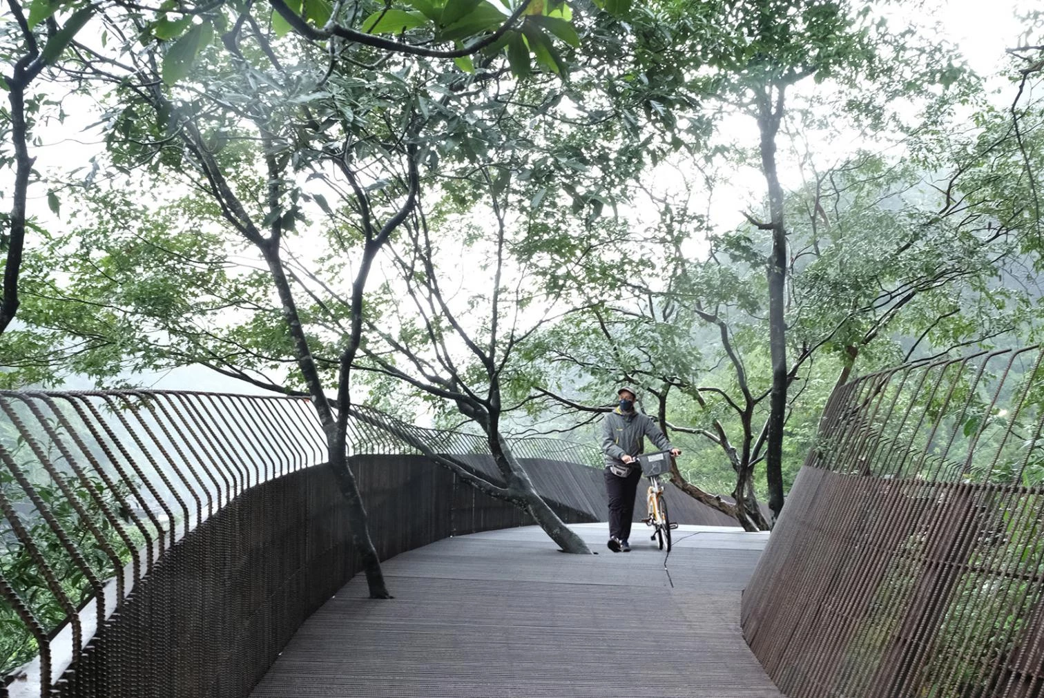 Two tunnels that were part of this ancient infrastructure, no longer in use, have been recovered to build a cycling path through the mountainous region and a footbridge anchored in the steep gorges of a river. To give the whole route continuity, corrugated steel bars are spread out as flooring and placed slightly apart to keep contact with the silt substrate, stretching and curving conveniently to form railings, benches, and bicycle racks.