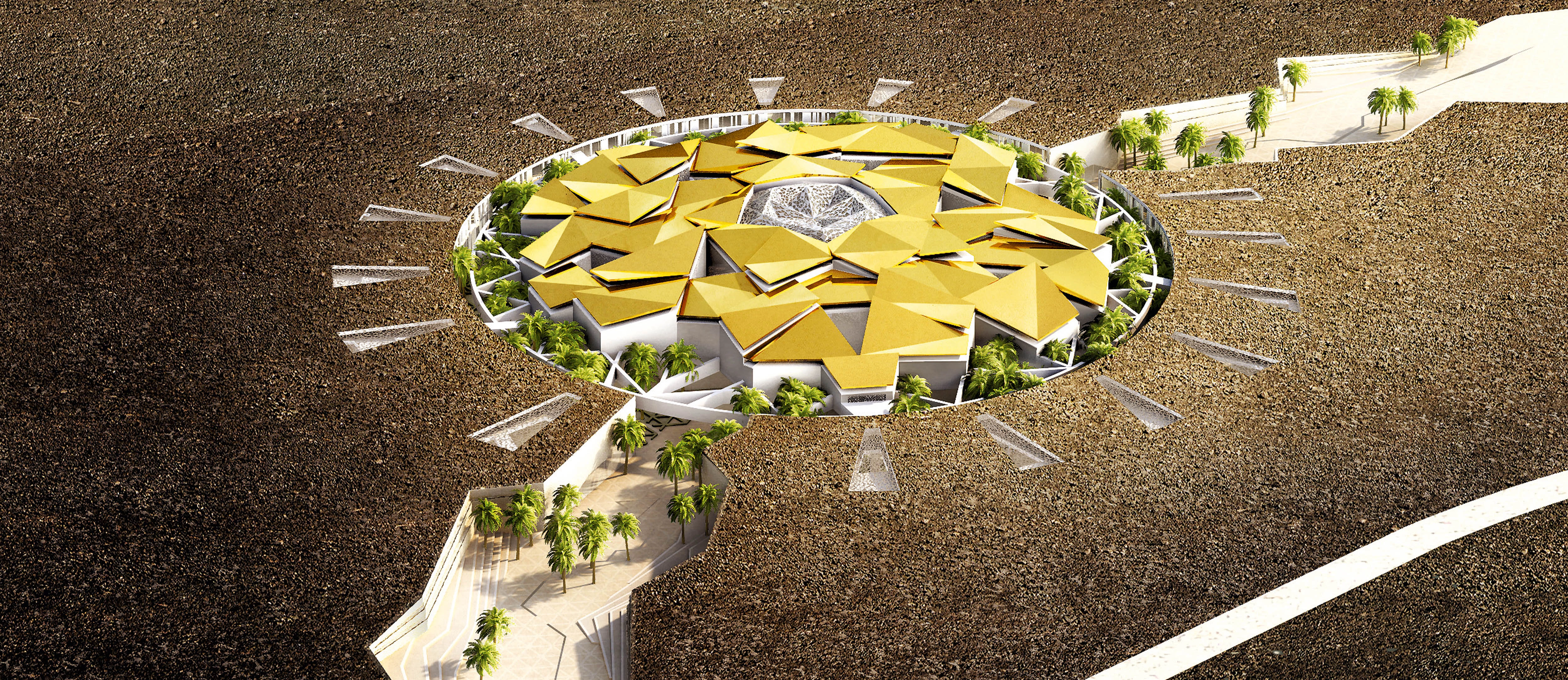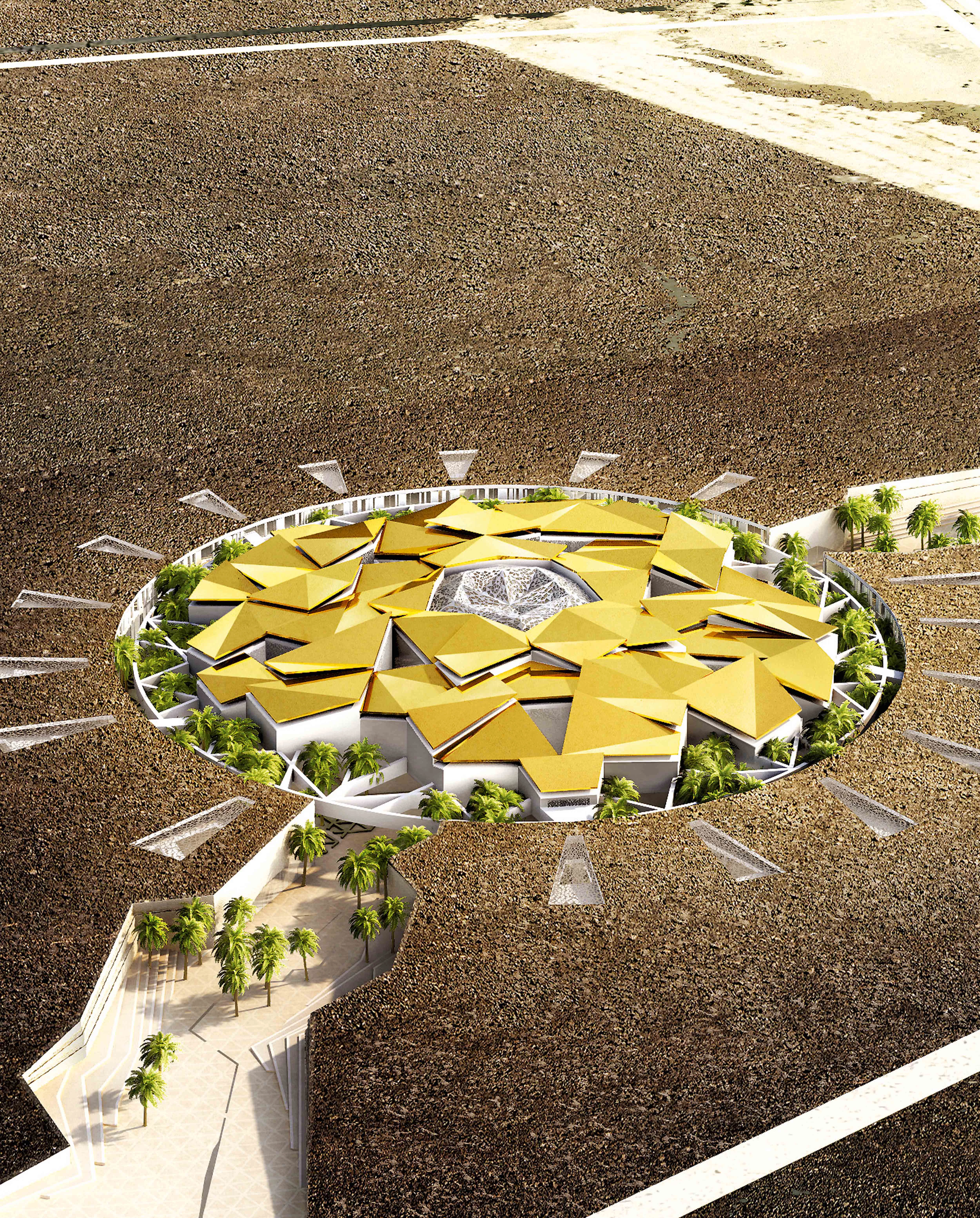 The design focusses on the idea of oasis as landscape and proposes a land art approach: the large three-dimensional roof rests on five columns that contain the vertical communications; their tesselated surfaces evoke the traditional architecture.