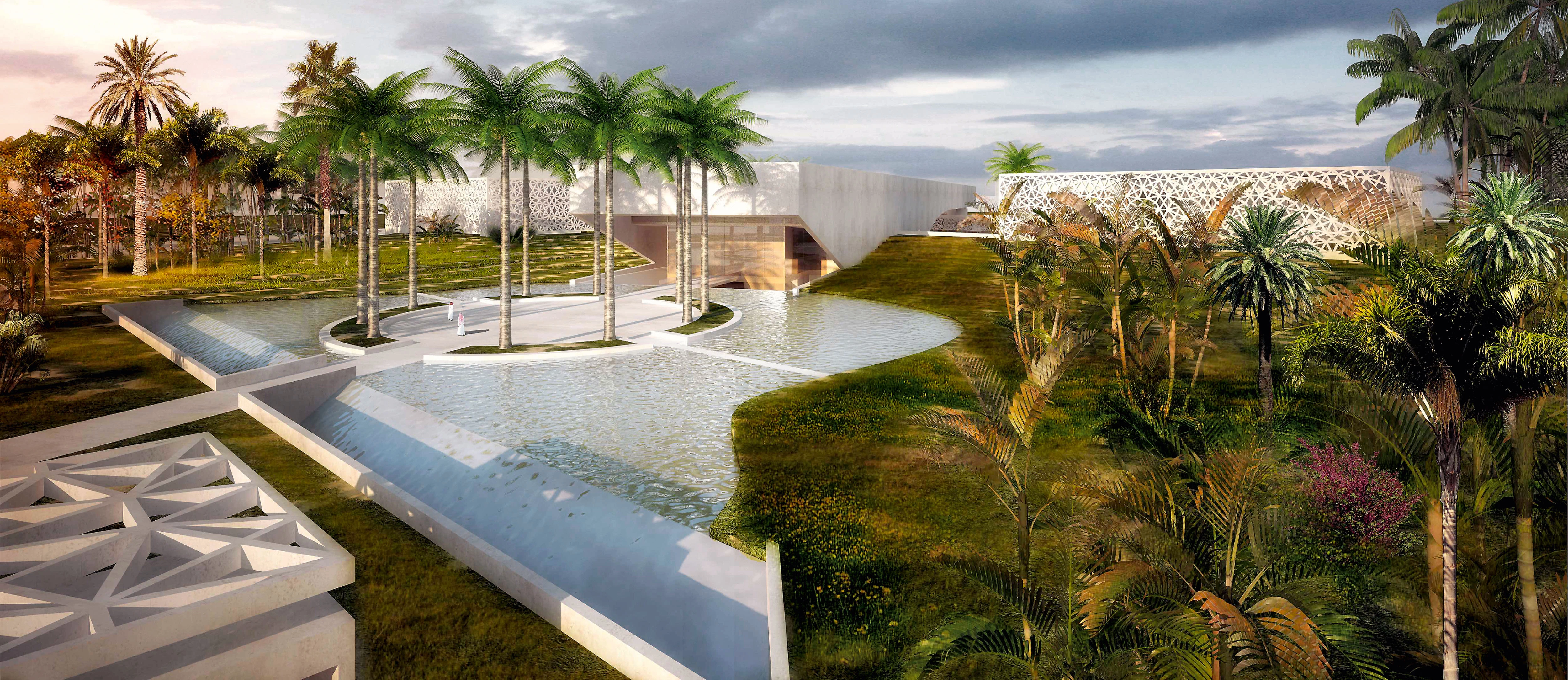 The complex includes two gardens – that of access at street level and the interior one on level -5; four ‘tents’ located at the angles, whose geometric repetition gives the whole an overall image; and a bridge pointing towards Madinah.
