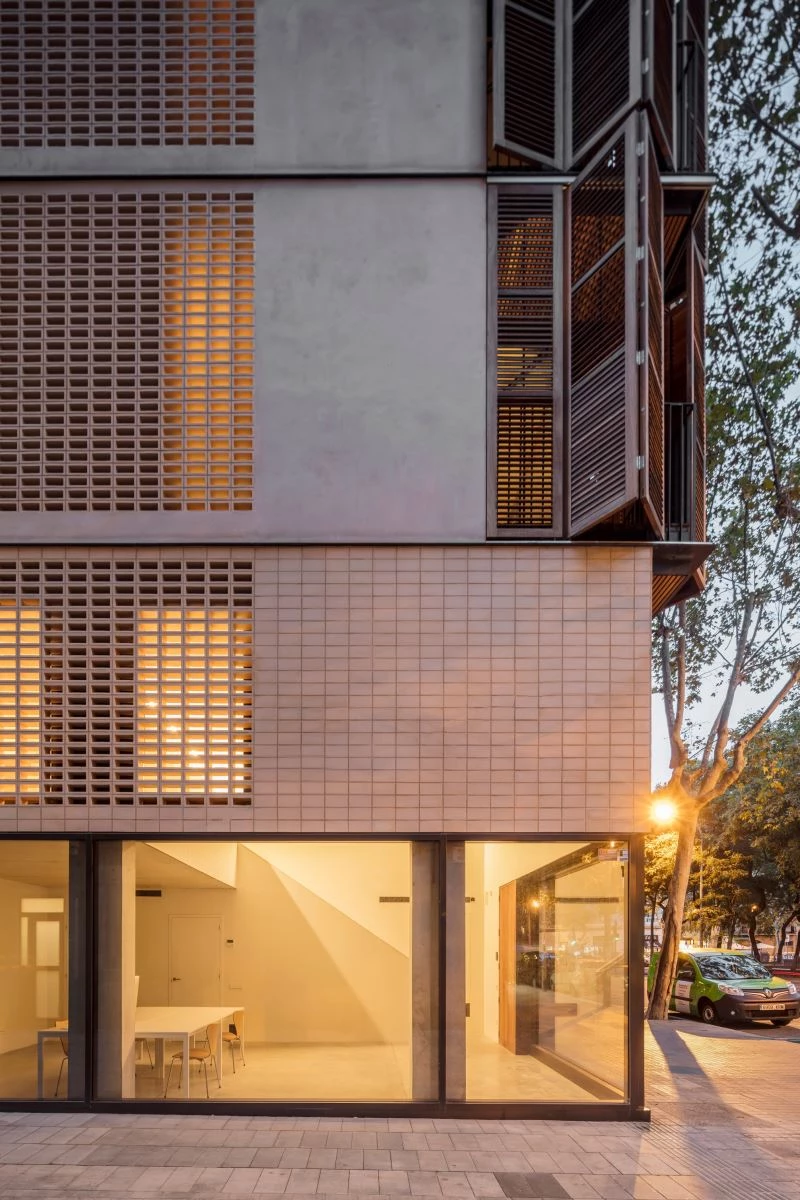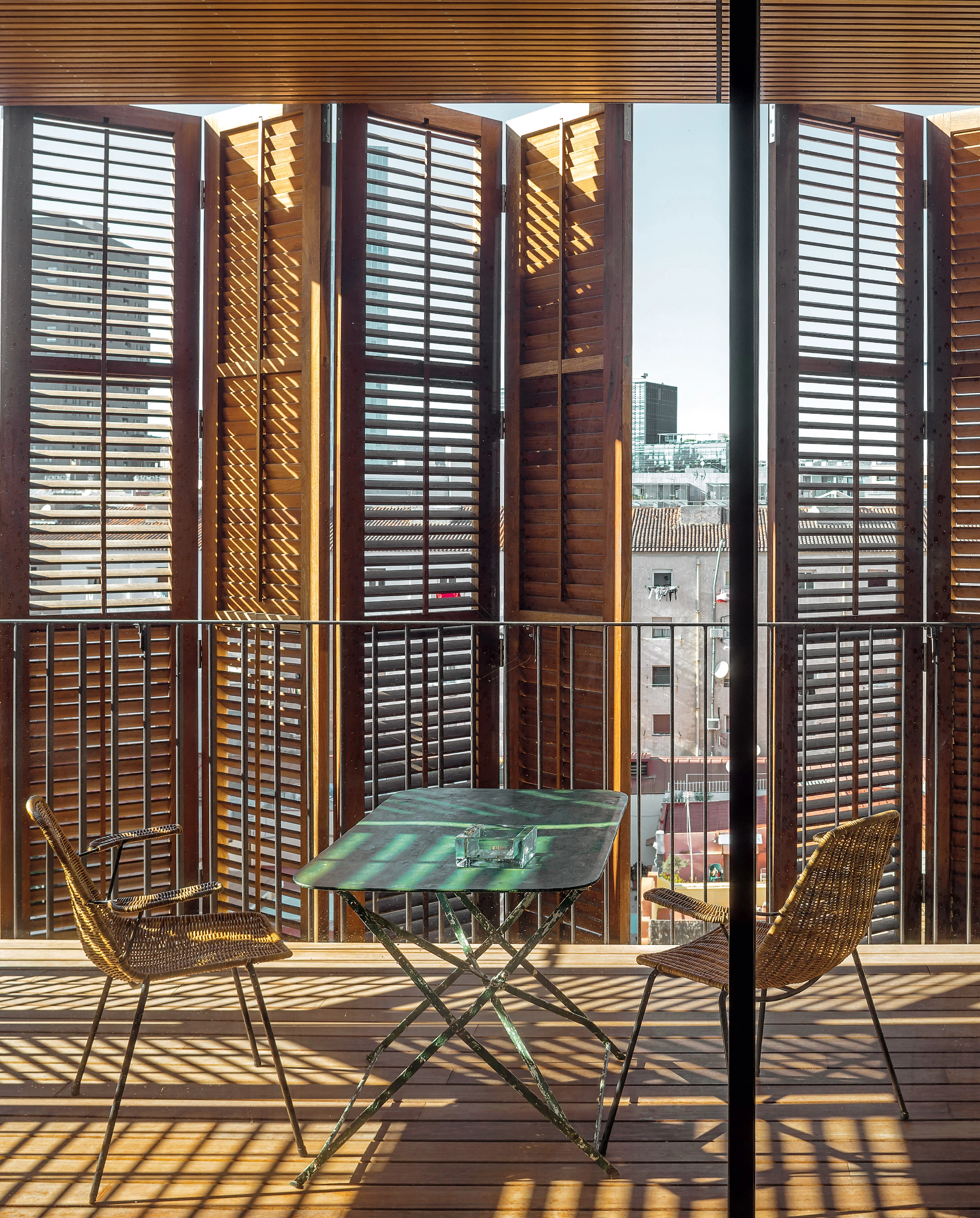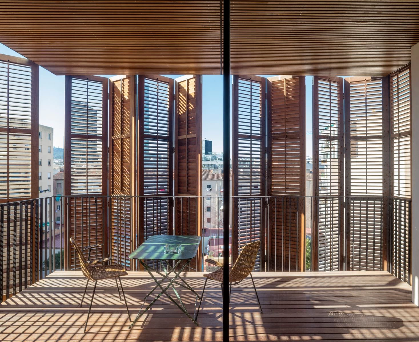 The project proposes a reinterpretation of the traditional building methods used in local construction, seeking integration and coherence with the urban context, acknowledging the industrial character of the neighborhood through materials found in the industrial architecture of Poblenou, like rustic brick, ceramic, and the wood of the shutters. The system of folding wood shutters with adjustable slats, inspired in the traditional ones in Barcelona, filters sunlight in the terraces and improves thermal comfort in the houses, while generating a dynamic interplay of mass and void in the building’s side facades.
