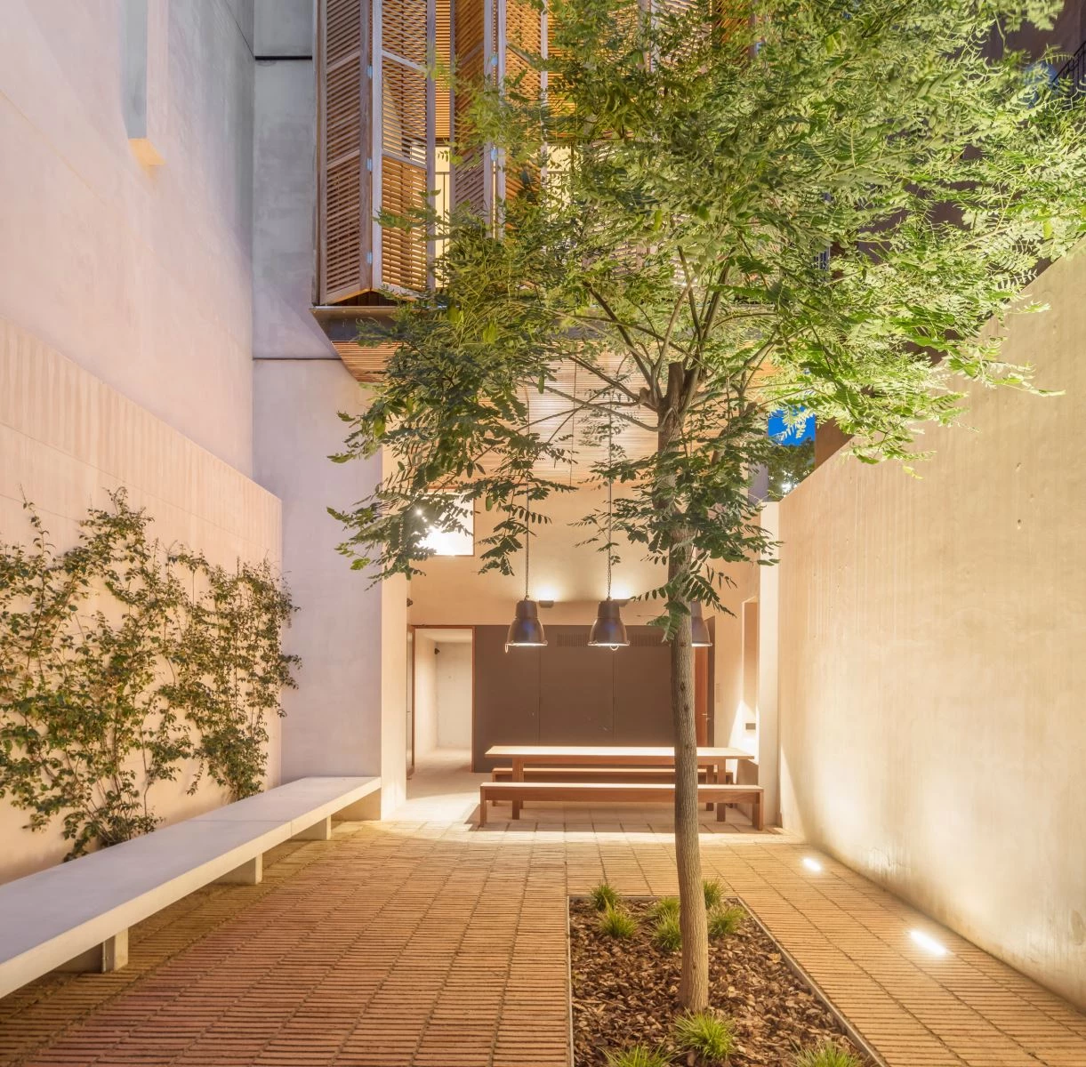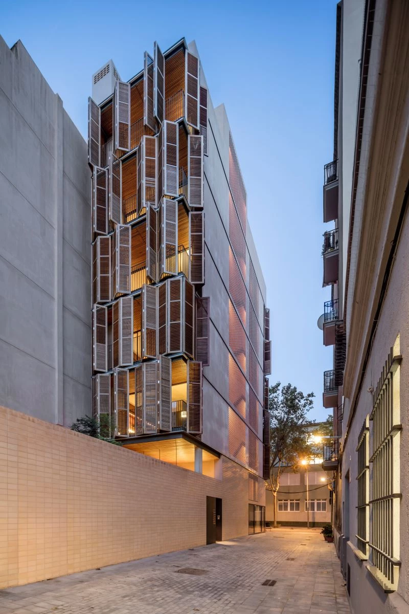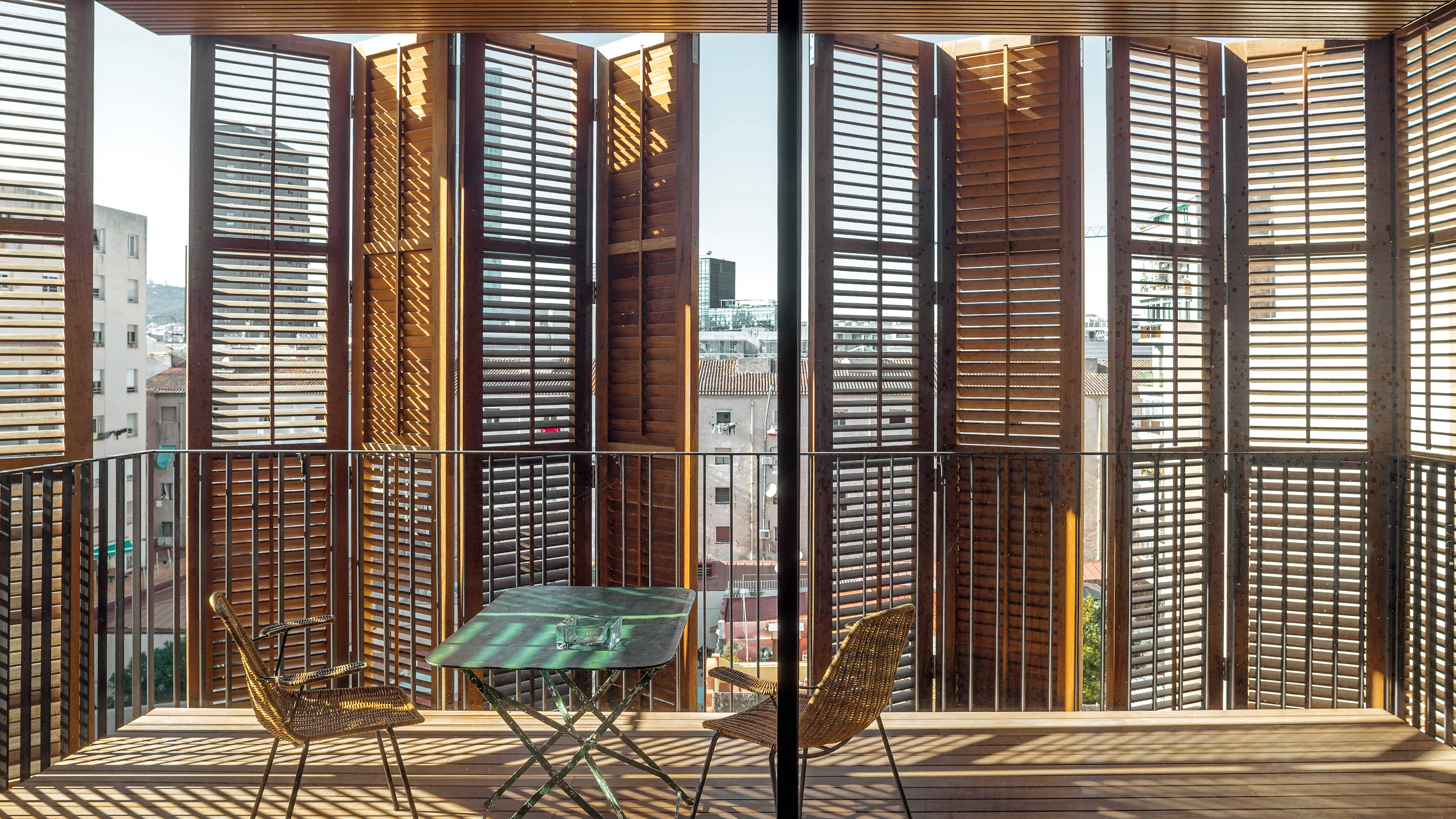 The project proposes a reinterpretation of the traditional building methods used in local construction, seeking integration and coherence with the urban context, acknowledging the industrial character of the neighborhood through materials found in the industrial architecture of Poblenou, like rustic brick, ceramic, and the wood of the shutters. The system of folding wood shutters with adjustable slats, inspired in the traditional ones in Barcelona, filters sunlight in the terraces and improves thermal comfort in the houses, while generating a dynamic interplay of mass and void in the building’s side facades.