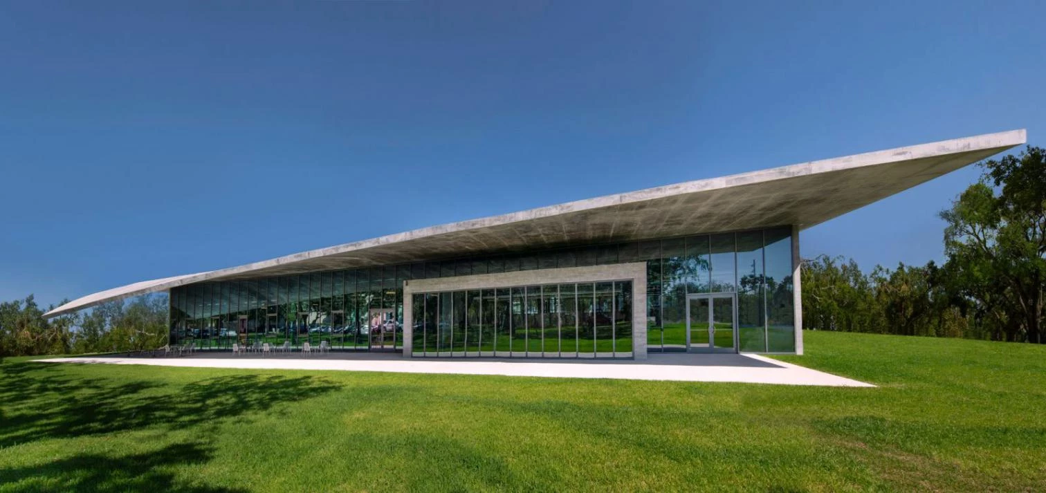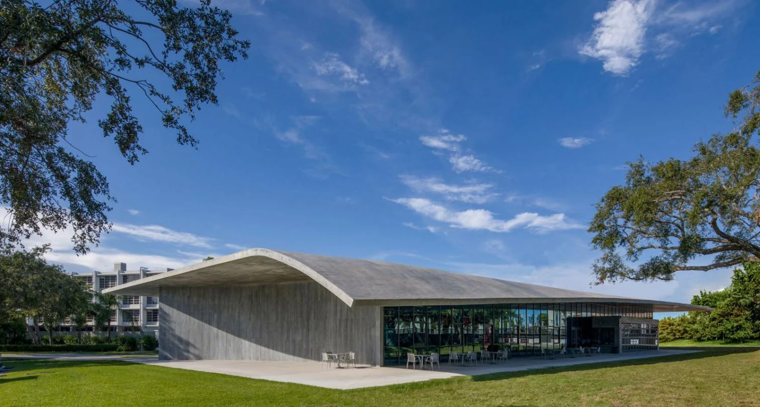 The Thomas P. Murphy Design Studio is the latest edition to the University of Miami campus in Coral Gables (Florida). For the architecture school the local firm Arquitectonica has raised this rectangular-planned, 1,858-square-meter building protected by a huge undulating roof. The structure of exposed concrete us held up by narrow steel columns and the facades present hurricane-resistant floor-to-ceiling glass panels. The diaphanous interior features curtains of a reddish fabric to delimit spaces.