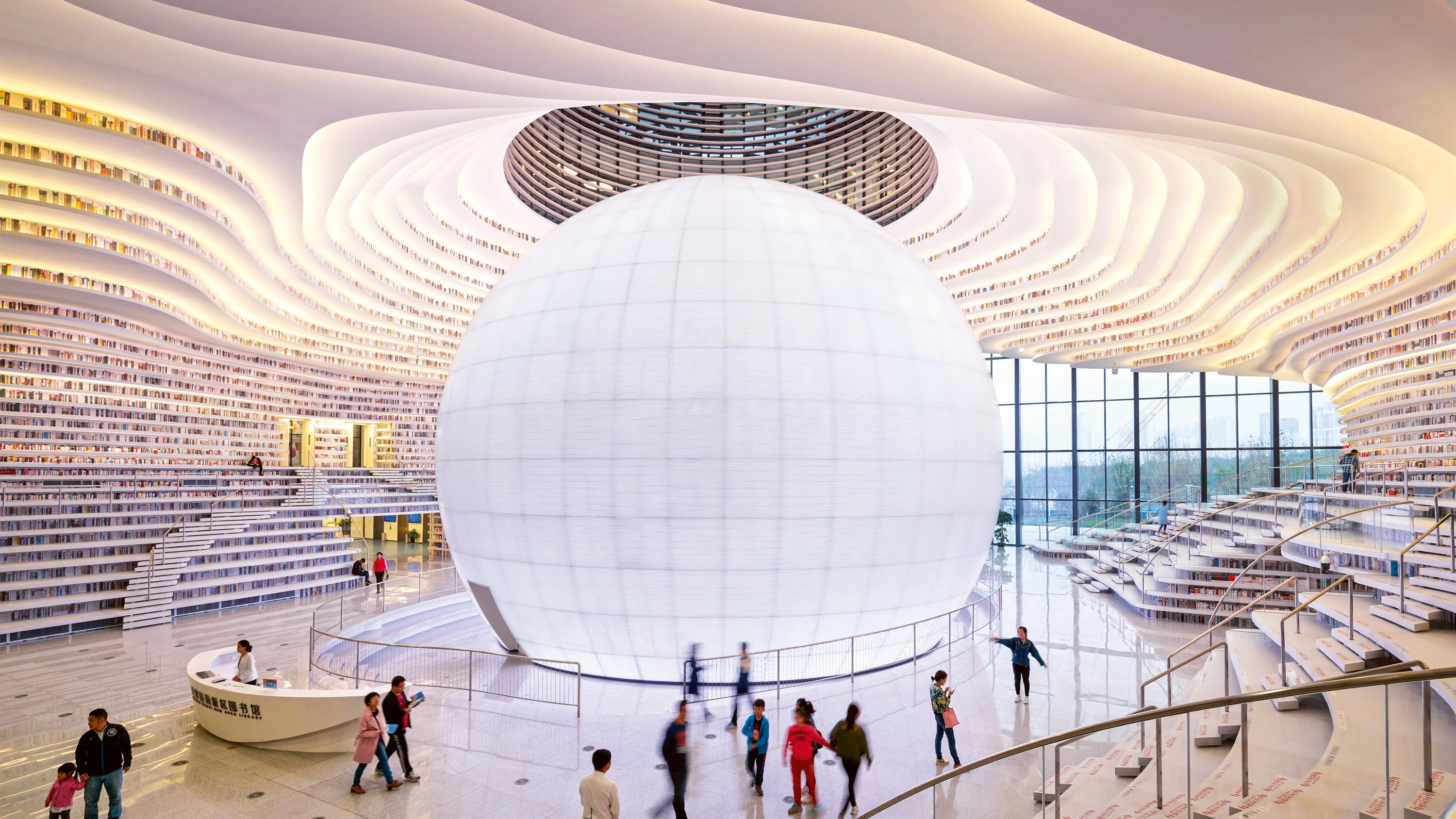 Surrounding a spherical auditorium, the main reading area presents a tapestry of curving bookshelves that cascade in terraces from the ceiling all the way down to the floor.