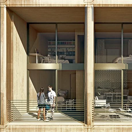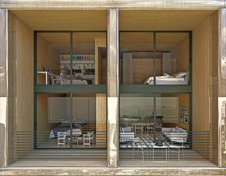 Construction wise, the challenge here was to design a building using one predominant material: wood. The structural framework designed had to address the geometric requirements of a standardized and typological system. The strategy was to use elements measuring 3.90 meters long or multiples of that basic measure, which is coherent with the sizes of the different types of apartments. The formal result of the coherence between structure and geometry is that the wooden pillars and beams define the image of the facade.