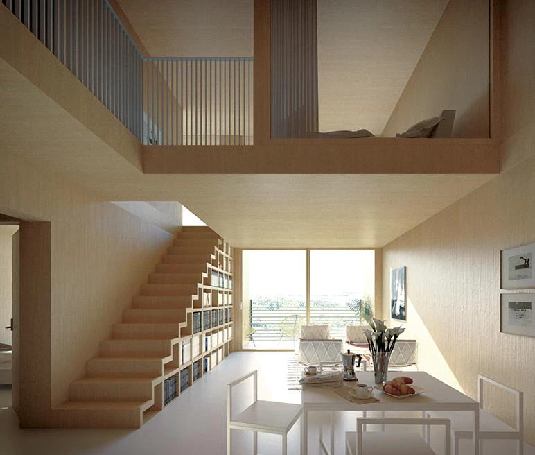 The project is conceived as an experience based on the overlapping of programs and scales, as well as on the treatment of the facades. The commercial base manages the considerable difference in elevation between the Quai d’Ivry and the ground floor accessible on Boulevard du General Jean Simon. For its part, the program for 103 apartments is set forth as an intermediate habitat that is able to combine the need for privacy and the pleasures of sociability. The void at 27 meters from the ground functions as a communal space to favor the relationship between residents, a collective space with different functions: it is a place for rest and a communal kitchen, a playground, a solarium, an art gallery, and a space for meditation. Aside from promoting contact among users, from this shared space it is possible to enjoy a panoramic view of the historic center, where the silhouettes of monuments rise above the roofs.
