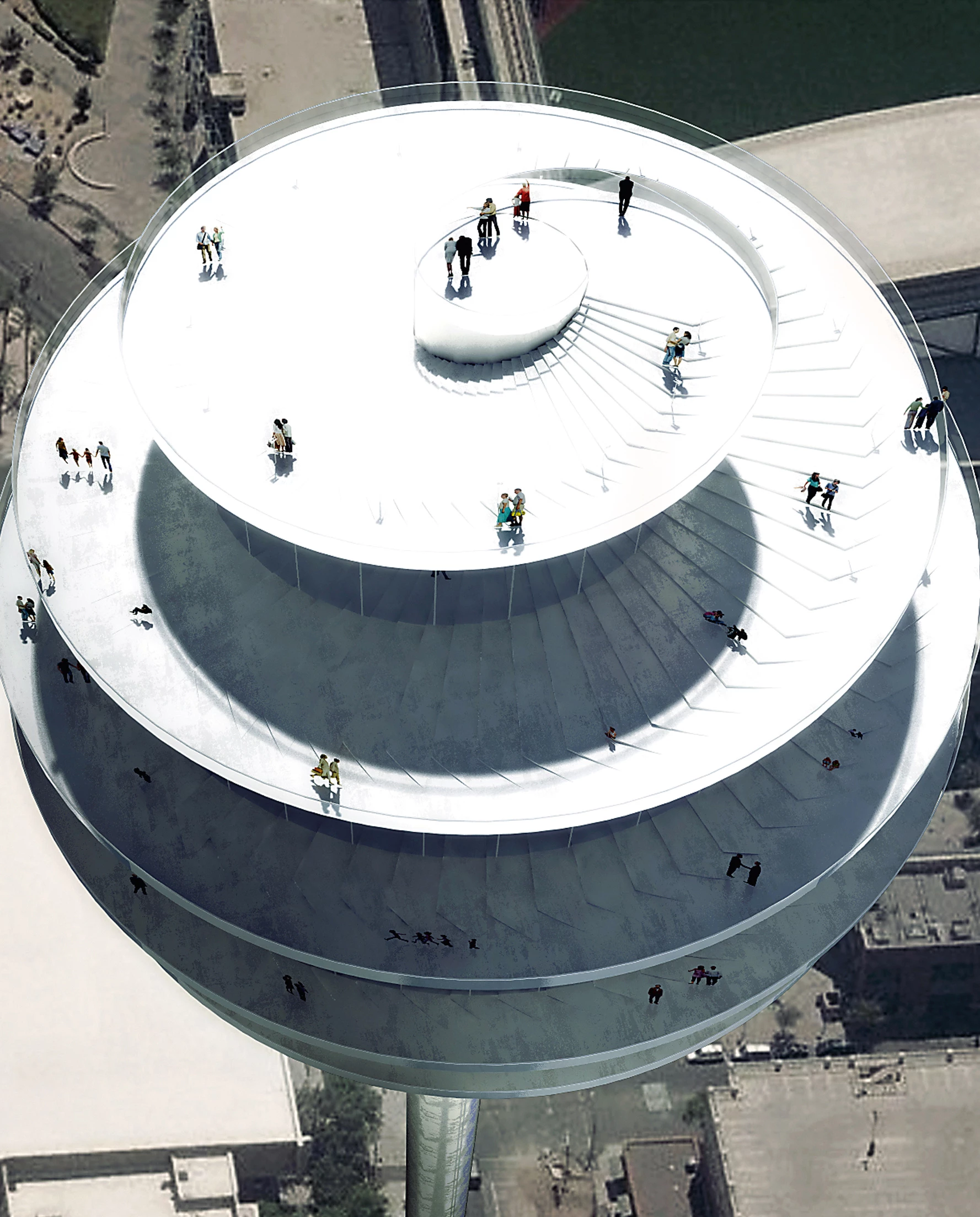 In Phoenix, Arizona, an observation tower will rise above the urban fabric as if it were a pin firmly marking a location on the map. A slender concrete base contains the vertical communications: three glass elevators that offer panoramic views of the Valley of the Sun and end in a spiral sphere where the rest of the program unfolds. Unlike other lookouts where the experience is static, here visitors walk downwards from the top through a continuous spiral promenade, experiencing all of the building’s programs in a constant motion while enjoying 360 degree views of the city and the landscape.