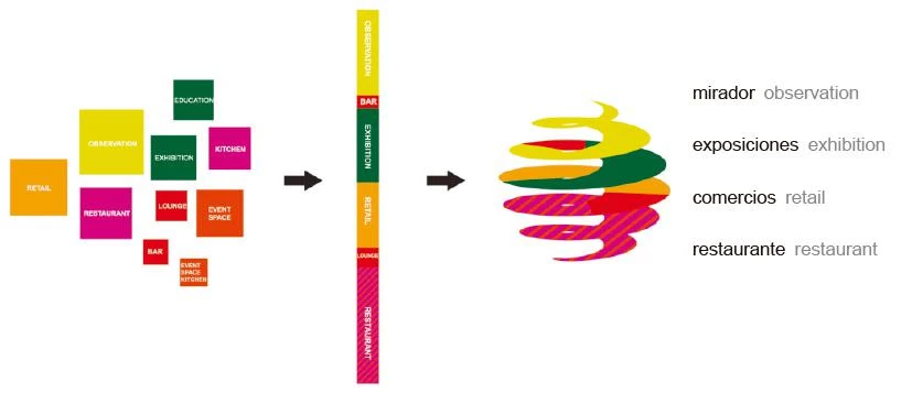 The 6,500 square meter program is organized around a promenade with a variable width and gentle slopes. There are no vertical partitions, and the changes in height separate the different program areas: restaurant, leisure, retail and exhibition areas. The base of the tower will serve as a public plaza offering shade, water features and some retail space together with a subterranean queuing area. The observation tower will become a working model of sustainable energy practices, incorportating a blend of solar and other technologies.
