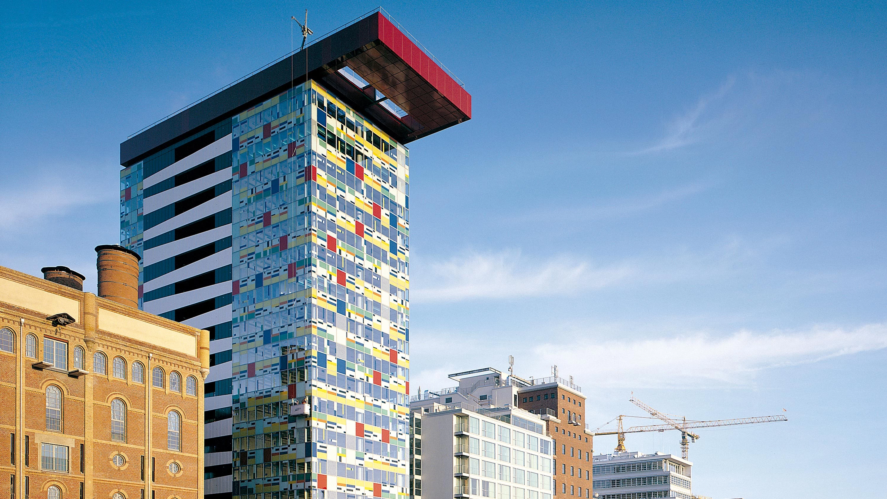 Destinado al alquiler, el edificio es de promoción privada. Situado en el sector de la Speditionstrasse, forma parte asimismo de ese vasto programa de revitalización de la zona. Su morfología —un rascacielos europeo de 62 metros de altura sobre dos plantas de sótano—se deriva directamente de lo exiguo del terreno en el que se implanta. Pero lo que podría haber acabado siendo una torre banal con despachos fácilmente modulables adquiere personalidad gracias al tratamiento de la fachada, constituida por un mosaico de paneles prefabricados de vidrio y aluminio. Hay 17 modelos de paneles diferentes, cada uno de los cuales ‘decorado’ con un motivo mondrianesco de pequeñas dimensiones pero cargado de intensidad cromática; y esmaltados según un procedimiento de fabricación del vidrio muy minucioso, en cuatro colores distintos y cocido, a una temperatura entre 650 y 700ºC, en cuatro tiempos. A continuación, los paneles se han fijado a unos raíles, transformando el edificio en un monolito artístico, una suerte de cartel vertical que es un rendido homenaje a los holandeses de De Stijl.