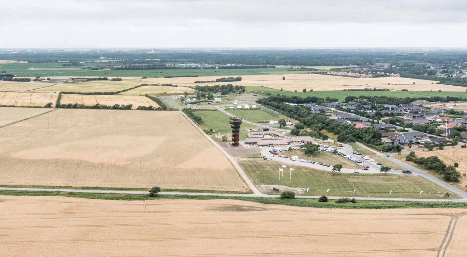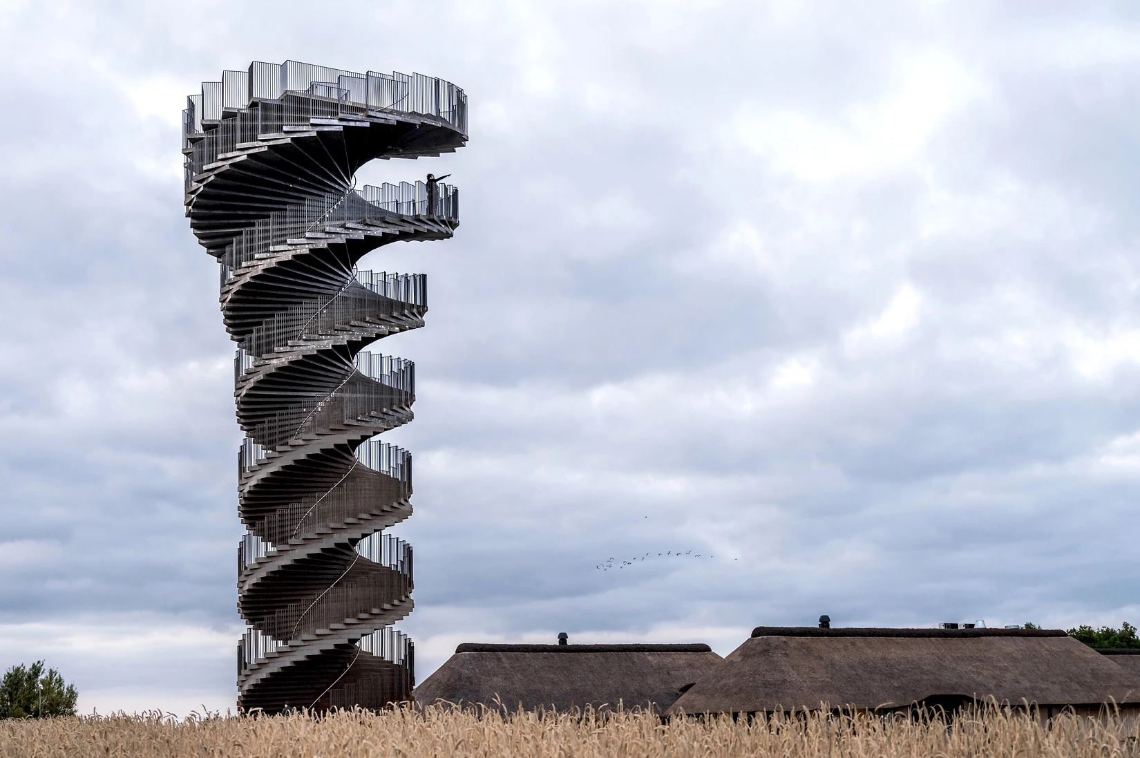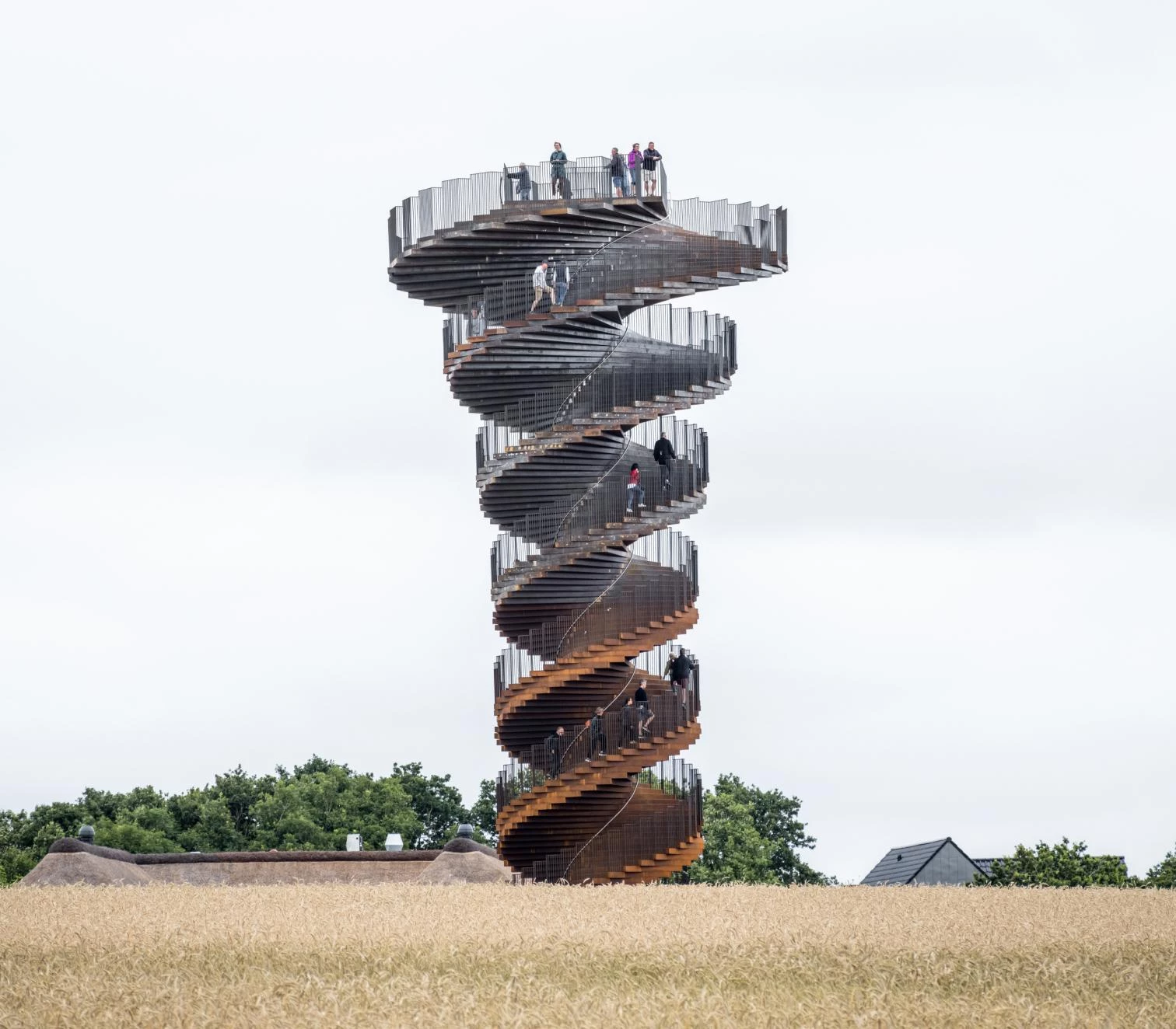 In the Wadden Sea National Park, a UNESCO World Heritage Site located to the south of the peninsula of Jutland, this sculptural observation tower stands 25 meters tall and is a tourist attraction. With an elevator tucked into the core, it was built with close to 300 tons of core-ten steel on a concrete plinth. The two strands of a DNA molecule provided the inspiration for the two flights of stairs: one for going up, with 146 steps, and the other for coming back down, with 131. Beside the Marks Camp restaurant and café, the structure shoots up from a base 7 meters wide, broadening little by little to reach 12 meters in the viewing deck on top.