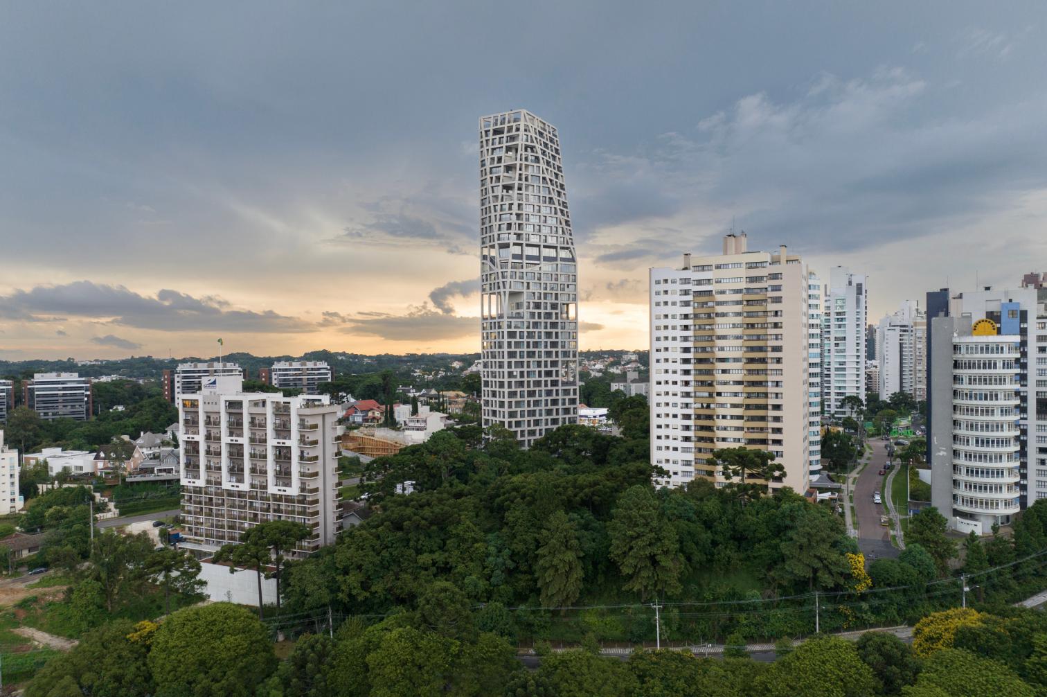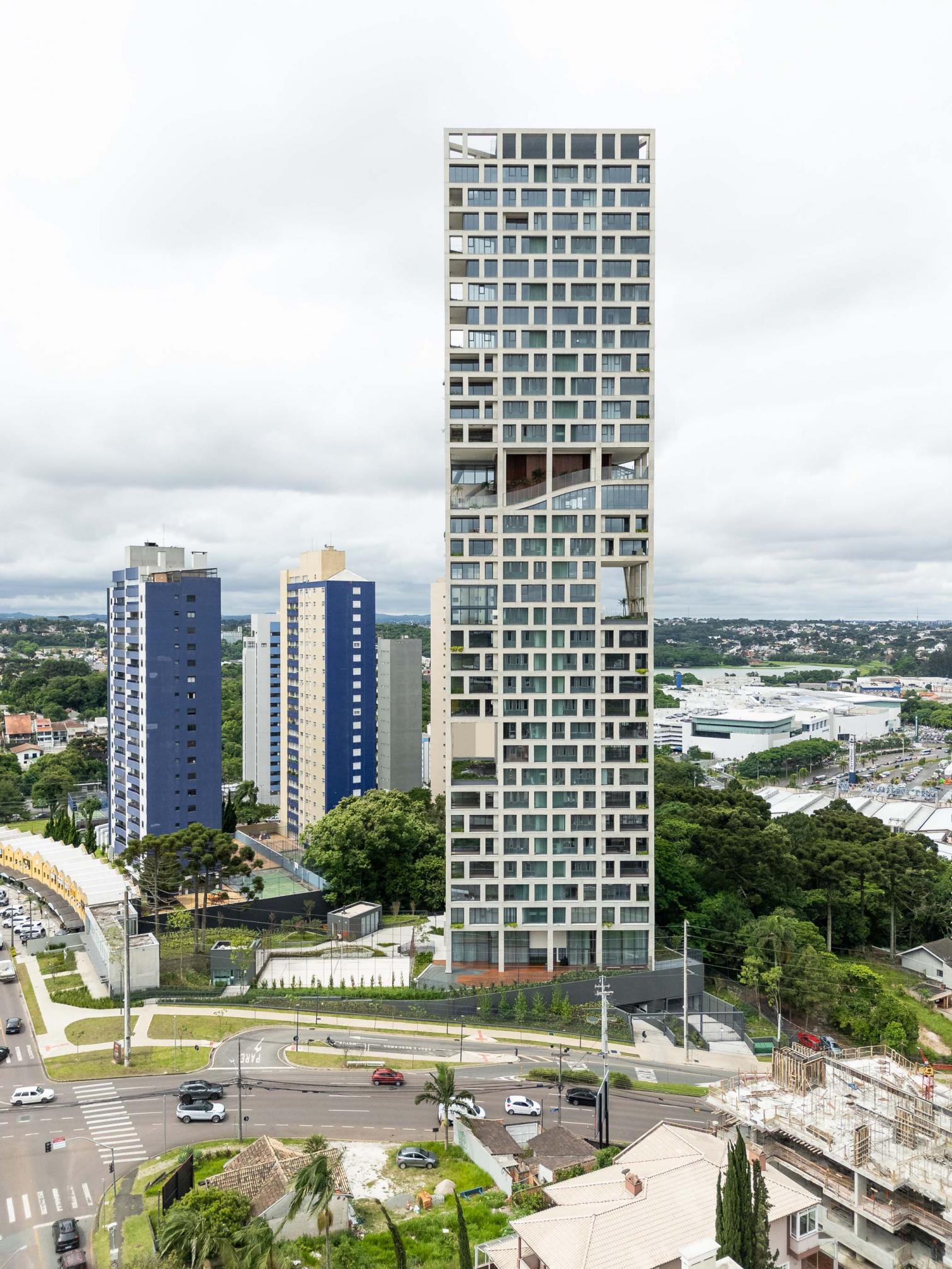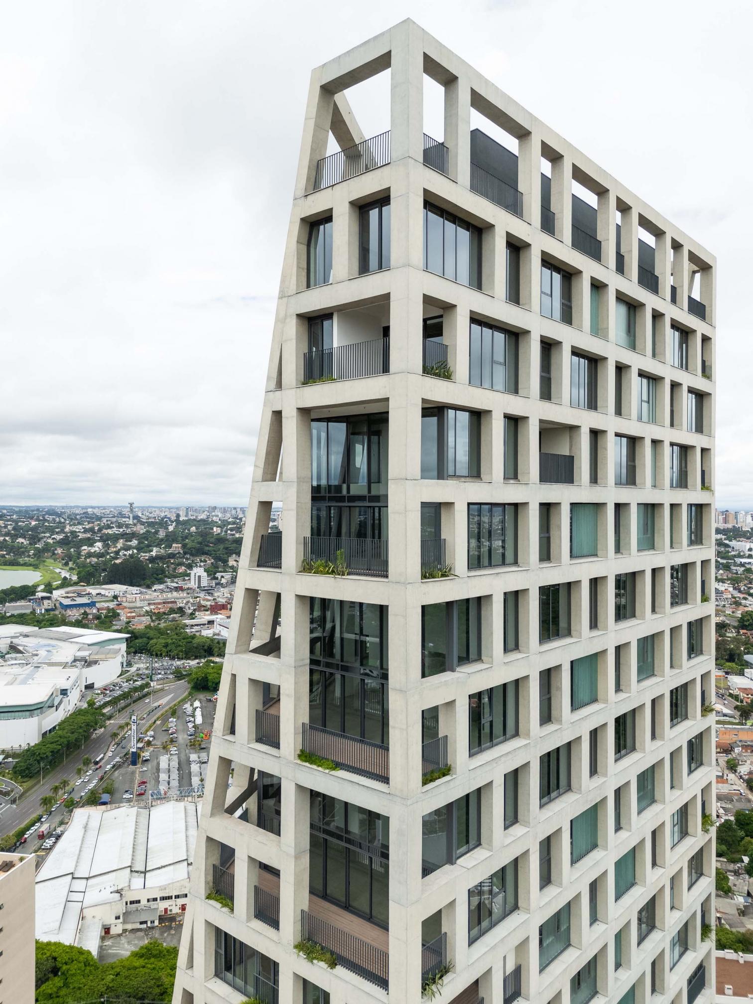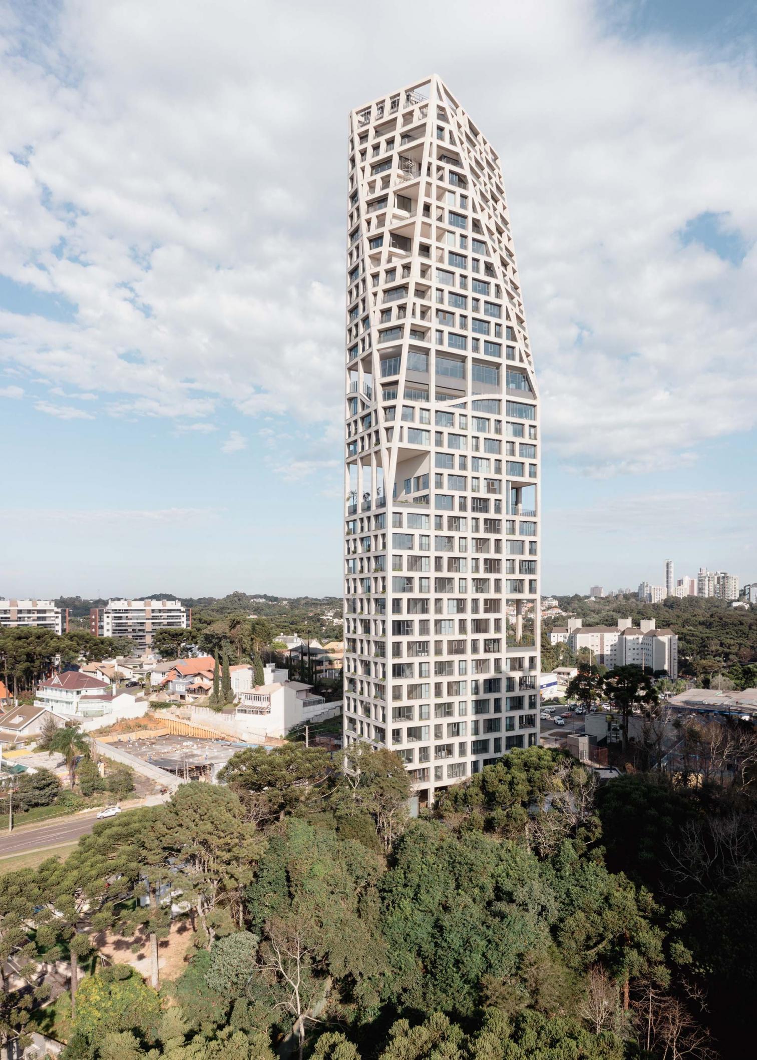 Triptyque Architects OfficeThis apartment building stands 124 meters tall, redefining the horizon of Curitiba, the capital of the Brazilian state of Paraná. Its loadbearing facade frees the interior spaces of structural constraints and ensures that layouts are reversible. Addressing local regulations, the construction presents cuts on the north and east sides. Th structural grid is interrupted to accommodate shared spaces for sports and wellness. Adapted to the irregular topography, the tower’s base establishes a direct connection to the city at ground level while creating a space dense with native plants.