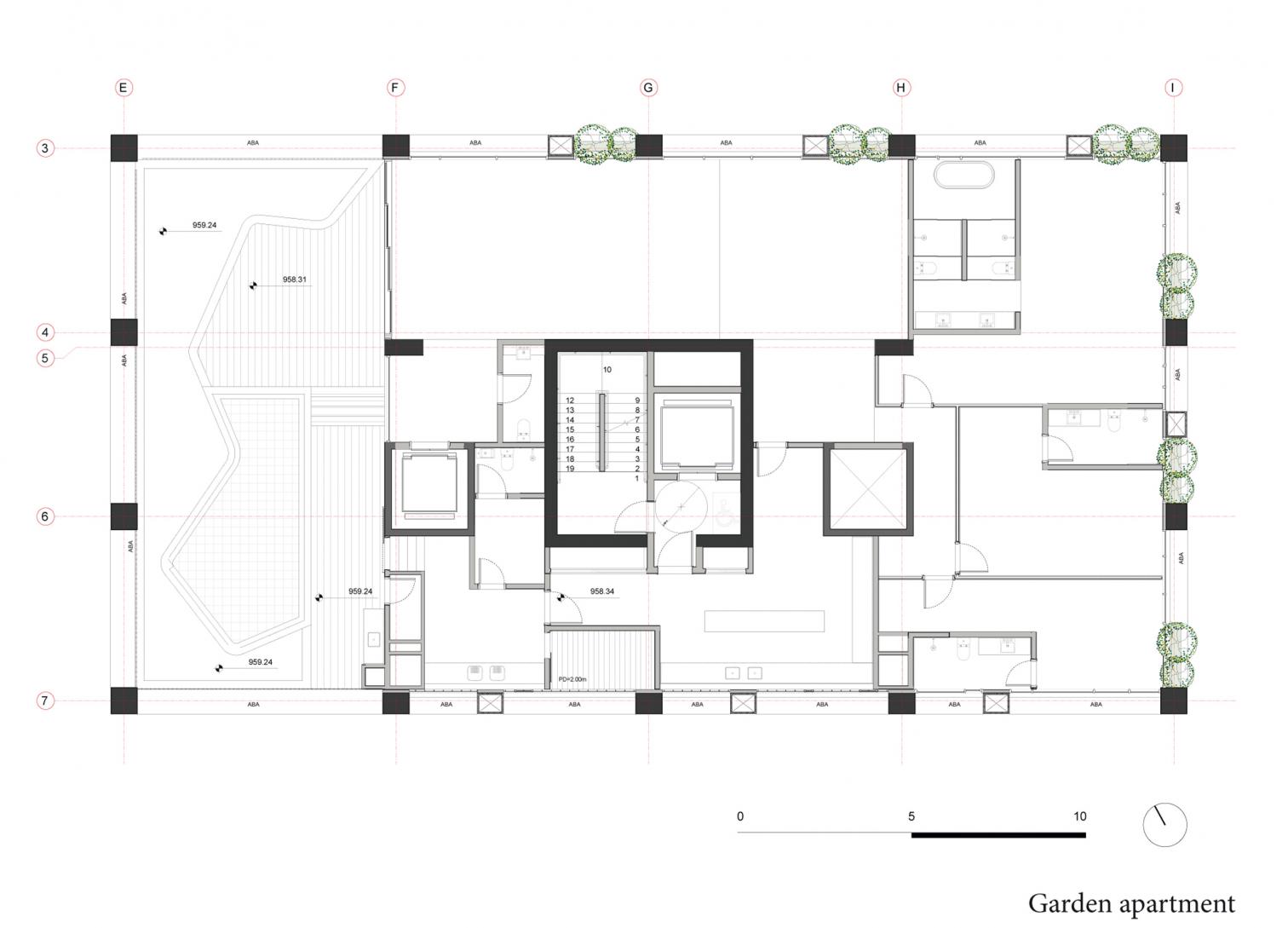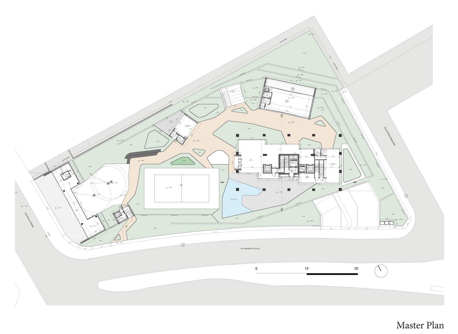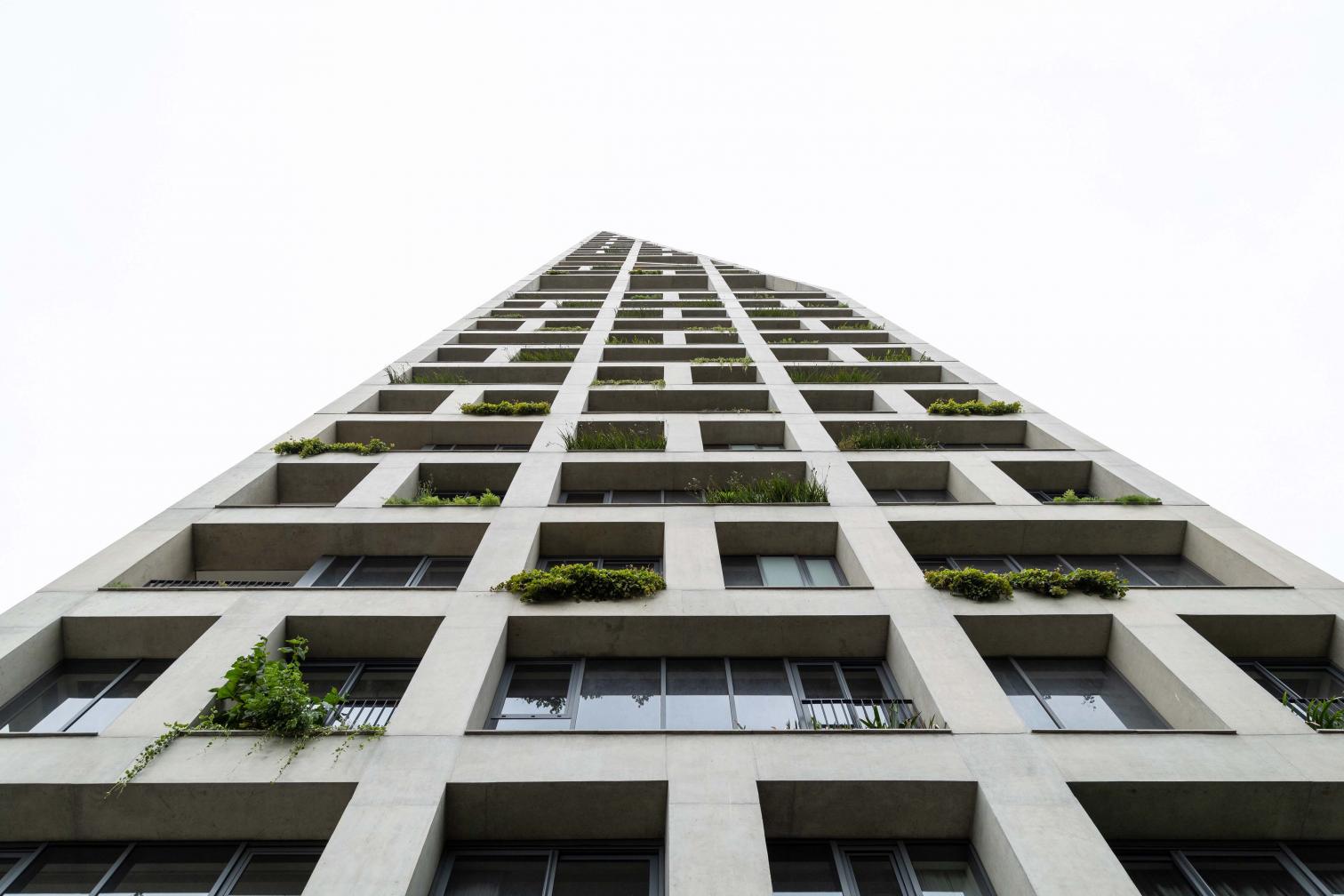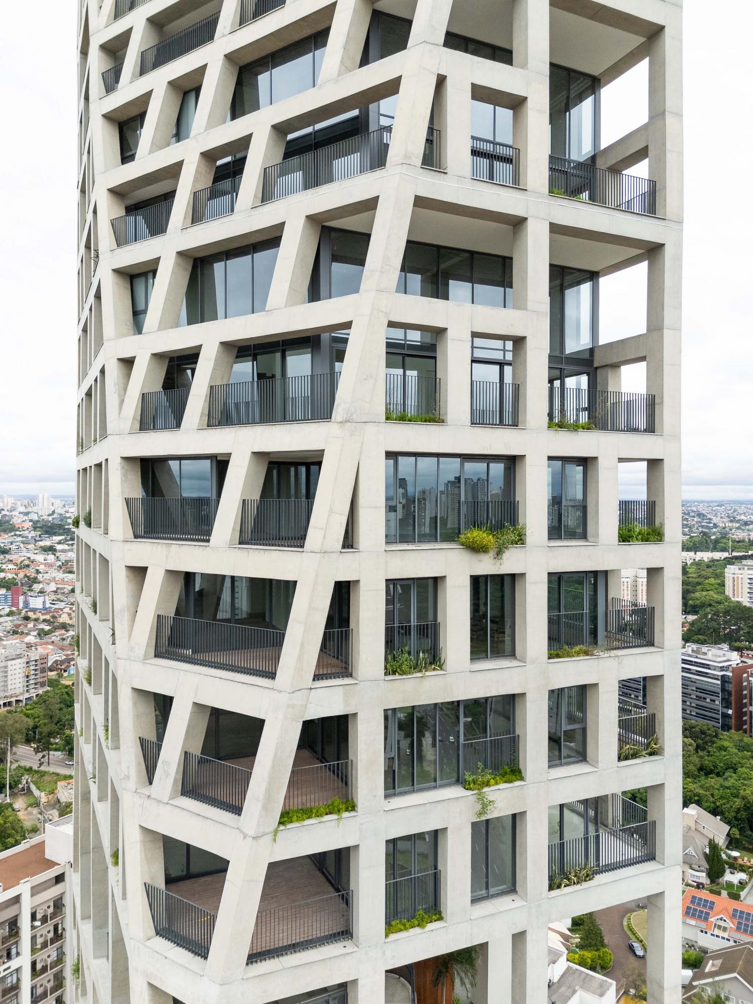 Triptyque Architects OfficeThis apartment building stands 124 meters tall, redefining the horizon of Curitiba, the capital of the Brazilian state of Paraná. Its loadbearing facade frees the interior spaces of structural constraints and ensures that layouts are reversible. Addressing local regulations, the construction presents cuts on the north and east sides. Th structural grid is interrupted to accommodate shared spaces for sports and wellness. Adapted to the irregular topography, the tower’s base establishes a direct connection to the city at ground level while creating a space dense with native plants.