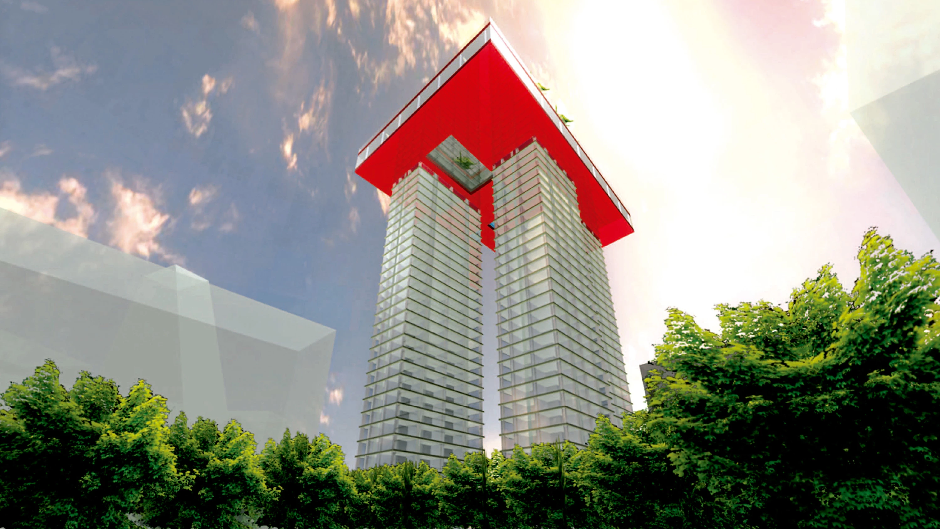 These three high-rise structures that come together at the top are part of this master plan and go up as landmarks within their natural surroundings. Being so close together allows them to perform as gigantic piers which can support the roof superstructure, that also gives the glass facades an extra protection from solar glare, and thereby more shade – something El Lissitzky probably already had in mind for his famous Cloud-hanger. The communication cores are located in the interior facades, and so from the apartments one will be able to enjoy impressive views onto the landscape... [+]