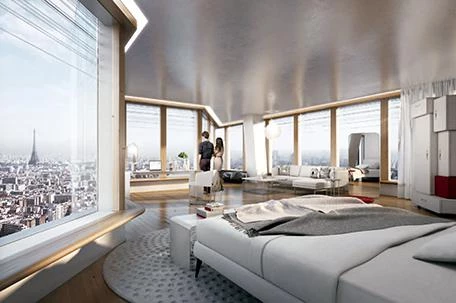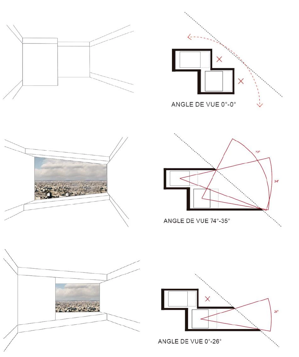 The precise calibration of the volume of Triangle allows the building’s insertion into the city fabric, limiting its impact on the environment. Its triangular shape serves two purposes: it preserves generous views of the sky for the residents and, like a sundial, it reduces the casting of shadows onto the neighboring buildings. Triangle is conceived as a piece of the city that could be pivoted and positioned vertically. For the visitor, the project is first experienced from the square of the Porte de Versailles, where the public transportation networks converge. The base of the building is open to all, from the square of the Porte de Versailles and along the avenue Ernest Renan, which will regain the appearance of a Parisian street with shops and restaurants. The north-east vertical axis of Triangle, facing the center of Paris, holds two inclined elevators that link the atrium at street level to a panoramic restaurant in the higher levels of Triangle. From there, visitors will be able to go on to the highest levels of Triangle, up to a belvedere from which the entire metropolis can be discovered.
