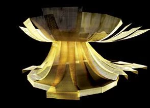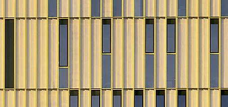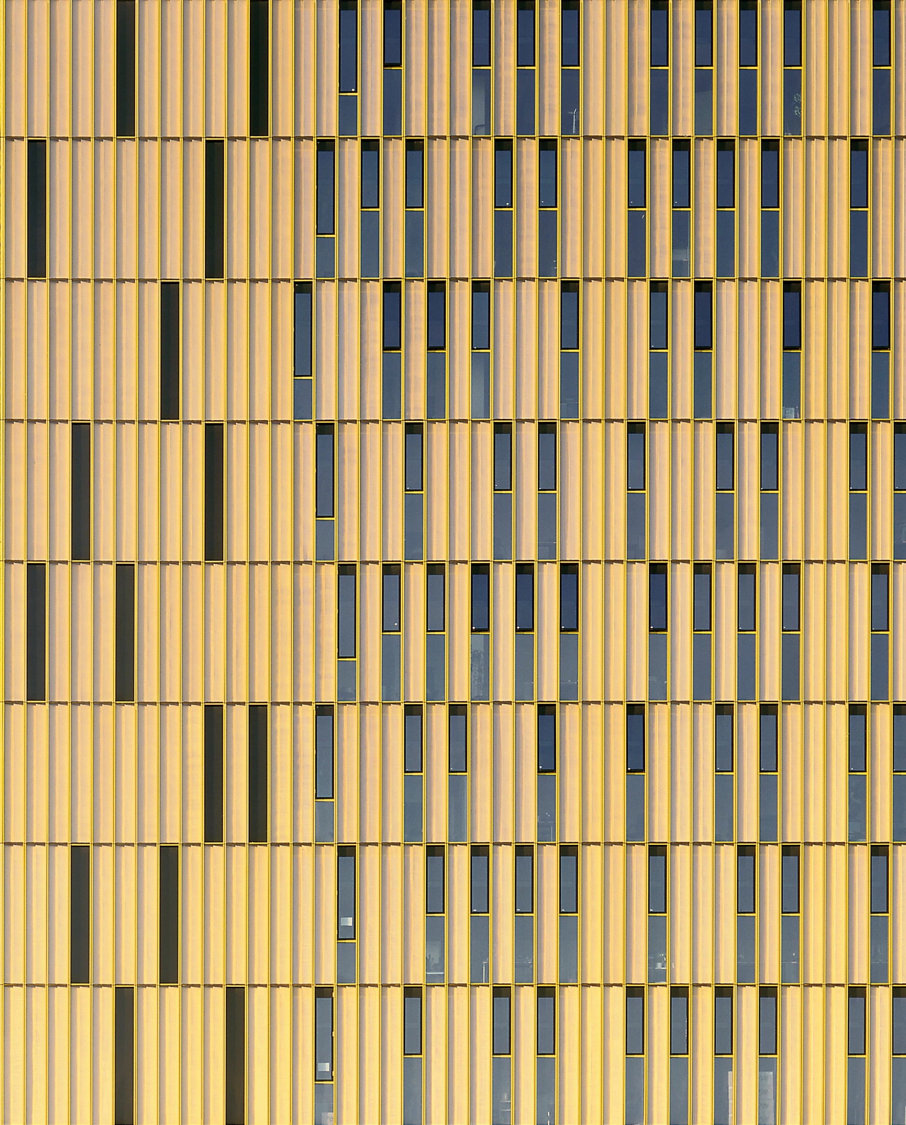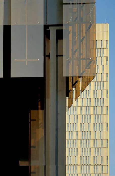 The intervention is not conceived just as a new addition – the fourth element of an existing set of three – but an ‘injection’ that proclaims the primacy of linking over juxtaposition, and of unification over densification. A unity that proceeds notably from the use of an anodized aluminum mesh, between brass and bronze, handled in ‘sun-fold’ for the two towers and in long ‘skirts’ for the judges’ building, where it falls from the golden crown down to the base.