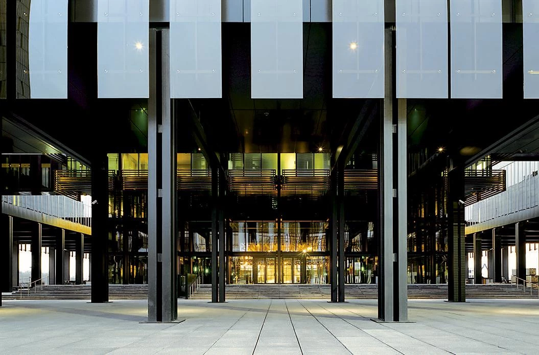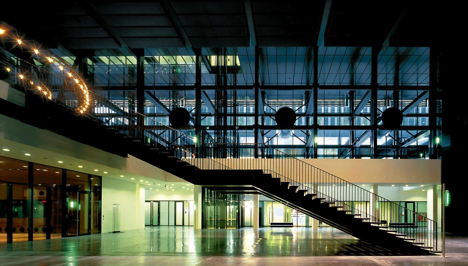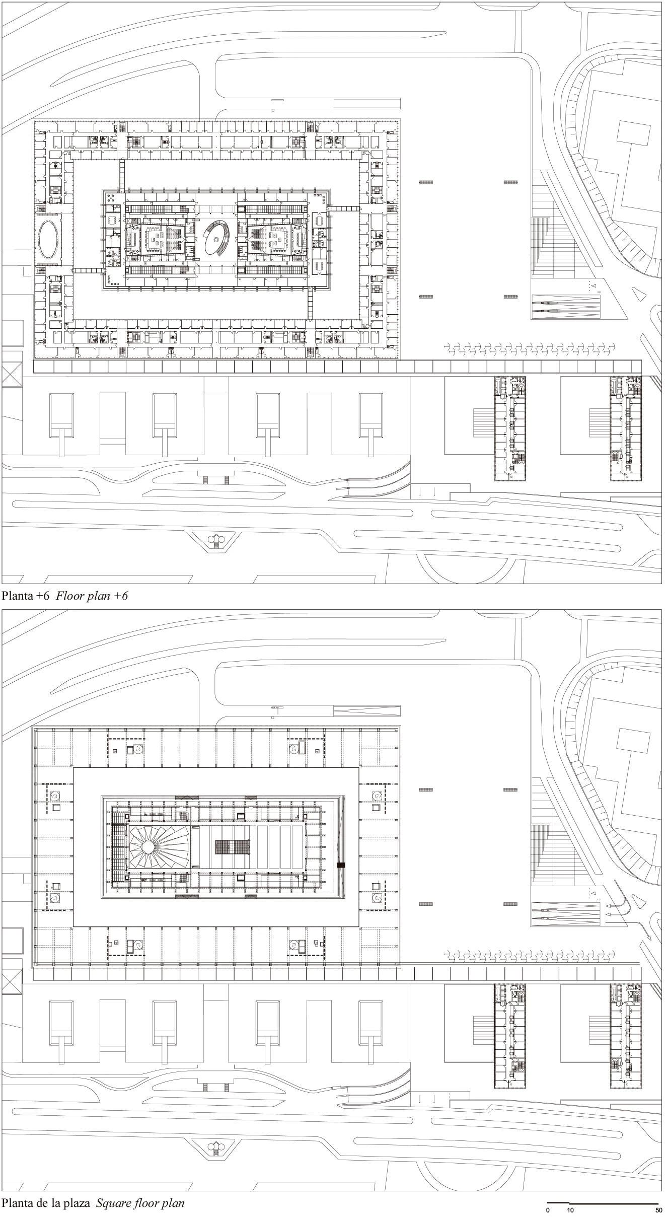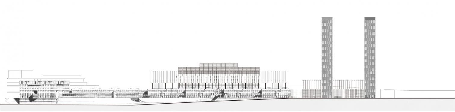 Then, in the main court building the hearing rooms articulate around a monumental stair. Next came the laying out of a spacious forecourt to the north, in order to create a main access point for pedestrians and automobiles, via a large porch under the crown to the hearing rooms. This sequence of public spaces is protected from wind and weather, but preserves the views, which reach the exterior, the city and the forest. Last up is the construction of two towers destined to house the thousands of civil servants that keep the Court running.
