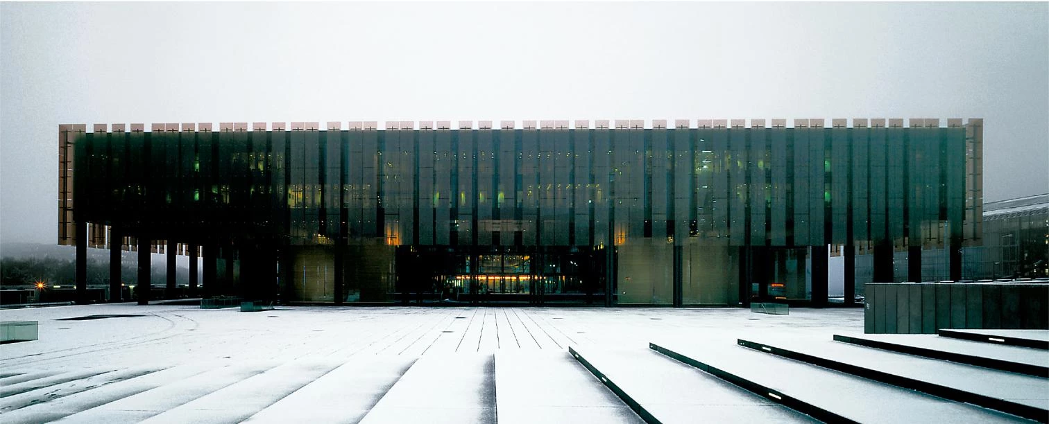 The brief entailed unifying and extending a set of three existing buildings, the oldest of which was raised in 1973, with others dating from extensions carried out in 1988 and 1992. On the seven-hectare site flanked by main roads, these successive interventions have formed a disparate and scattered set, obeying different scenographies and done in styles that very nearly clash. Besides federating and enlarging, Perrault’s task consisted foremost in reasserting the prestige of the Court complex, by focusing attention on it and diffusing its concentrated energy in a crown that extends the most significant levels of the original core.