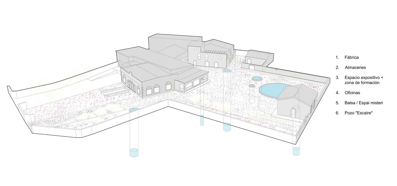 The Aigües de Vilajuïga complex cannot be understood without the presence of underground water: a carbonate rock aquifer that keeps flowing since 1904. The wells and structures dotting the terrain are a reflection of this underground world, but how can we show clearly what happens below ground?